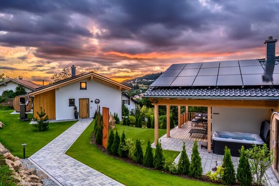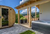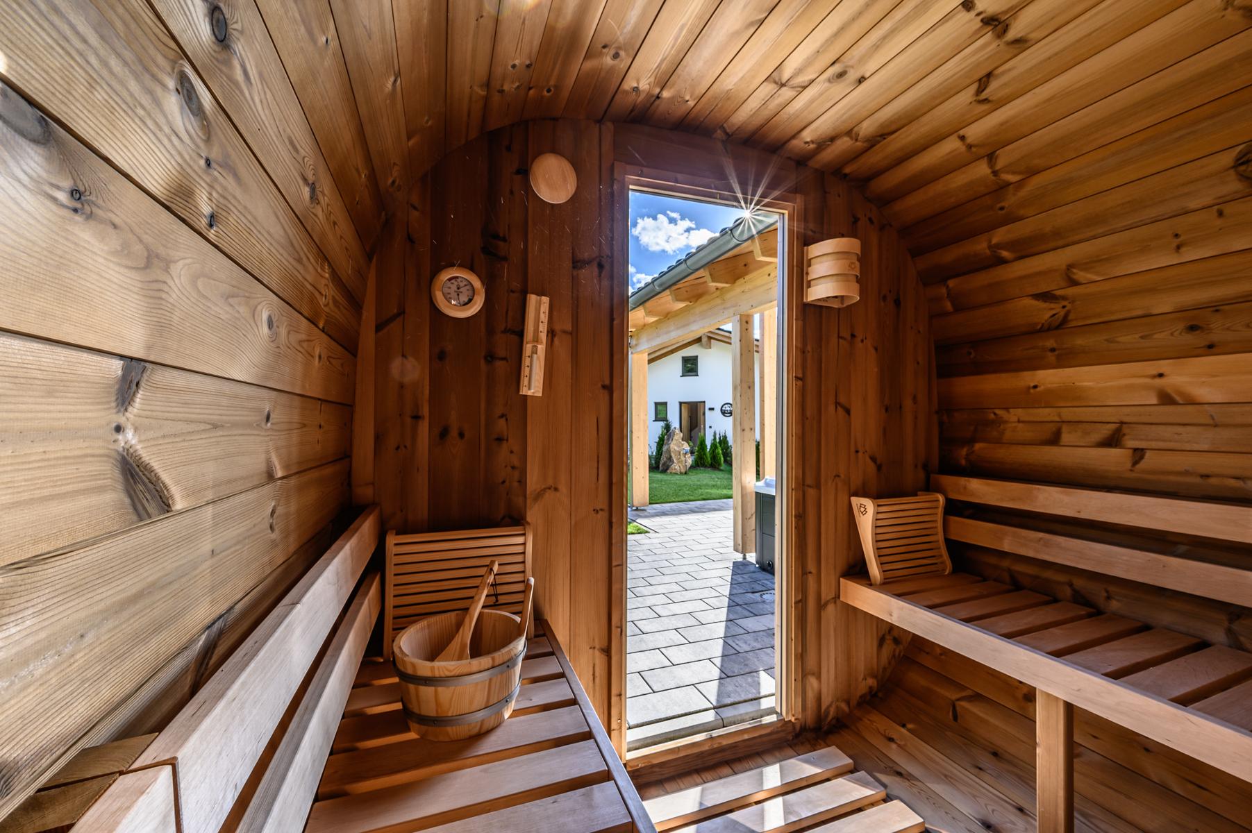 Unsere besonderen Highlights sind die jeweils eigene Fass-Sauna im Garten, ein Whirlpool zum Entspannen und der jeweils große Panorama-Balkon mit Lounge-Möbeln.