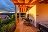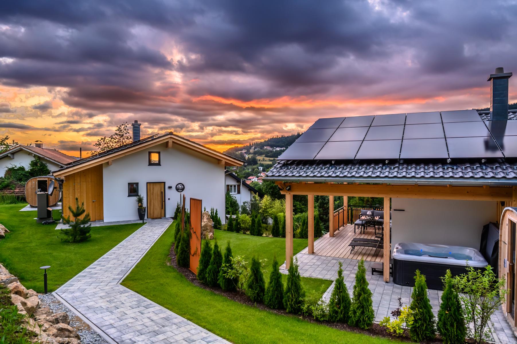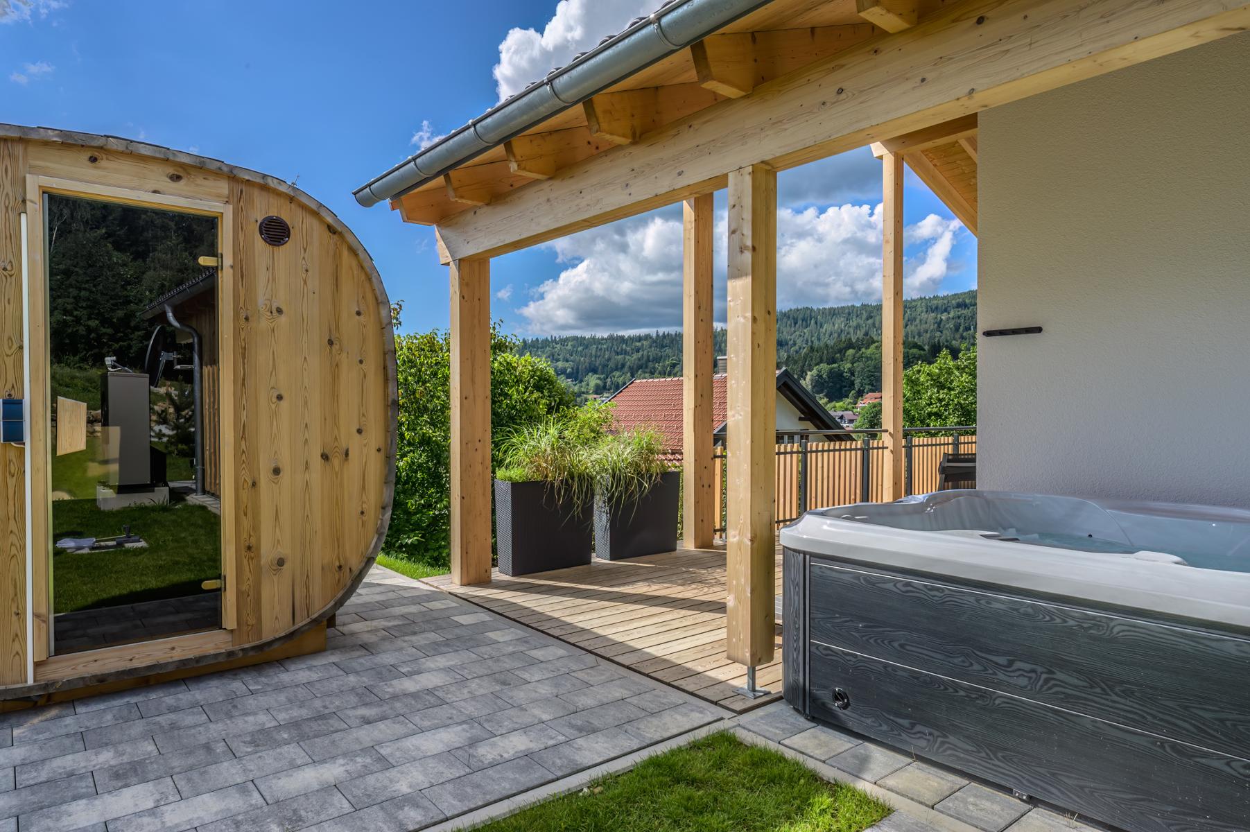 Unsere besonderen Highlights sind die jeweils eigene Fass-Sauna im Garten, ein Whirlpool zum Entspannen und der jeweils große Panorama-Balkon mit Lounge-Möbeln.