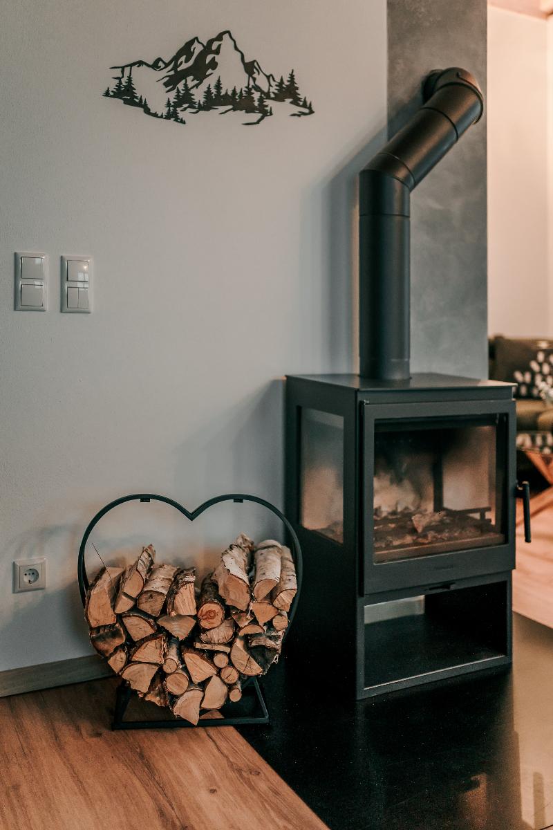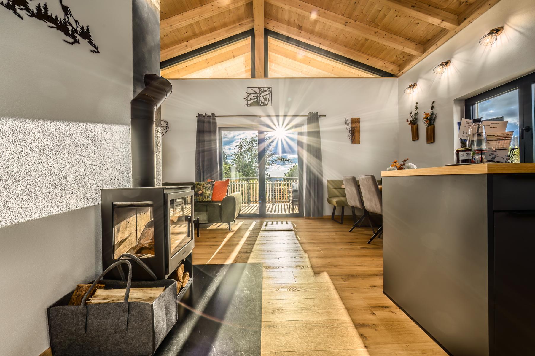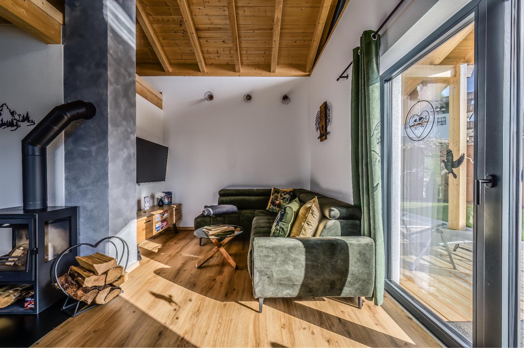 Der offene Wohn-Ess-Bereich ist das Herzstück des Chalets. Das Wohnzimmer ist hell mit einem schönen Kamin und einer großen Couch sowie Smart-TV ausgestattet. Im Essbereich befindet sich eine gemütliche und große Eckbank mit einem schönen Holztisch. Hier ist genug Platz für Gespräche, Spiele, und auch mal die Arbeit am PC kann hier in Ruhe erledigt werden.