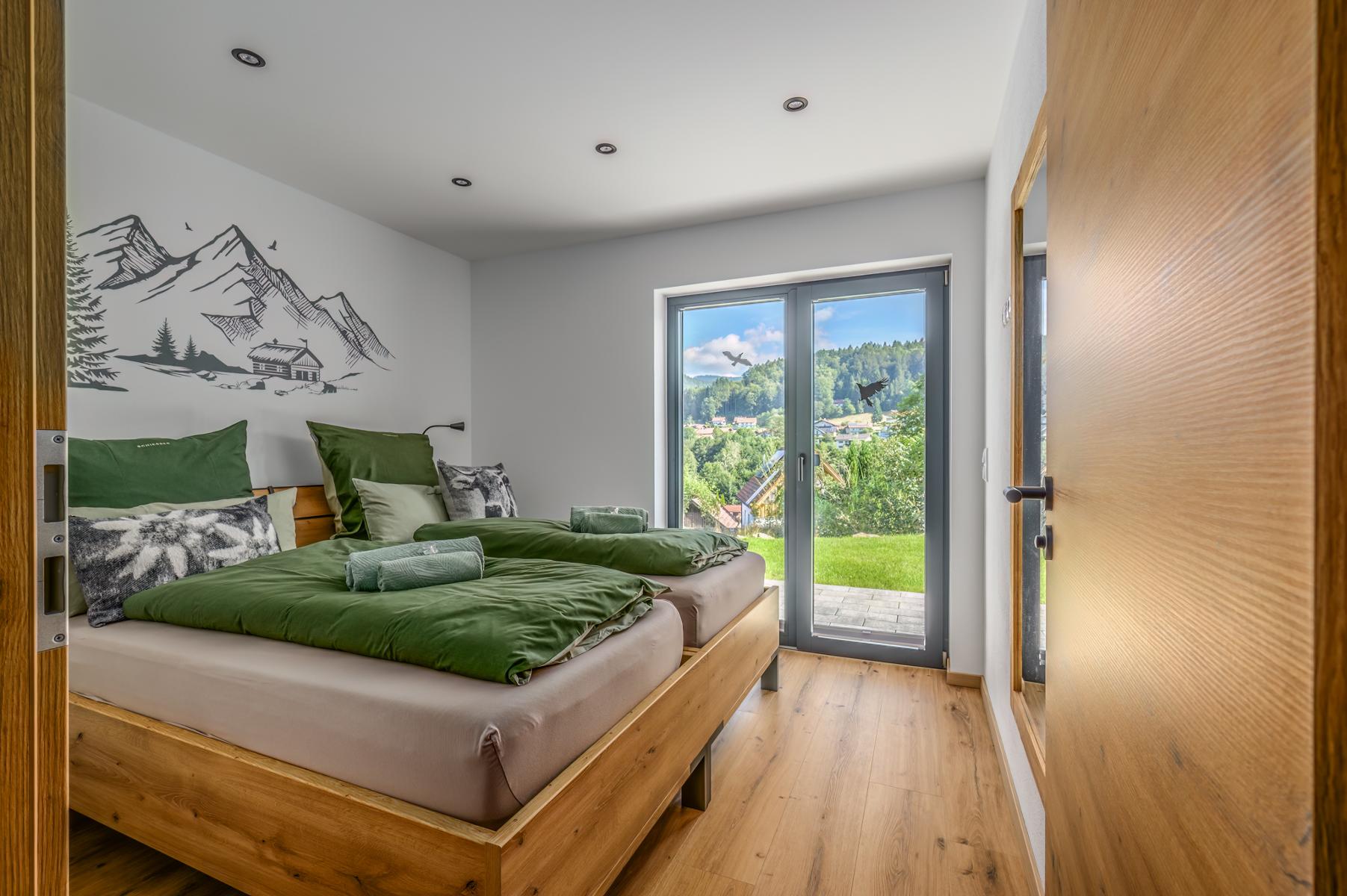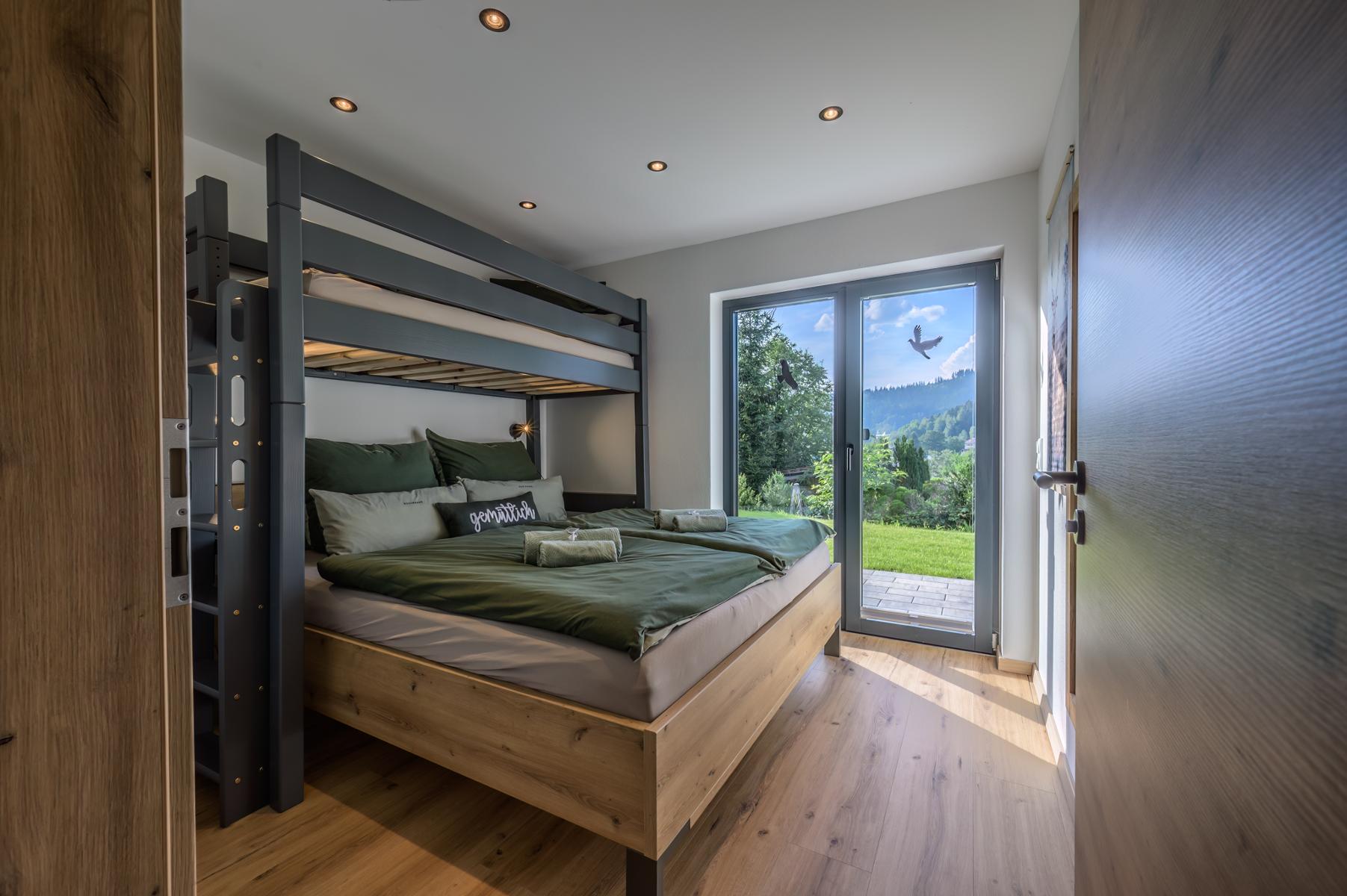 Es stehen pro Haus zwei Schlafzimmer zur Verfügung: ein Schlafzimmer mit großem Doppelbett und Smart-TV und einem weiteren Schlafzimmer mit einem weiteren Doppelbett 180x200 cm sowie einem Hochbett. Das Chalet WoidGlück bietet Platz für 5 Personen. Auch für ein Kleinkind/Baby ist bei uns immer Platz.