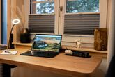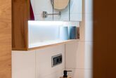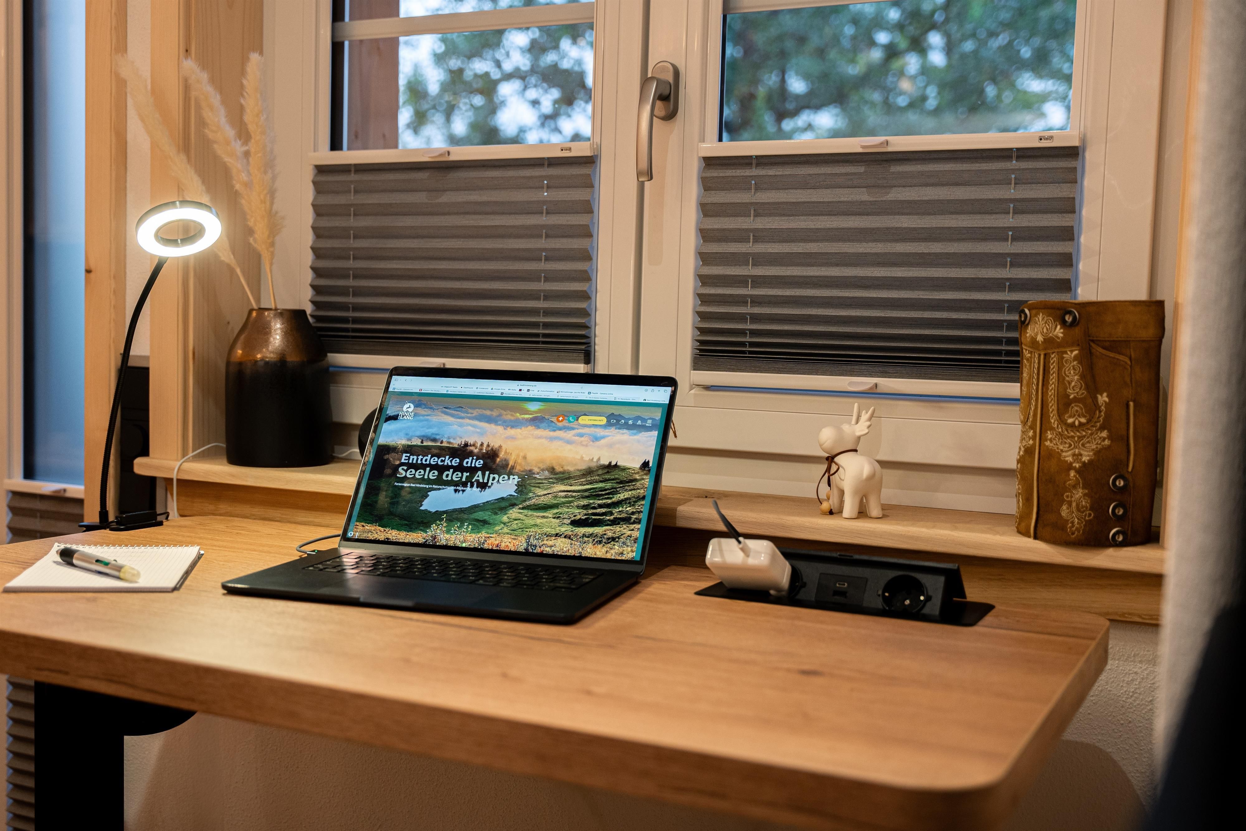 Das Bad mit Regendusche, WC und Fußbodenheizung bietet Komfort, während der höhenverstellbare Schreibtisch flexibles Arbeiten ermöglicht.