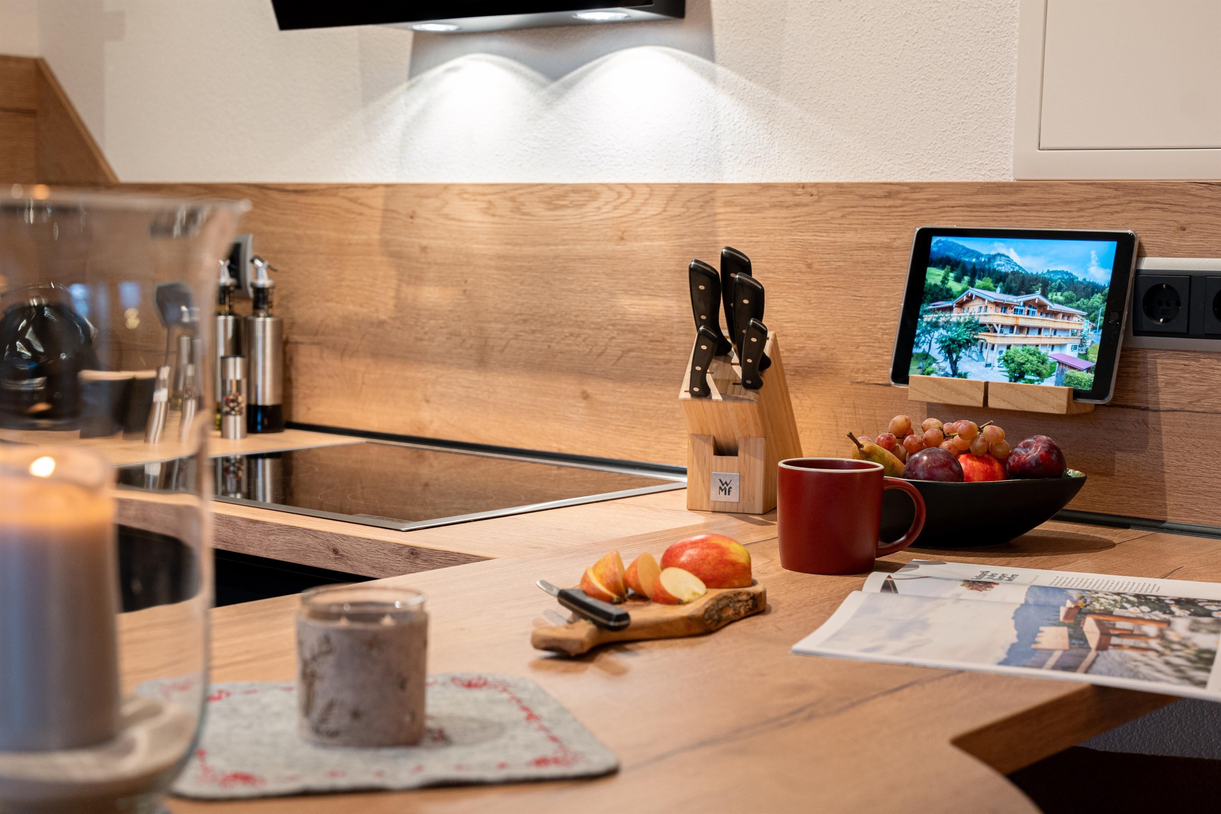 Die Küche ist hochmodern und detailverliebt ausgestattet. Zahlreiche Extras wie Spülmaschinentabs und vieles mehr erleichtern den Urlaubsstart.