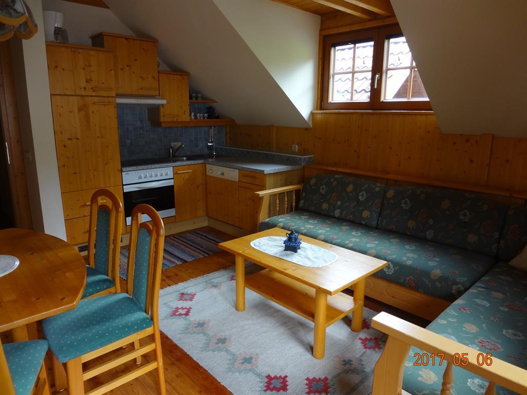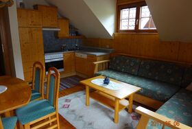 Ferienwohnung mit 57 m², Wohnküche mit Essecke, Schlafbereich für vier Personen, Doppelcouch (im Küchenbereich) separates Doppelzimmer, Bad mit Badewanne, WC, Sat TV, W-Lan, Balkon