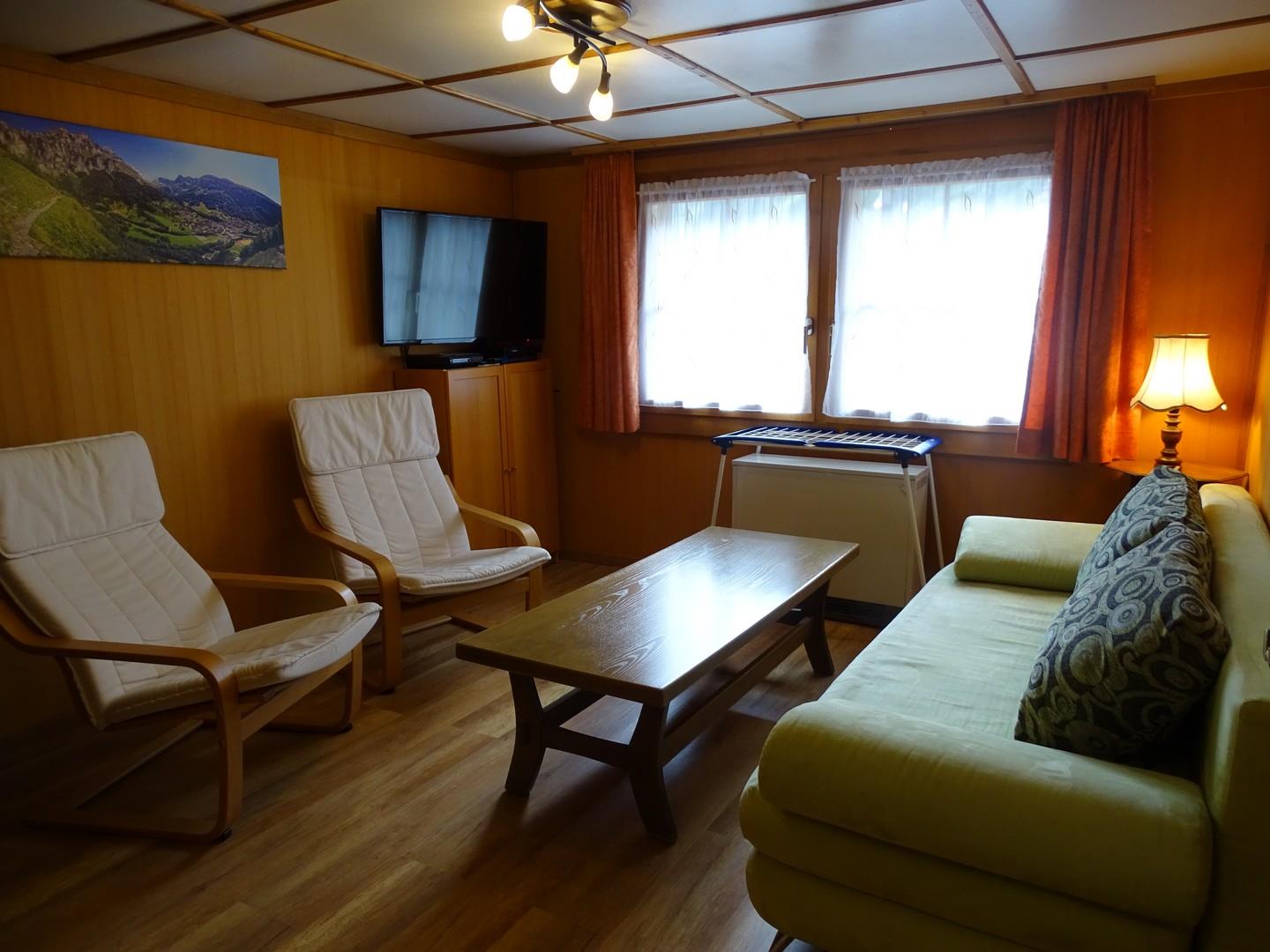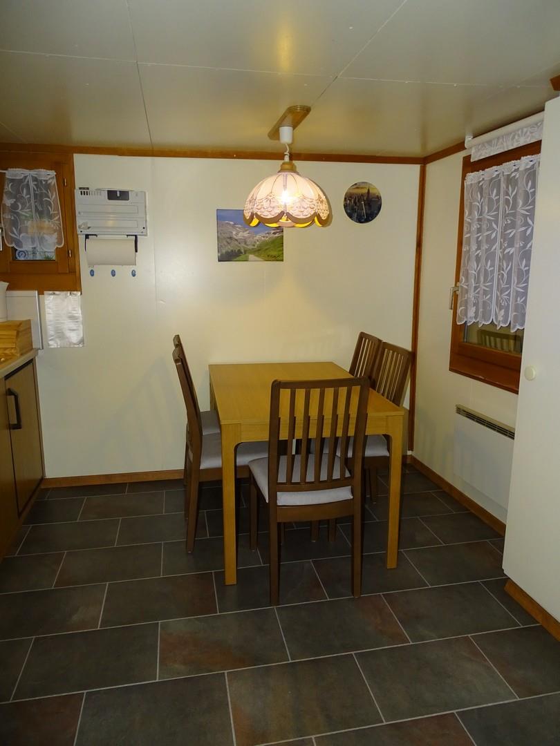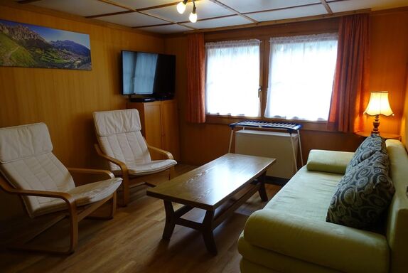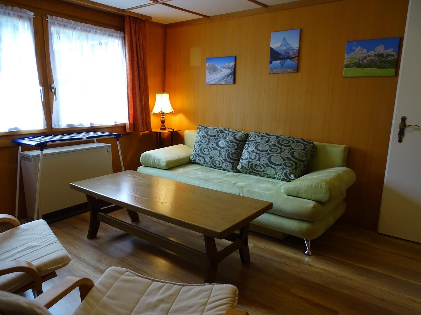 3-Zimmerwohnung in einem Chalet: Wohnzimmer, separate Küche mit Nespresso Kaffee-Machine, 1 Schlafzimmer mit 2 Betten, 1 Schlafzimmer mit 1 Etagenbett und 1 Einzelbett, gratis WiFi, TV, DVD, Radio, Playstation 2, Dusche-WC, grosse Terrasse Richtung Nord-West. In nächster Nähe: Sportzentrum Sportarena, Snowpark Sporterena, Gemmi-Bahnen, Bushaltestelle Ring-Jet, Lebensmittelgeschäfte.