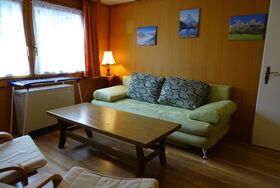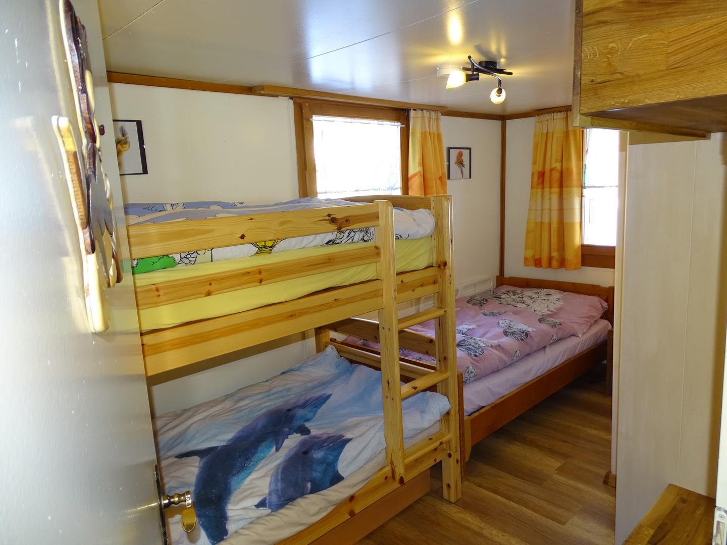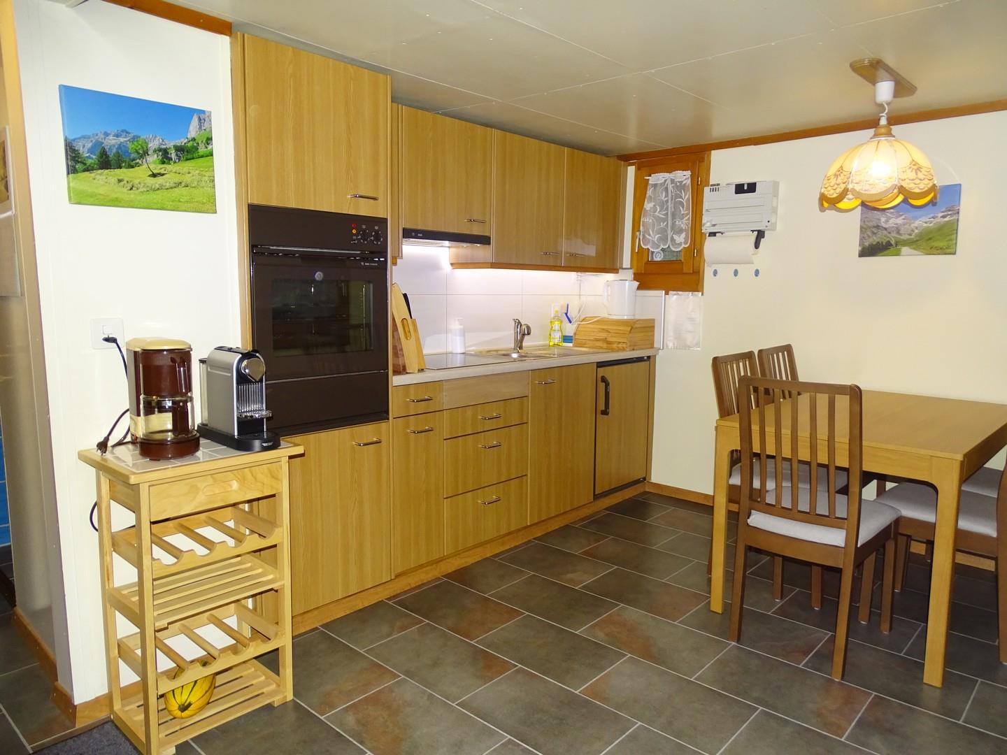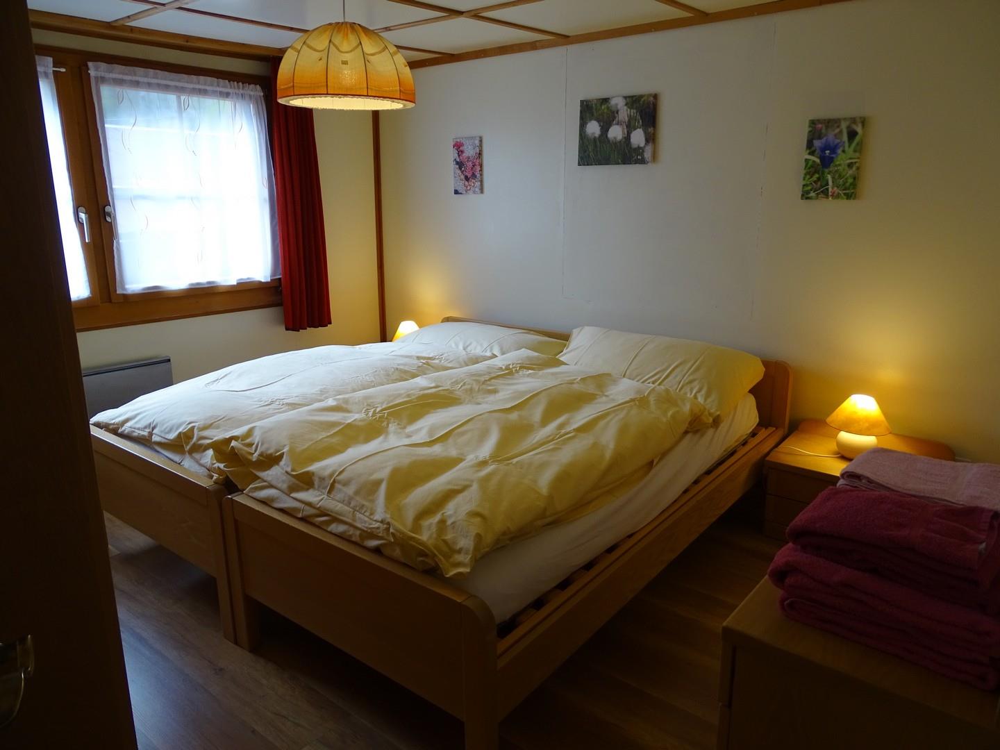 3-Zimmerwohnung in einem Chalet: Wohnzimmer, separate Küche mit Nespresso Kaffee-Machine, 1 Schlafzimmer mit 2 Betten, 1 Schlafzimmer mit 1 Etagenbett und 1 Einzelbett, gratis WiFi, TV, DVD, Radio, Playstation 2, Dusche-WC, grosse Terrasse Richtung Nord-West. In nächster Nähe: Sportzentrum Sportarena, Snowpark Sporterena, Gemmi-Bahnen, Bushaltestelle Ring-Jet, Lebensmittelgeschäfte.