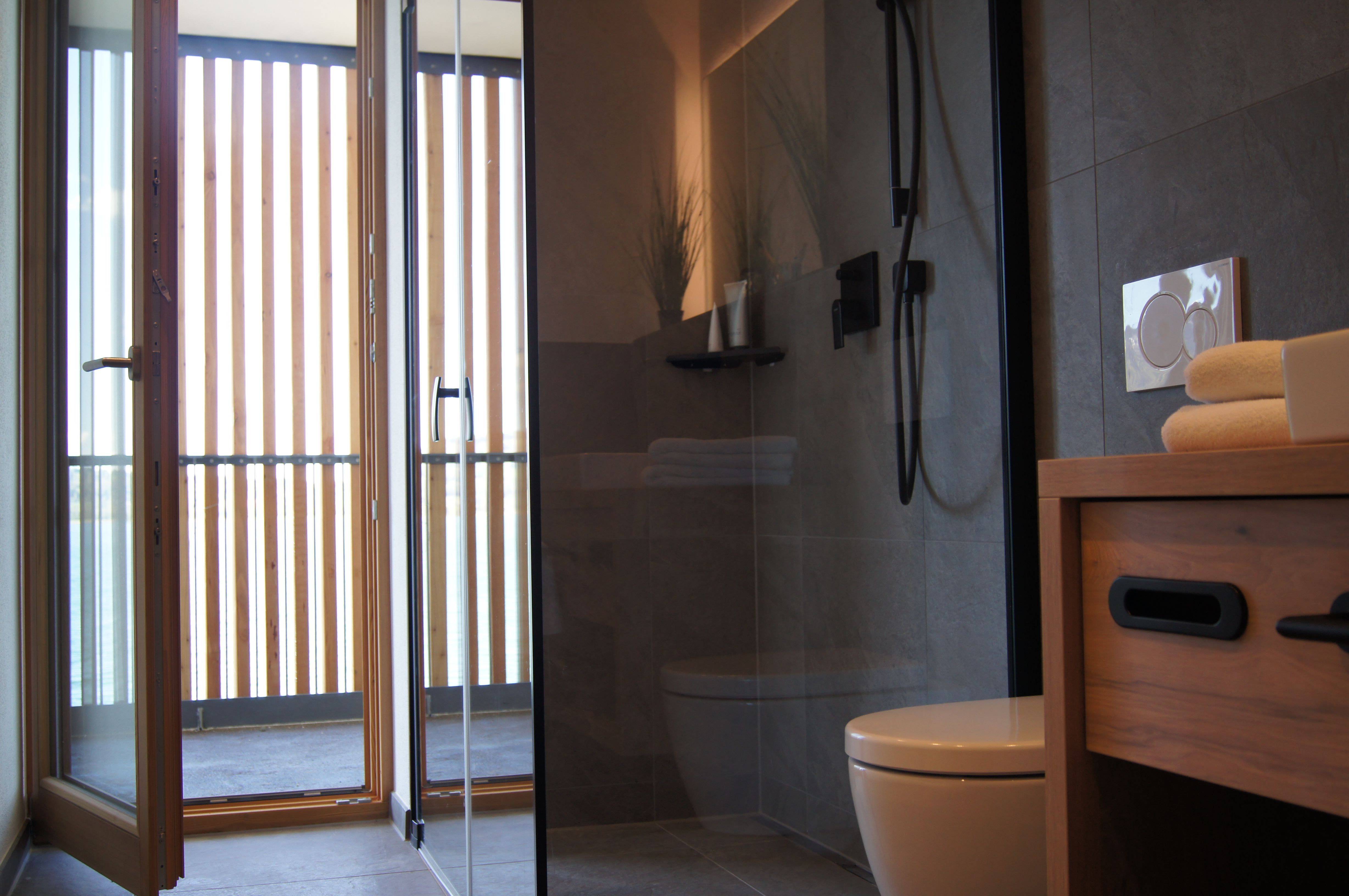 In das separate Schlafzimmer mit großem King-size Doppelbett (2x2 m) und (auch) Seeblick, ist ein großer Schrank eingebaut in dem auch ein kleiner Arbeitsplatz integriert ist (Thema „Workation“). Das Badzimmer mit Fußbodenheizung und begehbaren Dusche verfügt über einen direkten Zugang zum Balkon auf dem sich die kleine private Sauna befindet.