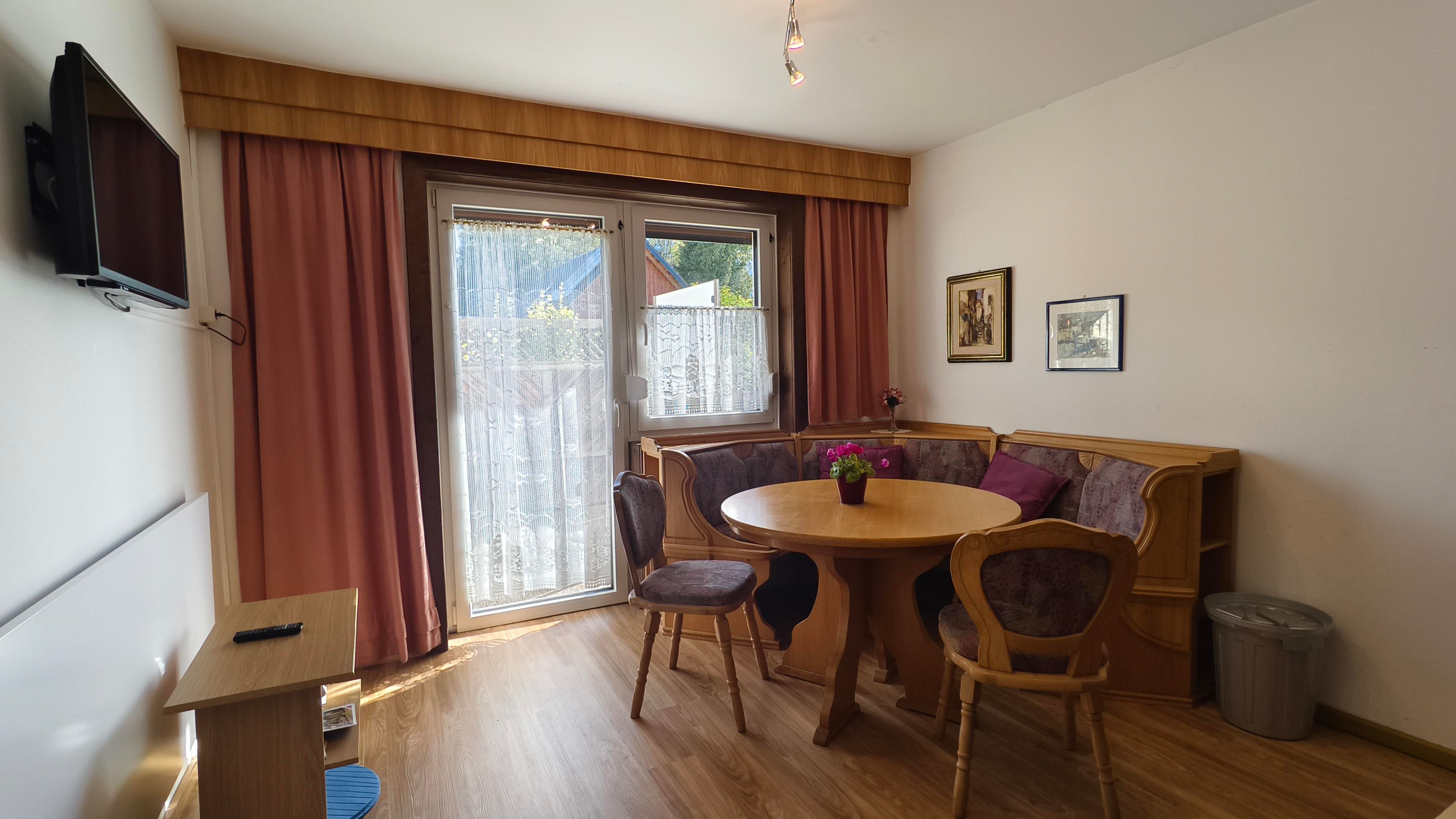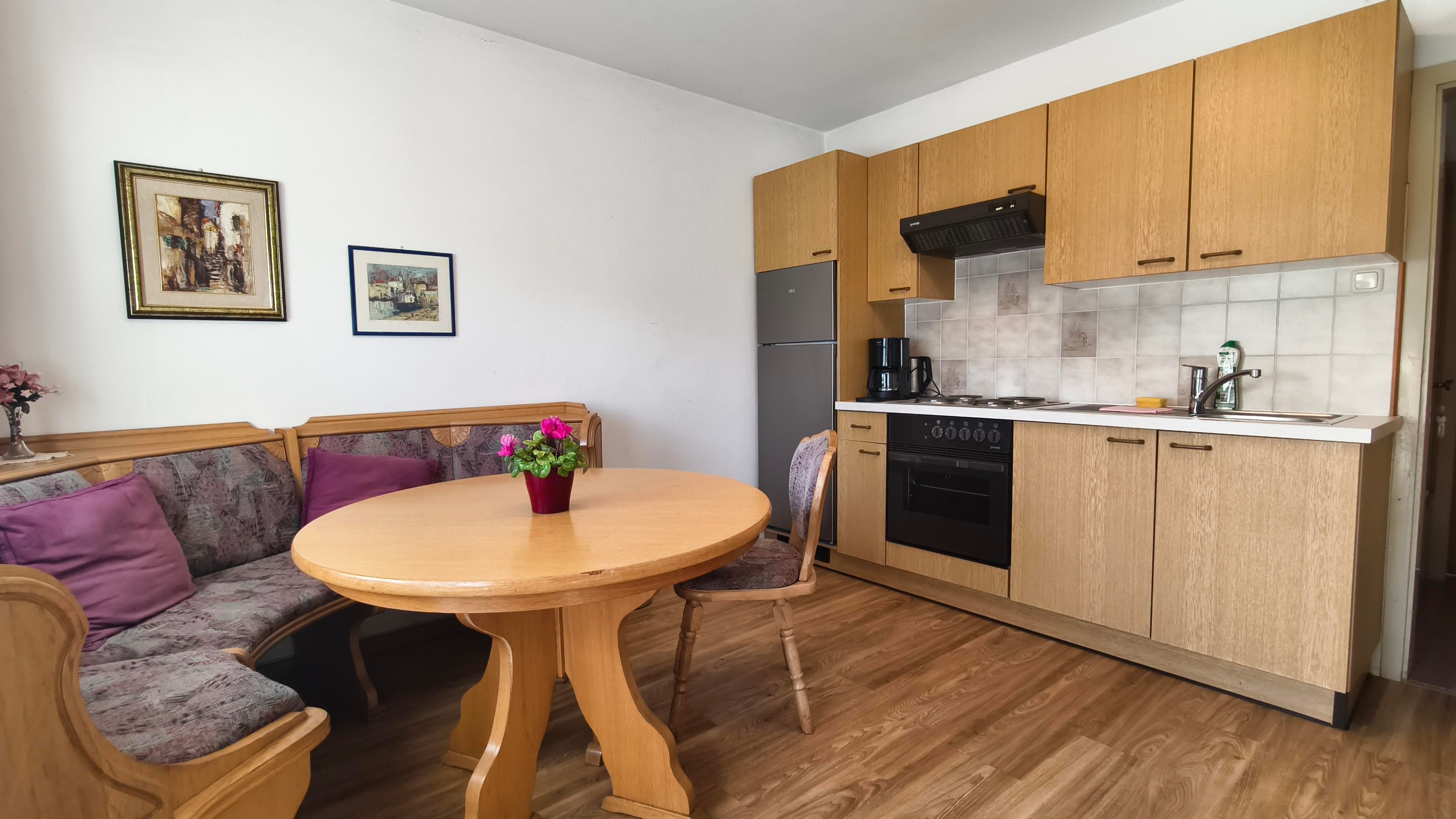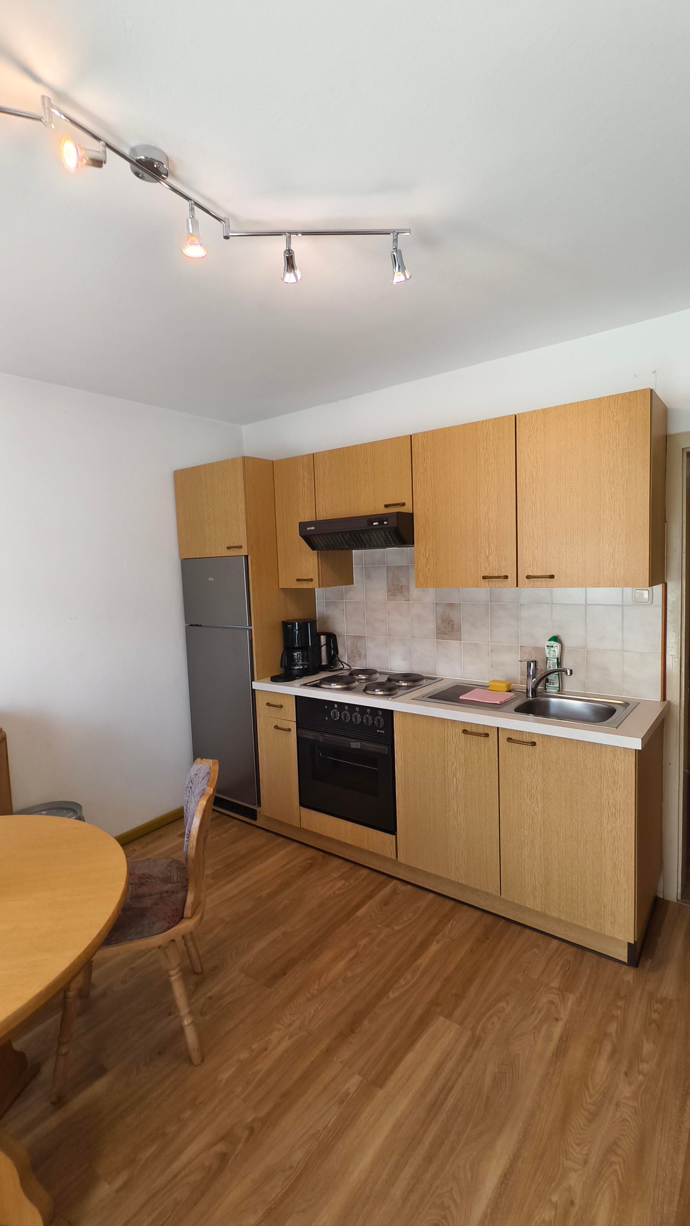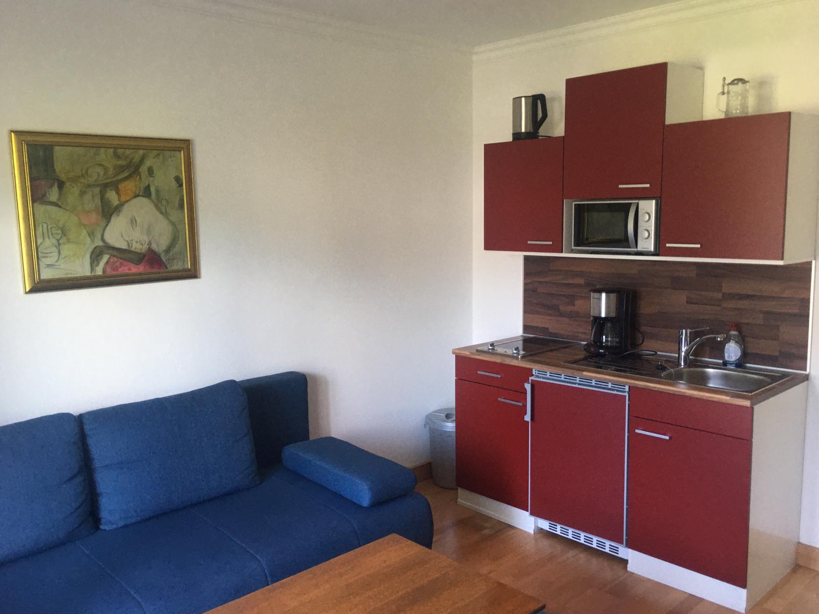 Diese Ferienwohnung für 2 Personen besitzt einen durchgehend südseitigen Balkon, eine komplett eingerichtete Klein-Küche mit Kühlschrank, 2 Kochplatten und einer Mikrowelle. Von dieser Wohnküche führt ein Durchgang zum Schlafzimmer. Die räumlich getrennte Dusche/WC ist über den Gang erreichbar.