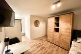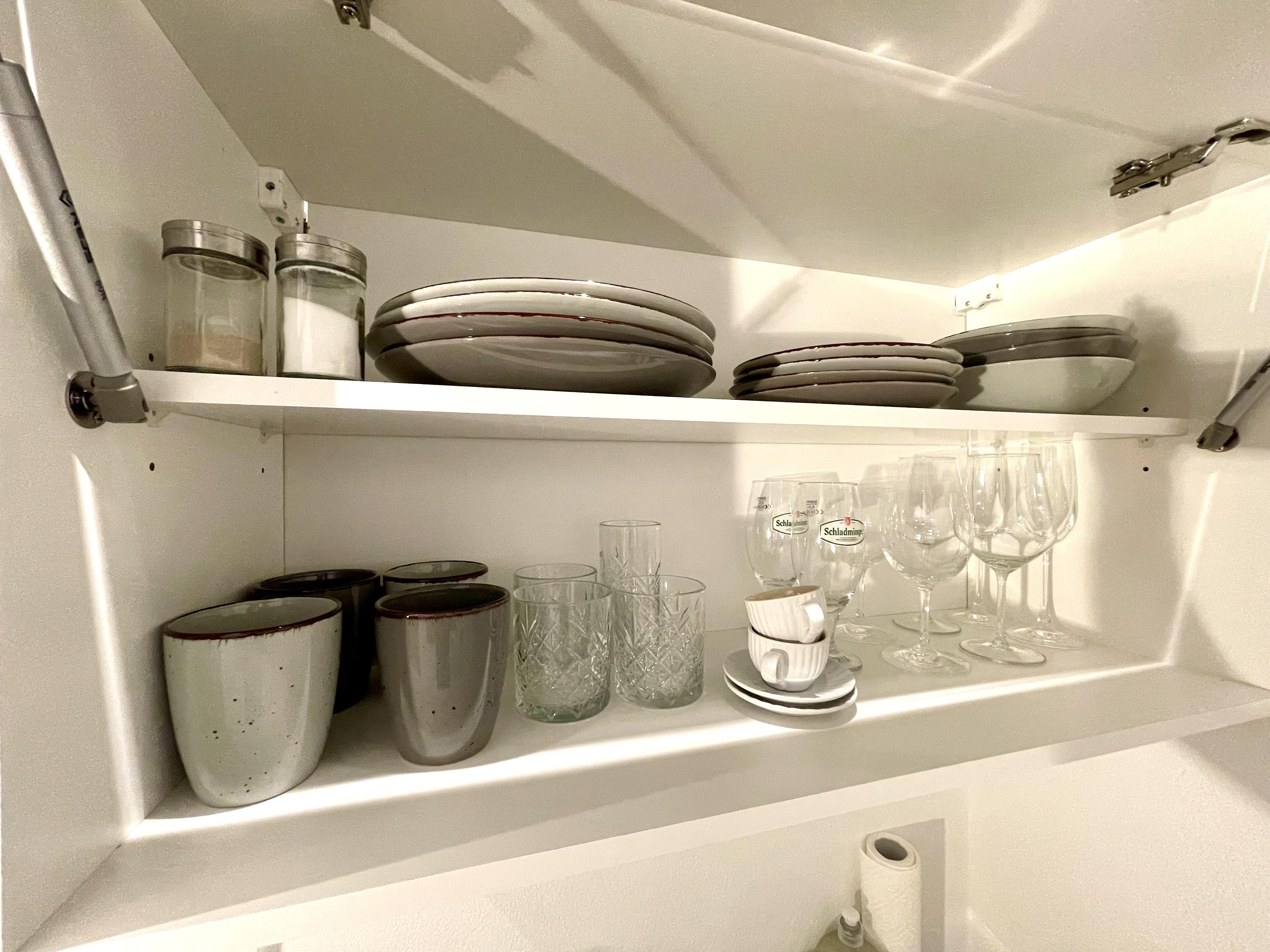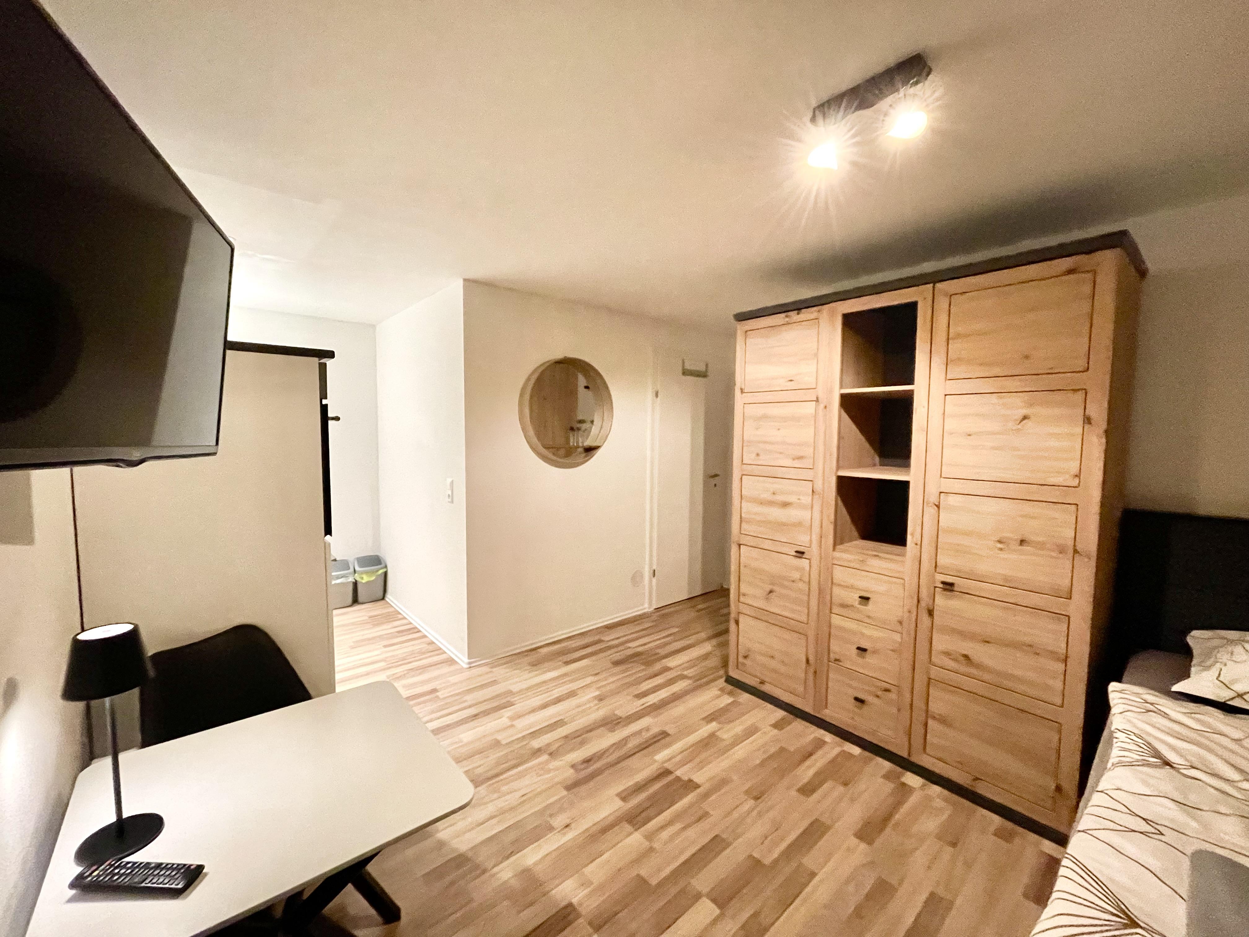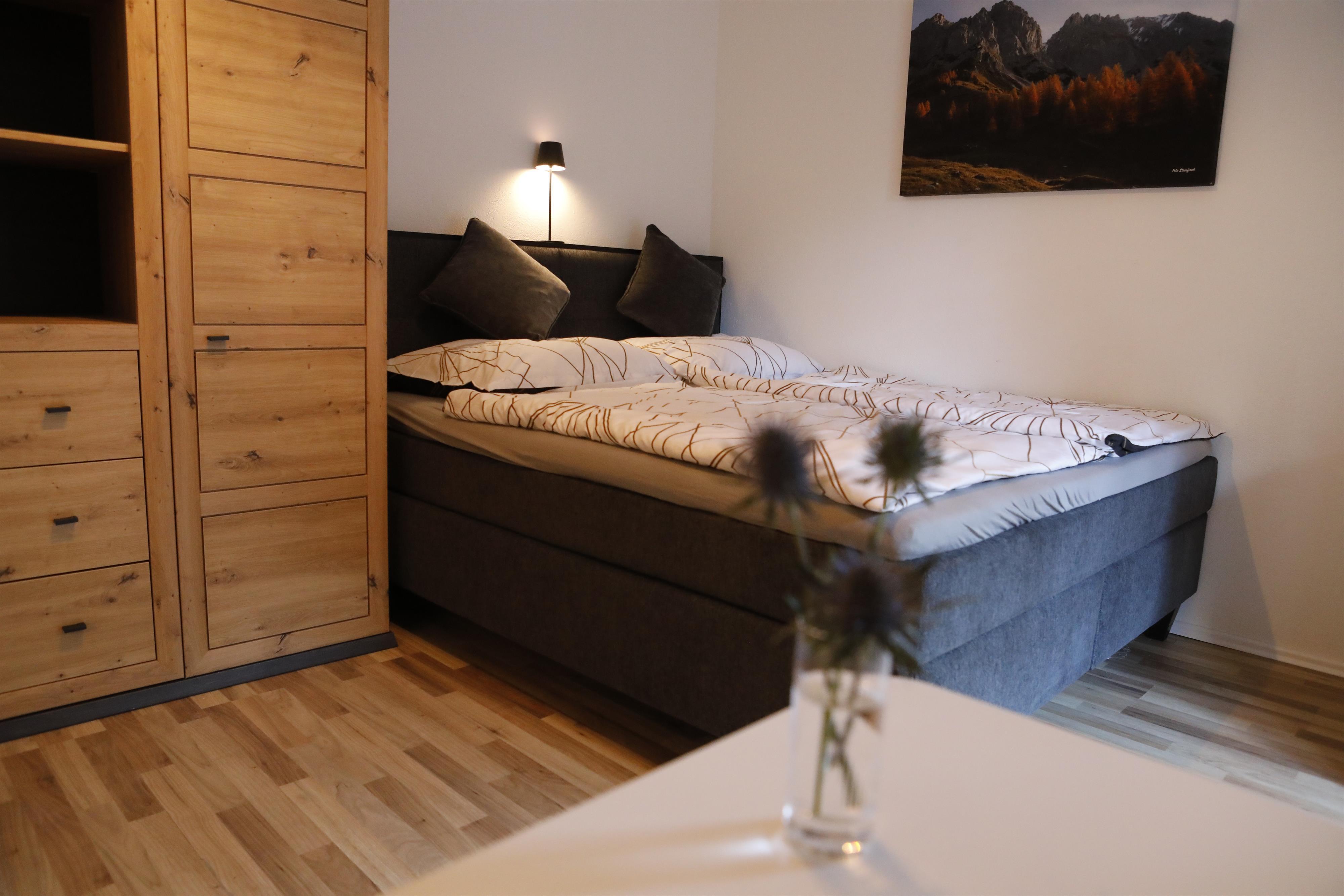 Appartement hochwertige Ausstattung, Kingsize Bett, Schrank, Küchenzeile mit Geschirrspüler, Kühlschrank mit Gefrierfach, Herd mit Backofen, die Küche ist mit hochwertigen Küchenutensilien ausgestattet, Geschirrtücher vorhanden, 1 x Bettzeug und jeweils 1 Garnitur Handtücher im Preis enthalten, Bad mit Dusche und WC, Flachbild TV, WLAN kostenfrei, kleiner Tisch mit 2 Stühlen, Schuhablage, Garderobe, Tisch und 4 Stühle auf der überdachten Terrasse.