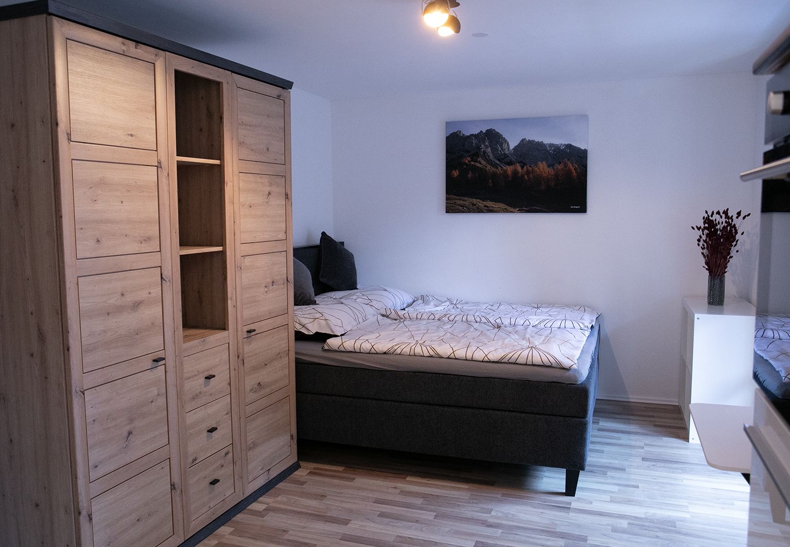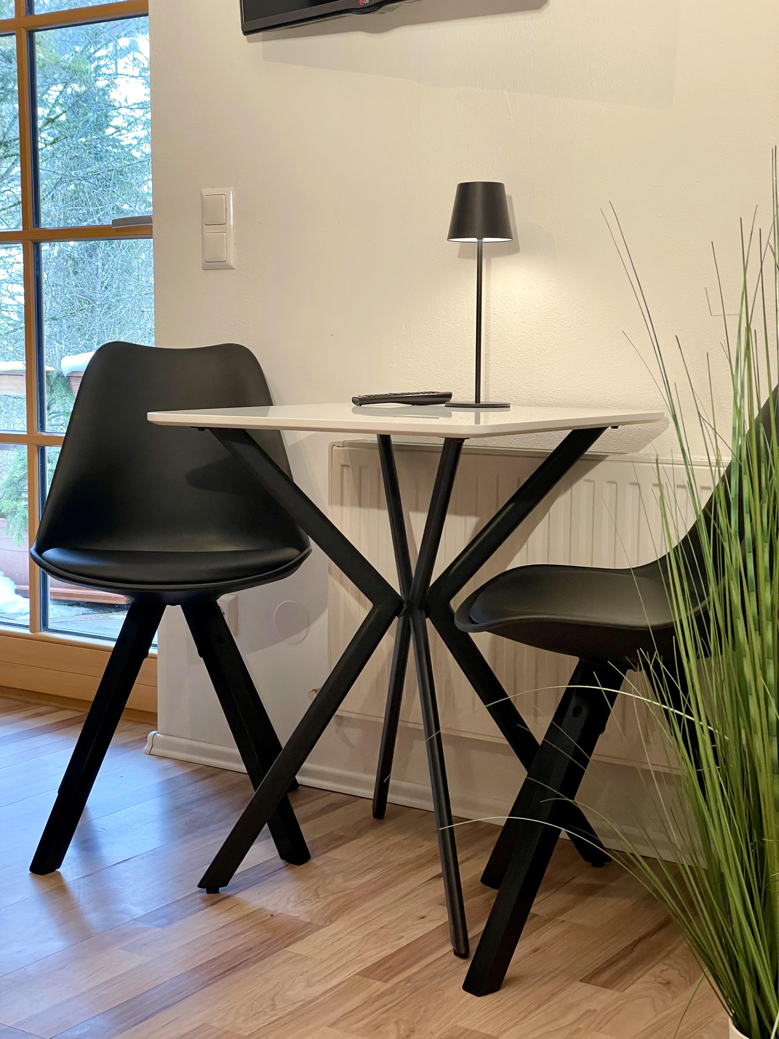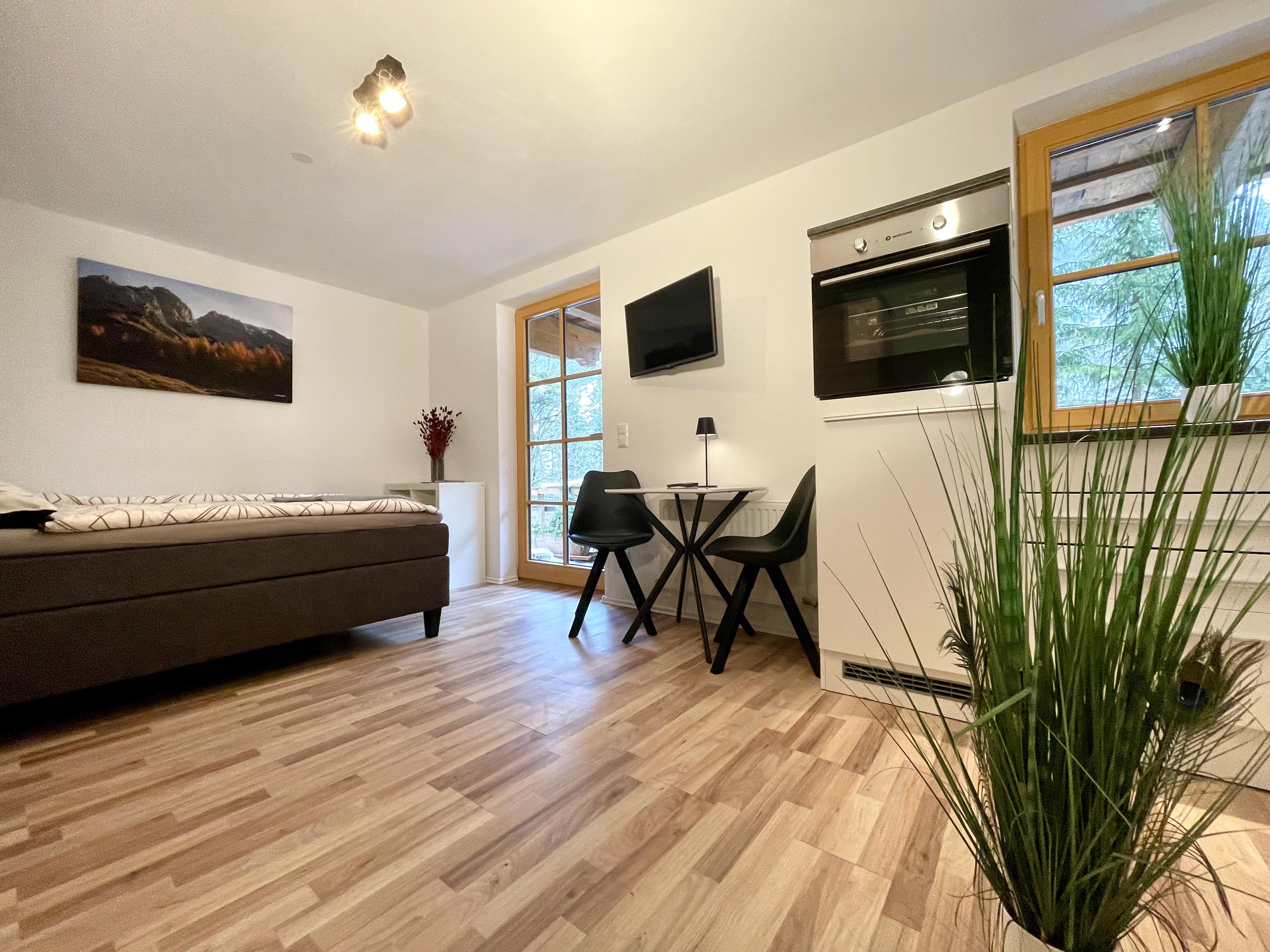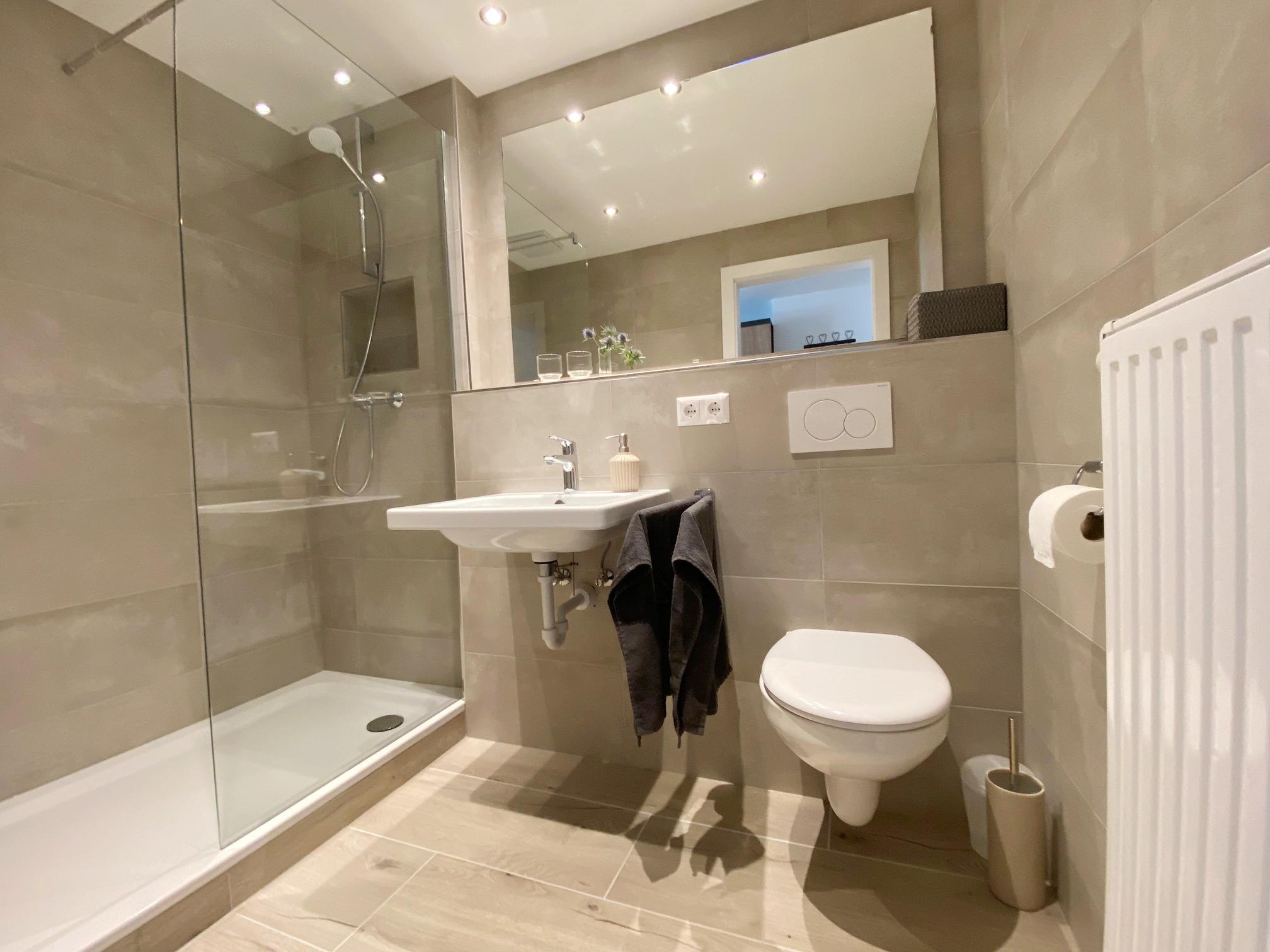Appartement hochwertige Ausstattung, Kingsize Bett, Schrank, Küchenzeile mit Geschirrspüler, Kühlschrank mit Gefrierfach, Herd mit Backofen, die Küche ist mit hochwertigen Küchenutensilien ausgestattet, Geschirrtücher vorhanden, 1 x Bettzeug und jeweils 1 Garnitur Handtücher im Preis enthalten, Bad mit Dusche und WC, Flachbild TV, WLAN kostenfrei, kleiner Tisch mit 2 Stühlen, Schuhablage, Garderobe, Tisch und 4 Stühle auf der überdachten Terrasse.