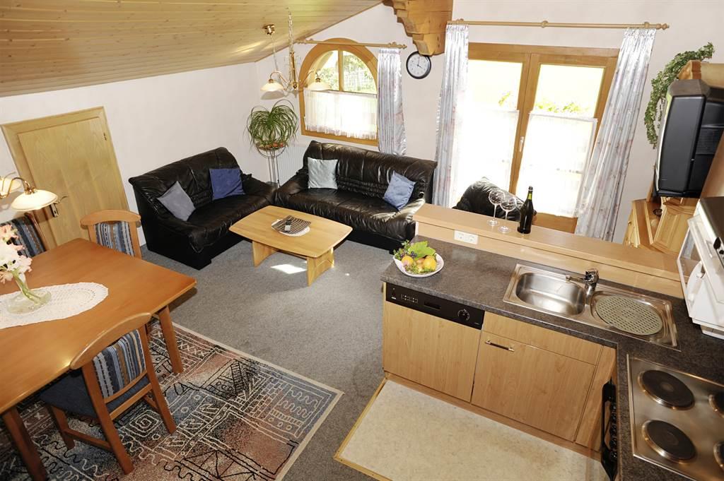 Süd-Ost Lage, ca. 75 m² im Dachgeschoß gelegen ausgestattet mit: 3 Schlafzimmer (davon ein kleineres Kinderzimmer in der Dachschräge), Dusche, sep. WC, Wohnzimmer mit Essecke, vollständig ausgestattete Küche mit Geschirrspüler, Sitzecke, TV, Radio und W-LAN, Flur mit Kaminofen, Balkon.