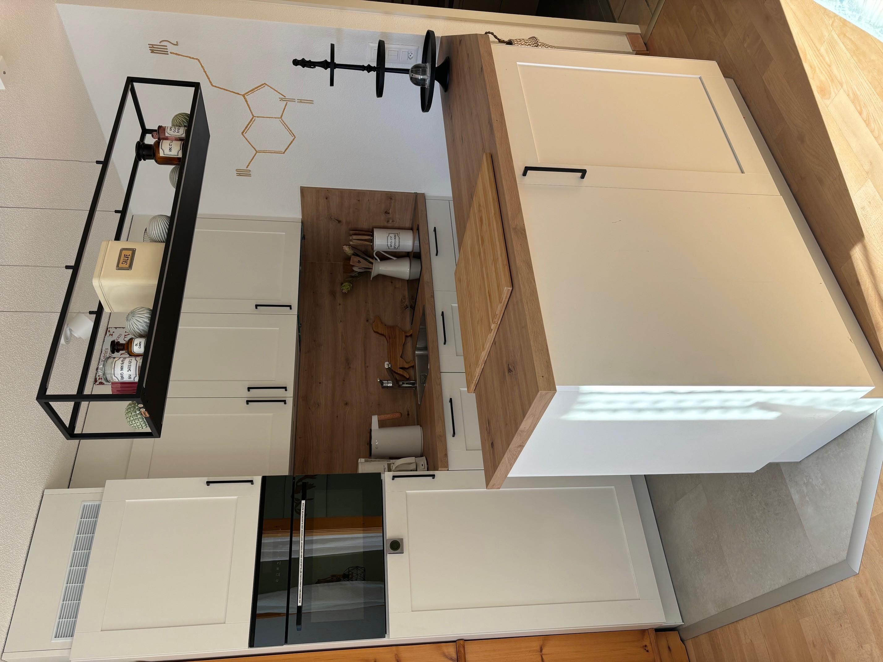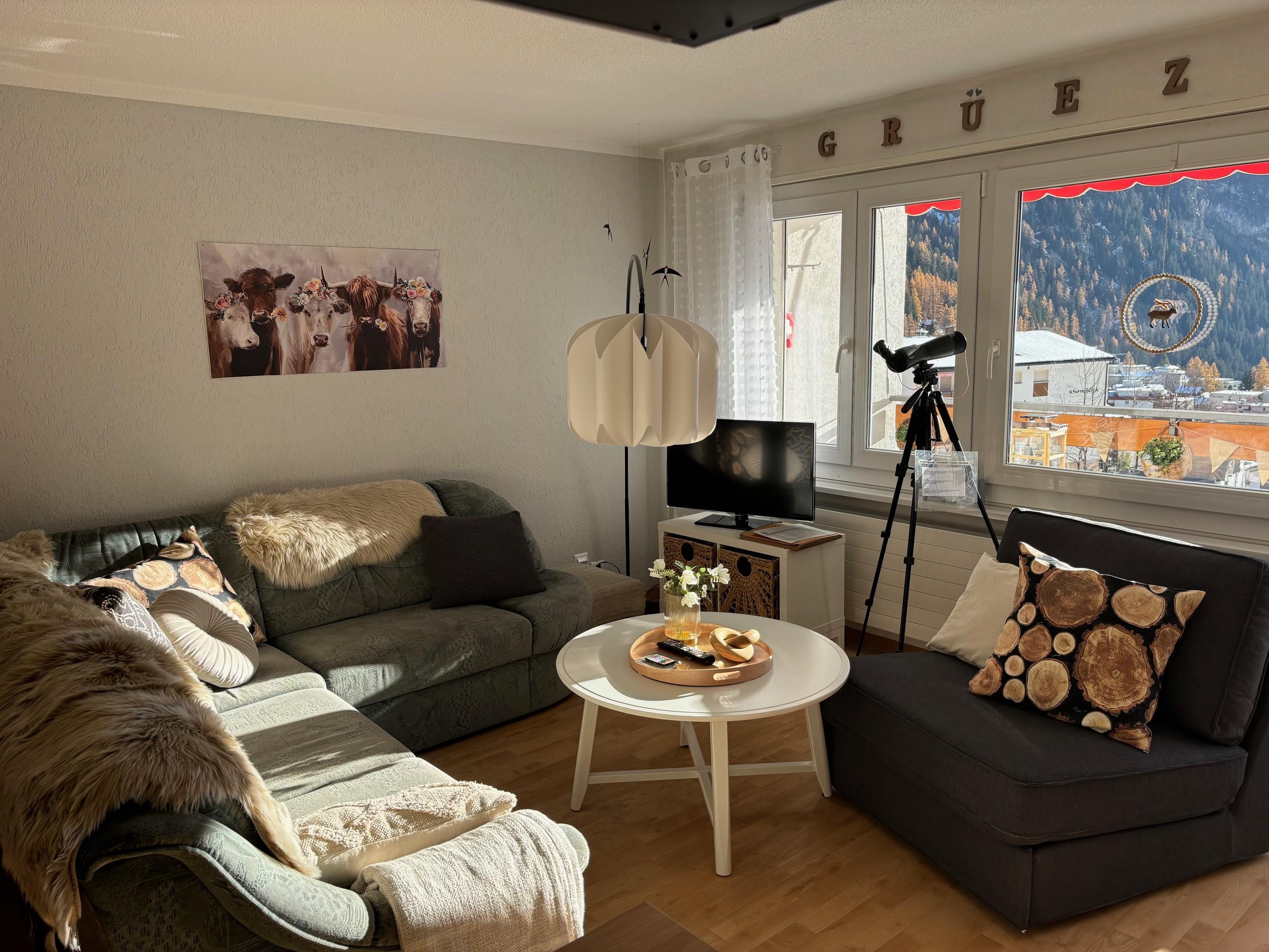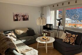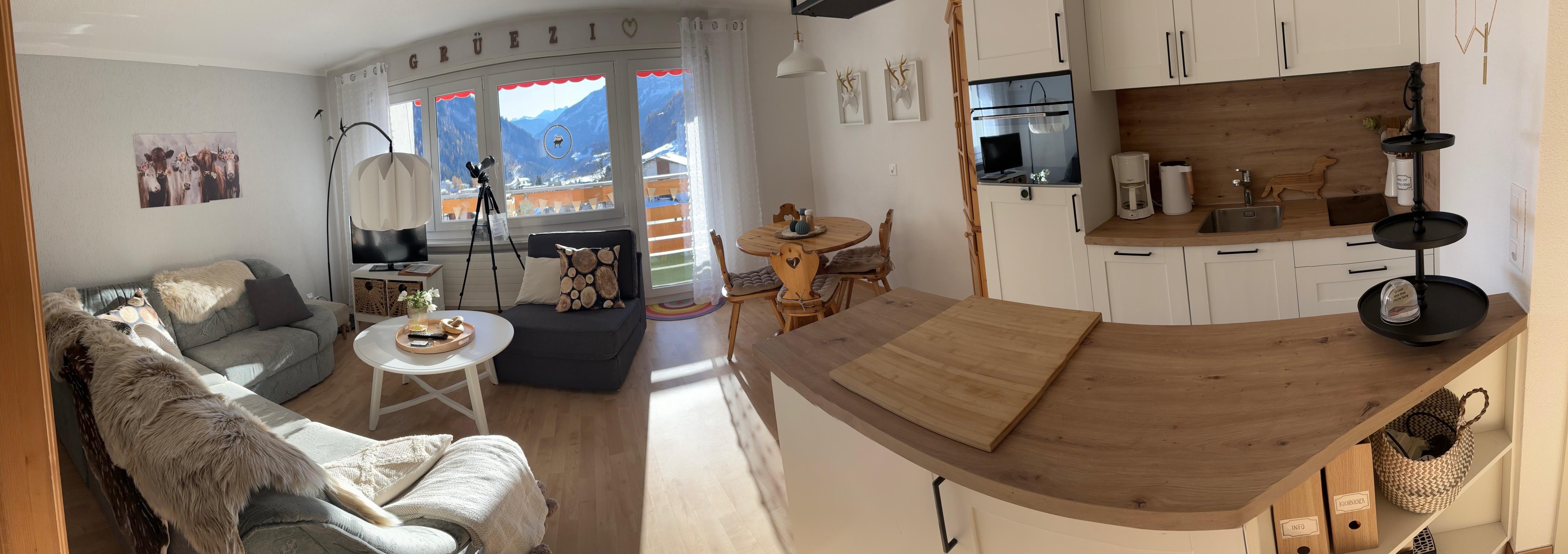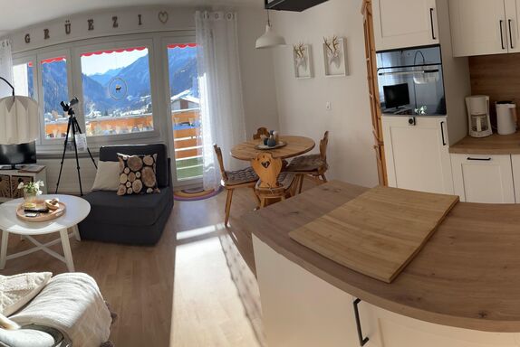 1-Zimmerwohnung: Wohn-/Esszimmer mit 2 Betten, Essecke, offene moderne Küche, Bad/WC, Südbalkon, Radio, TV, Wireless Internet gratis. Garage im Haus inklusive.