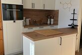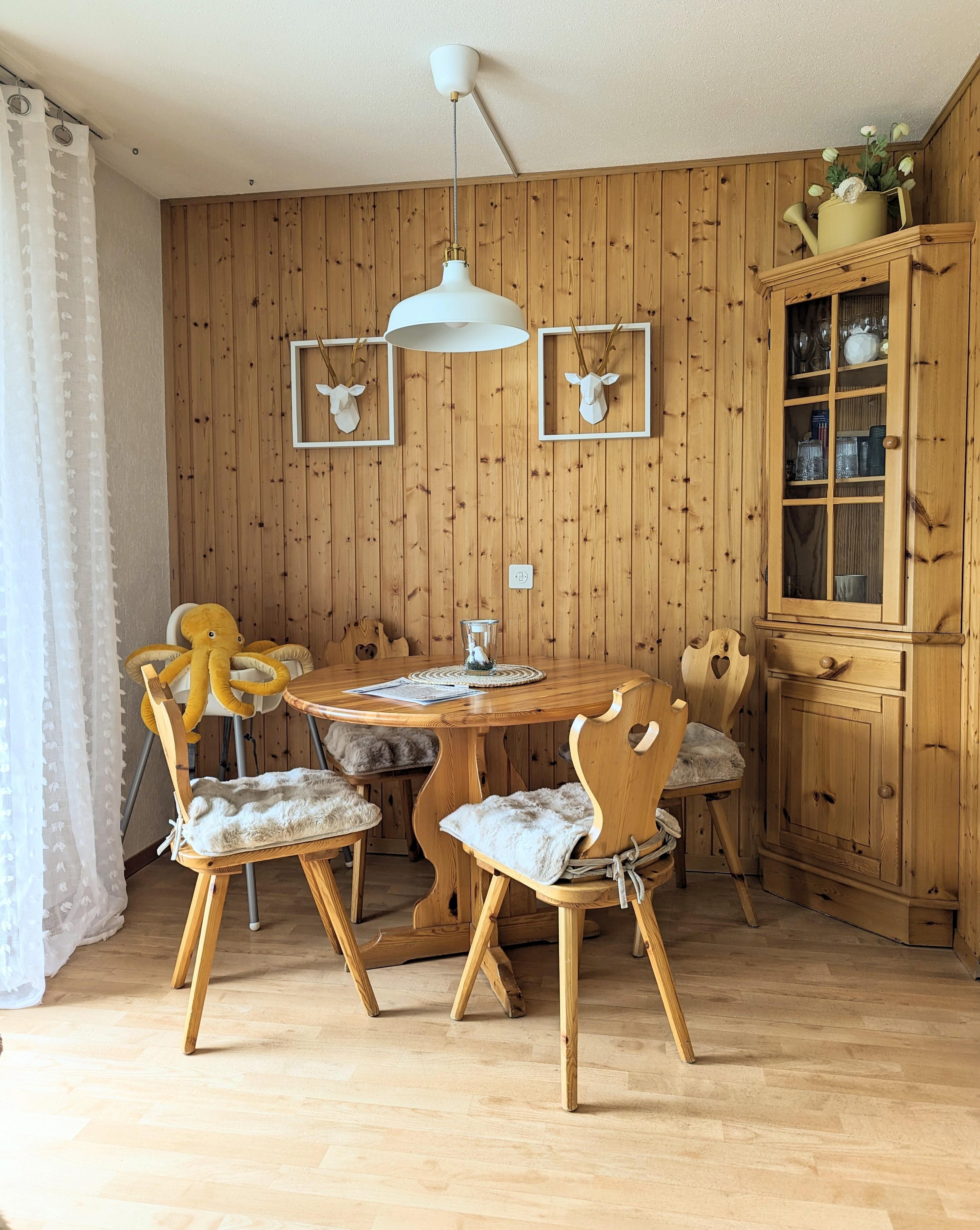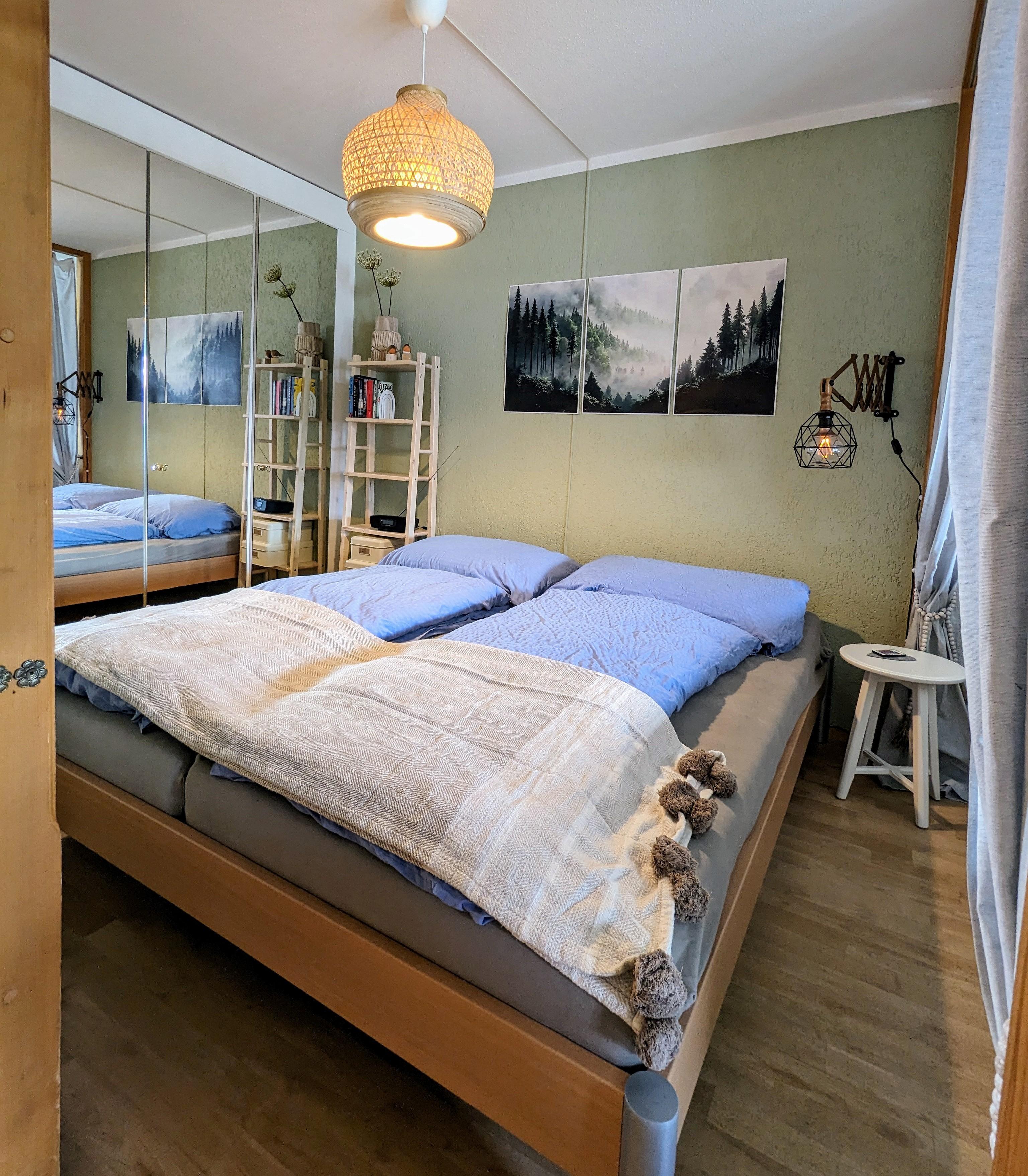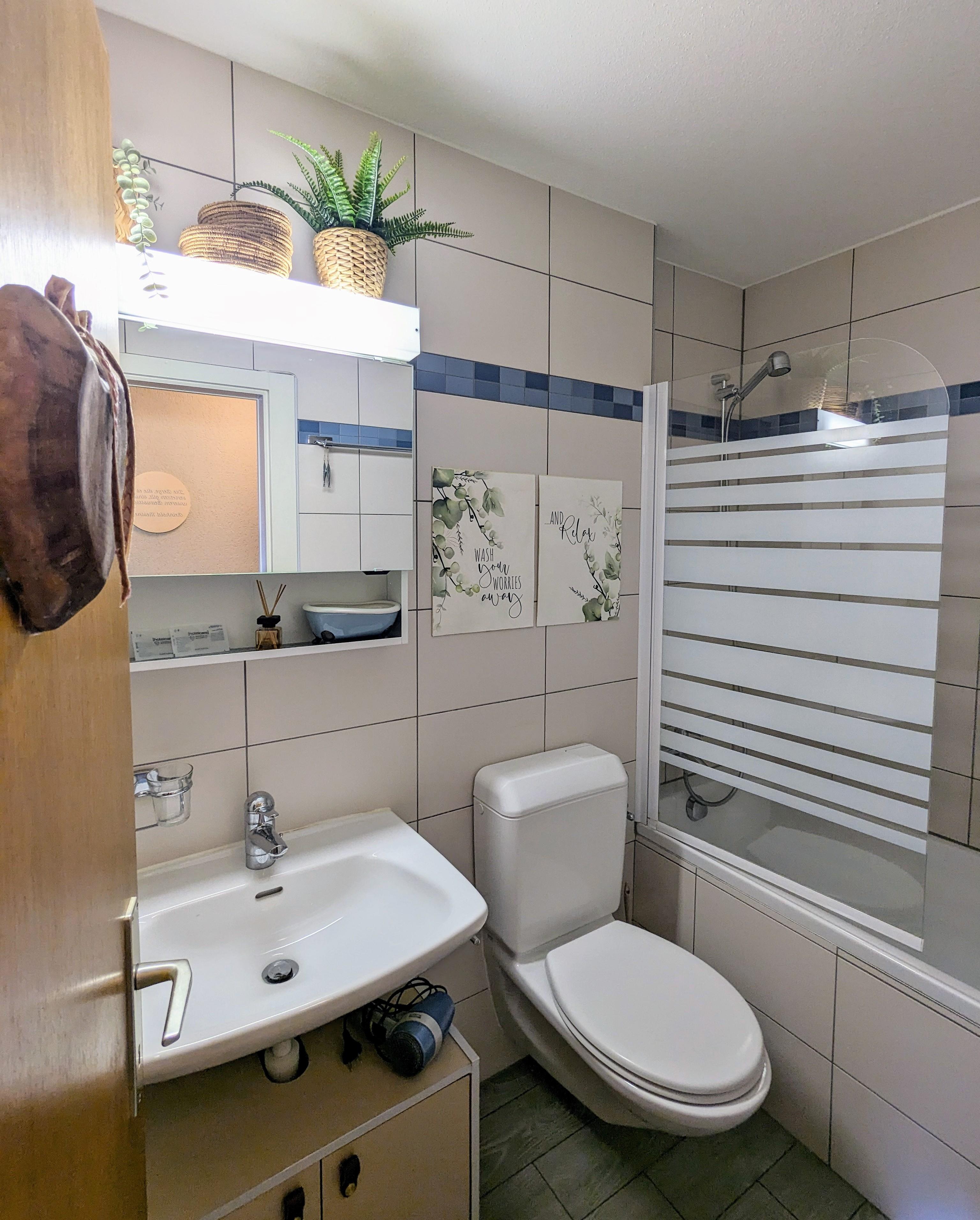 1-Zimmerwohnung: Wohn-/Esszimmer mit 2 Betten, Essecke, offene moderne Küche, Bad/WC, Südbalkon, Radio, TV, Wireless Internet gratis. Garage im Haus inklusive.