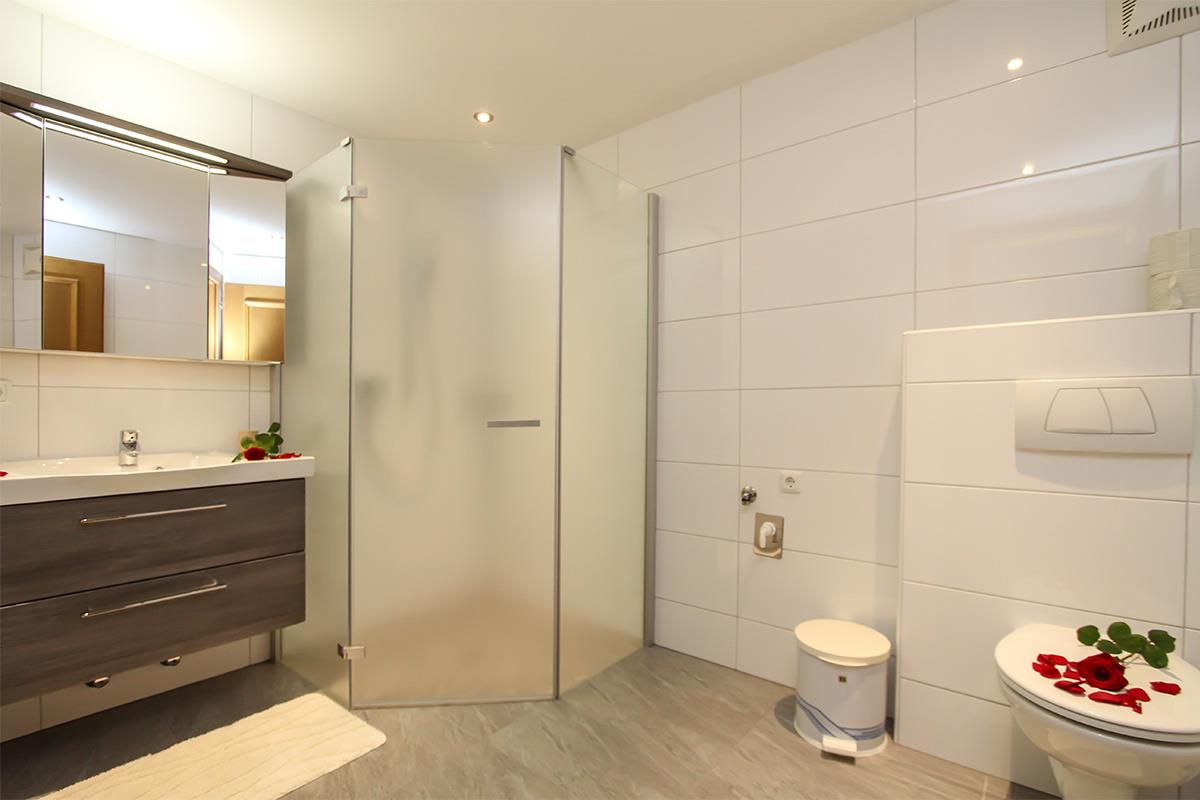 Die FeWo umfasst 4 Räume: 1 Wohnküche mit Schlafmöglichkeit für 2 Personen (große Küchenzeile mit Geschirrspüler, Kühlschrank mit Gefrierfach, Cerankochfeld, Backrohr, Mikrowelle, helle Sitzecke mit Esstisch); 2 DZ mit DU/WC; Wohnzimmer mit Schlafmöglichkeit. Balkon von jedem Raum zugänglich.