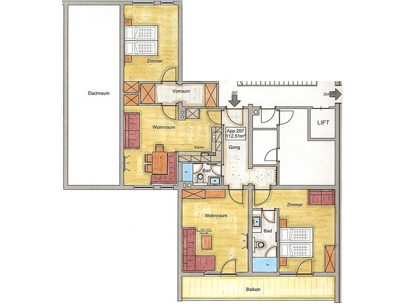 Ferienwohnung Nr. 207 umfasst 4 Räume (112 m²): 1 Wohnküche (große Küchenzeile mit Geschirrspüler, Kühlschrank mit Gefrierfach, Cerankochfeld, Backrohr, Mikrowelle, helle Sitzecke mit Esstisch); 2 DZ mit DU/WC und Wohnzimmer mit Schlafmöglichkeit. Balkon.