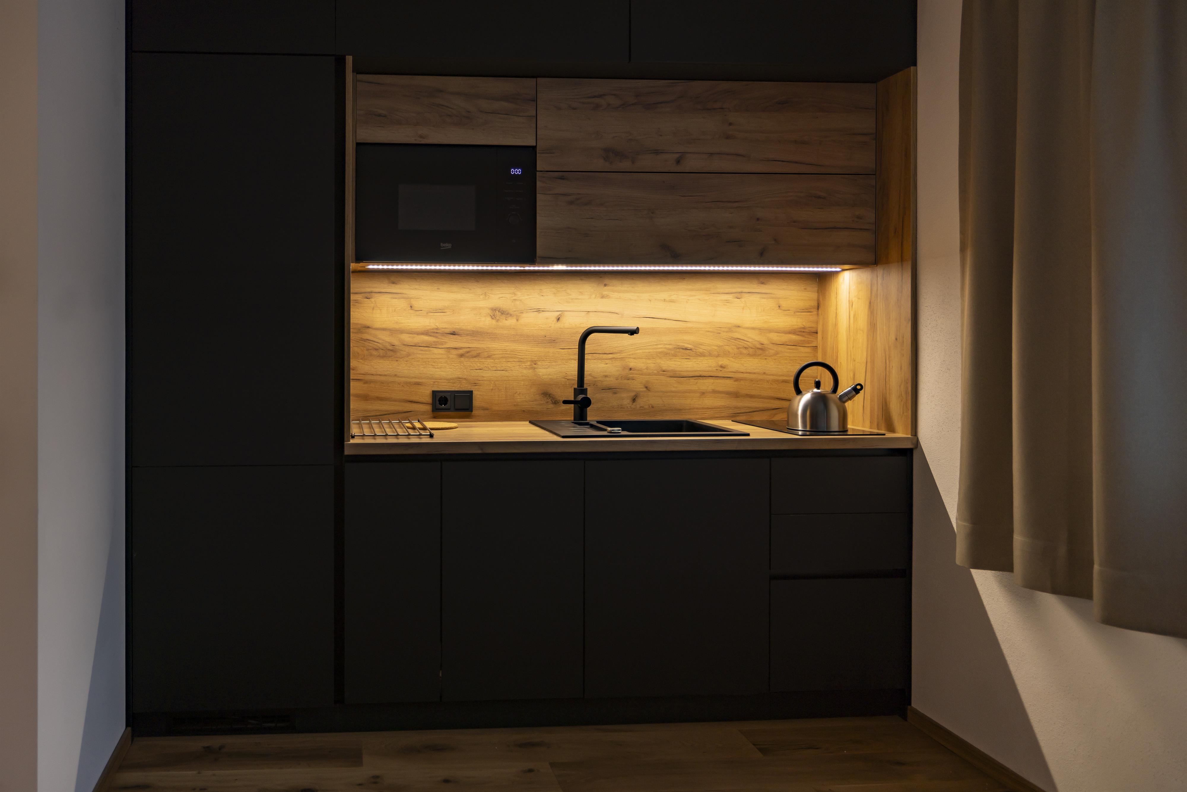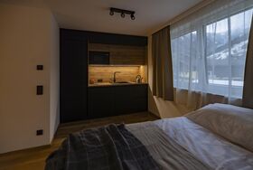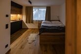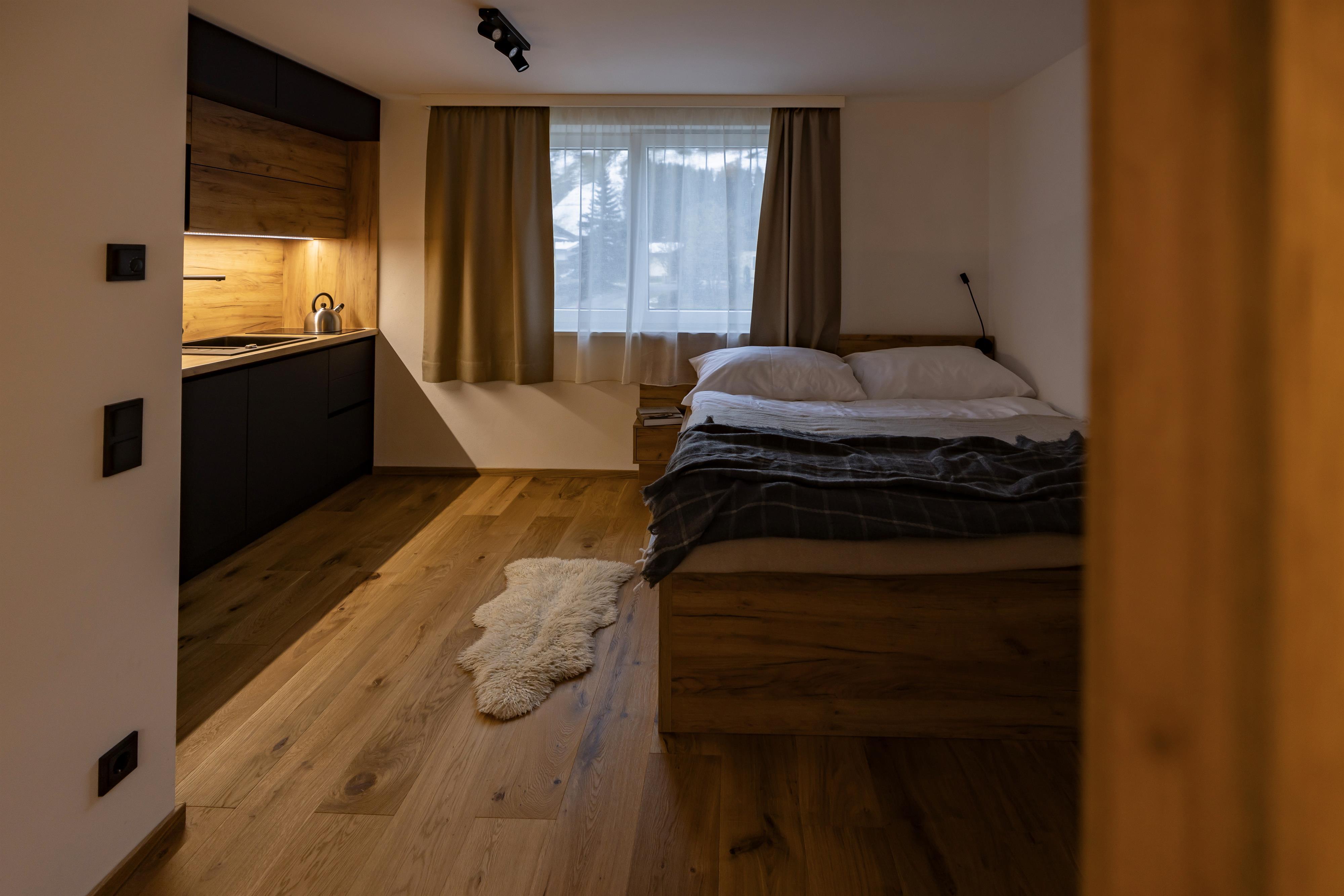 Romantische Unterkunft für zwei Personen. Voll ausgestattetes Studio mit Doppelbett, Bad und geräumigem Balkon für ungestörte Momente der Entspannung nach anstrengenden Tagen in den Bergen.