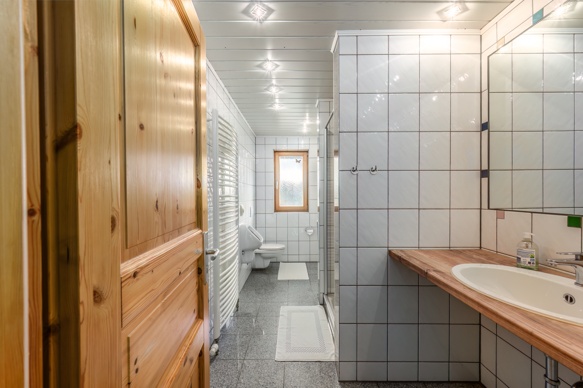 Großes Badezimmer mit Dusche, Wohn- und Essbreich mit Sofa, Sat-Tv etc.