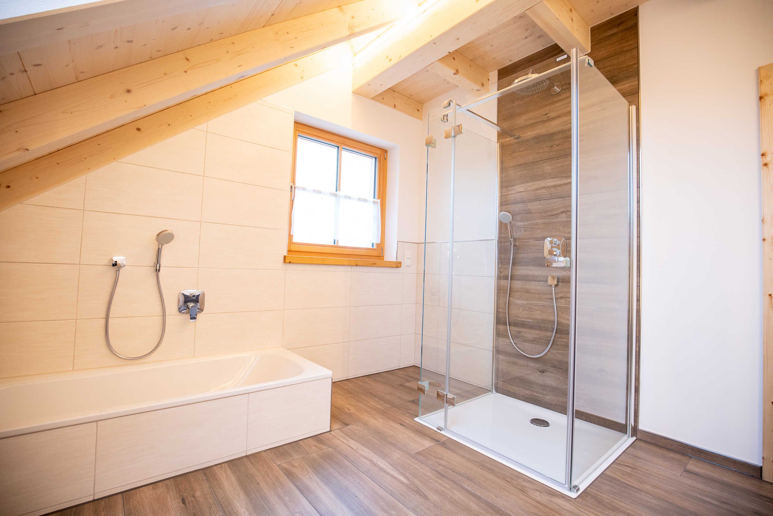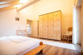 Im Obergeschoss befinden sich zwei Schlafzimmer mit Doppelbett und ein Schlafzimmer mit 2 Einzelbetten sowie ein großes Bad mit Wanne, Dusche und WC.
