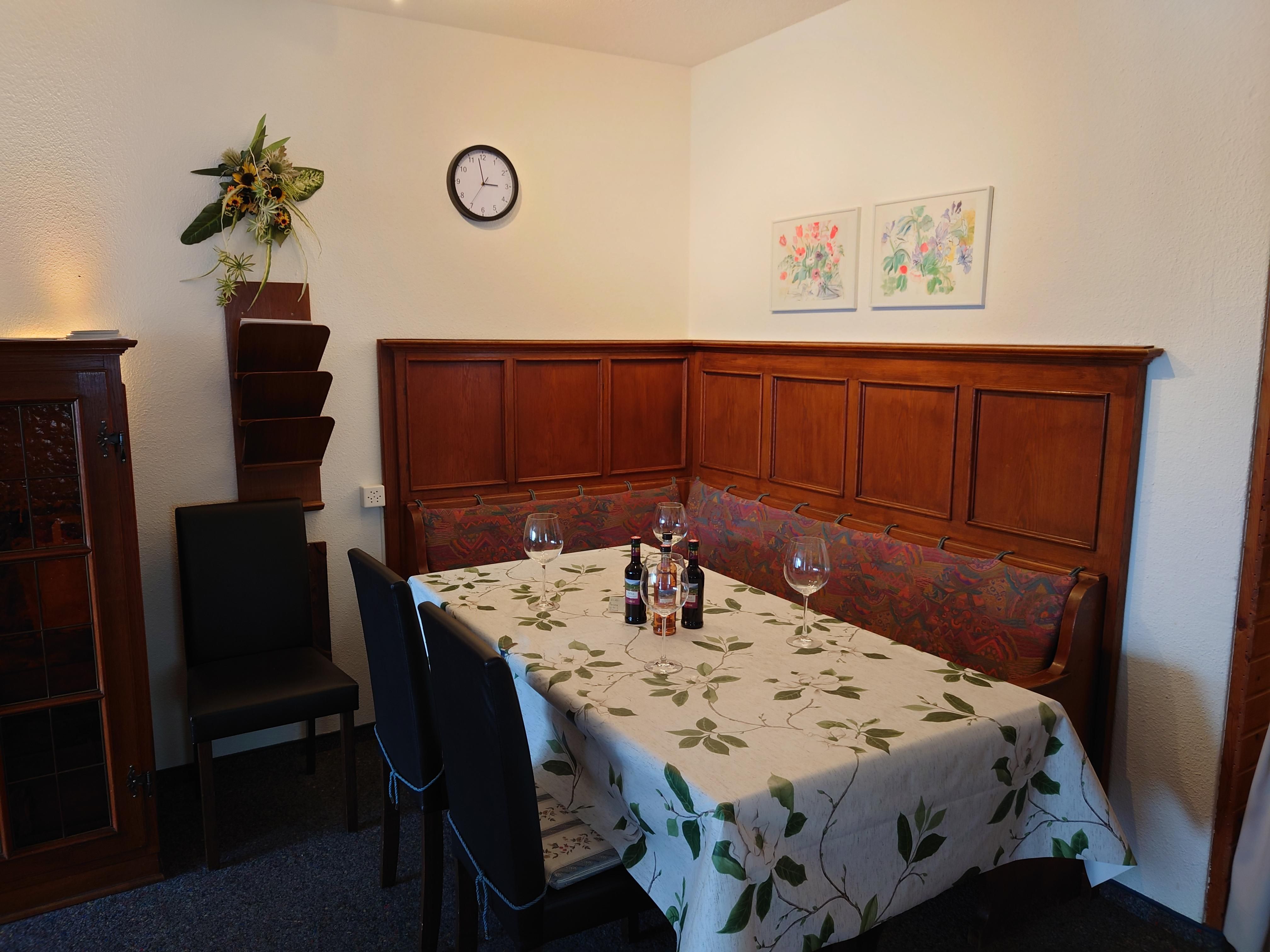 Grosszügige 3-Zimmer-Wohnung im EG mit neuwertiger Einrichtung in Bestausstattung, Südbalkon mit unverbautem Panoramablick, grosses Wohn-/Esszimmer, 2 jeweils komfortabel eingerichtete Zweibettzimmer, Schreibtisch, 2 weitere vollwertige Schrankbetten im Wohnzimmer, hochwertige und vollausgestattete Küche mit Geschirrspülmaschine und Waschtrockner Kombigerät (8kg/5kg), neue Dusche/WC, sowie weiteres separates WC, Radio/Bluetooth-HiFi/CD/MP3, 2x Smart-TV (mit Internet-access), Quickline TV Streaming Box, gratis 100 Mbit W-LAN Anschluss. Geschlossene Garage inklusve. Wickeltisch, Kinder- und familienfreundlich. In unmittelbarer Nähe: Haltestelle Ortsbus (Ring-Jet), Bäckerei und Supermarkt. Keine Haustiere erlaubt. Nichtraucherwohnung. Begrüssungsgeschenk.