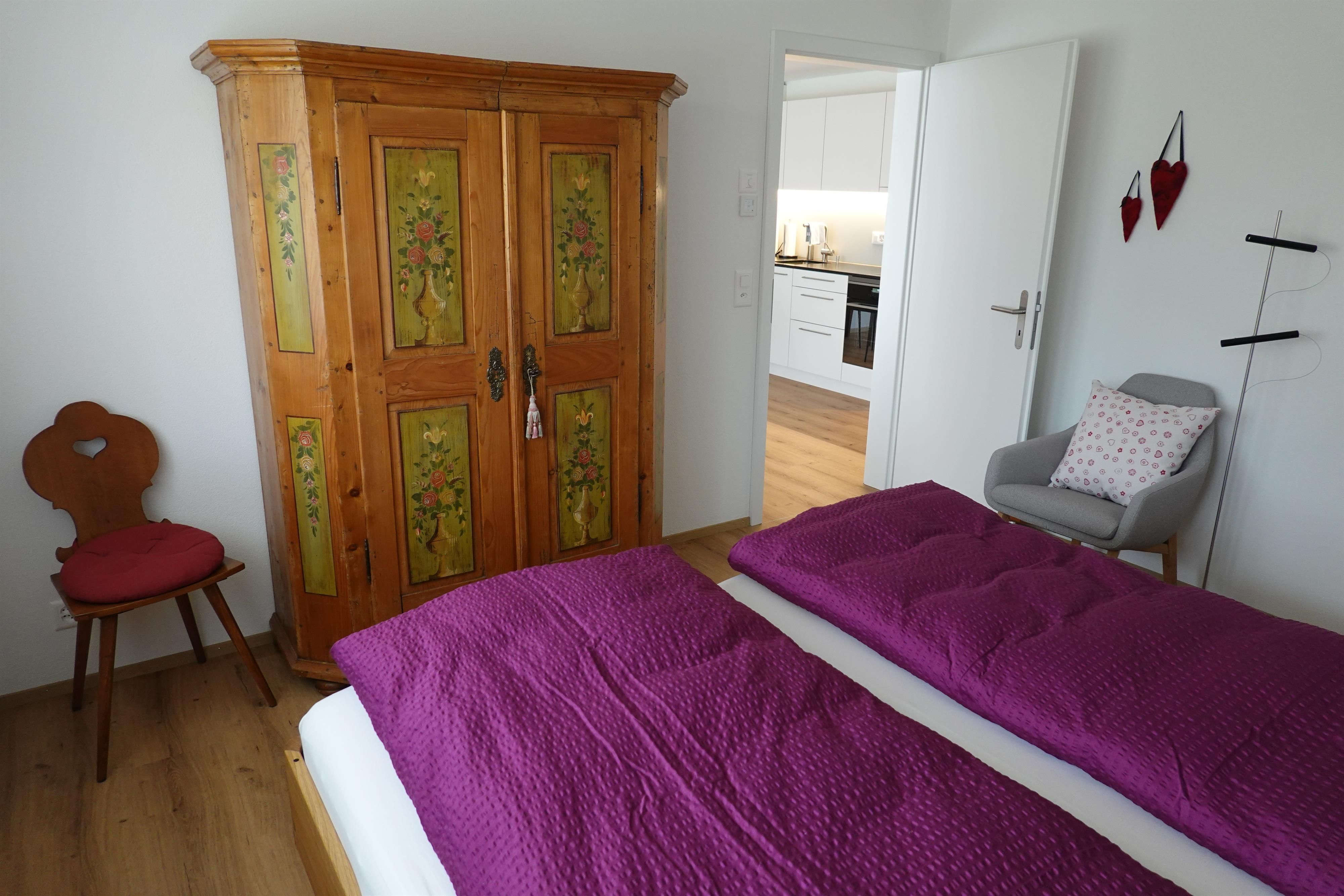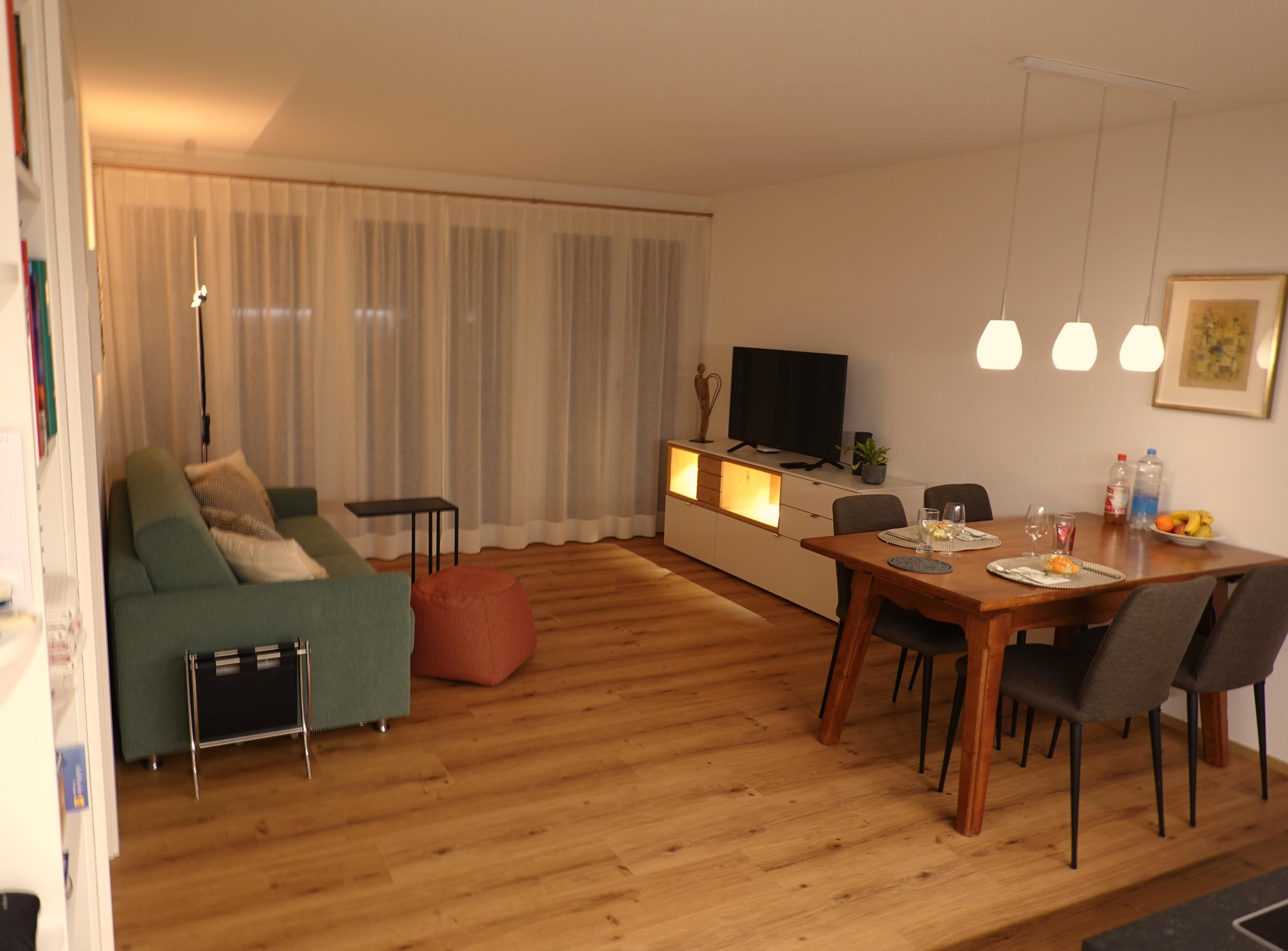 Die moderne Wohnung verfügt über Entrée mit Garderobe, Schlafzimmer, Wohnraum mit offener Küche, Badezimmer mit Dusche/WC und Bodenheizung. Mit dem Lift gelangen Sie zum eigenen Keller mit Waschmaschine/Tumbler und in die Garage zu Ihrem Auto-Einstellplatz. Ladestationen für E-Autos beim nahen LWA. Die Wohnung ist komfortabel, praktisch und zweckmässig eingerichtet und bietet 2 Personen bequem Platz. Im Schlafzimmer befindet sich ein Doppelbett (180x200), ein Bauernschrank sowie ein Sessel mit einer Stehleuchte. Bei Bedarf kann für eine weitere Person das Sofa im Wohnzimmer mit wenigen Handgriffen in ein bequemes Sofa-Bett (140x200) umgewandelt werden (siehe «Gut zu wissen»). Die Küchenzeile ist ausgestattet mit Kühlschrank/Gefrierfach, Glaskeramikkochfeld, Backofen/Steamer und Abwaschmaschine (auf Wunsch Mikrowelle). Auf der Terrasse befindet sich ein Gartentisch mit Stühlen, zwei Liegestühle, eine Gartenbox mit Kissen und ein Sonnenschirm.