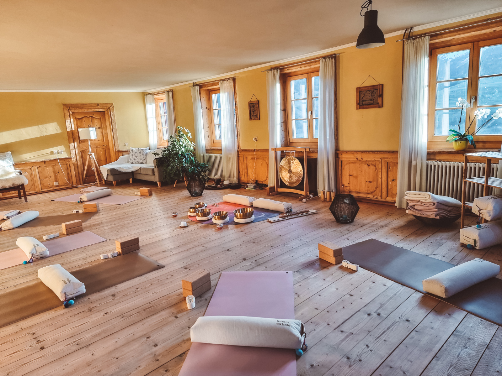 Das wunderschöne Wohnzimmer ist hell, warm und geräumig. Es bietet Platz zum Verweilen, Entspannen, zum Tanzen und Yoga machen. Die von der Gastgeberin angebotenen Yogaevents finden in diesem Raum statt und sind offen für die Teilnahme der Gäste. Termine und Preise stehen auf unserer Website. Ausserhalb der Lektionen steht er zur freien Verfügung.