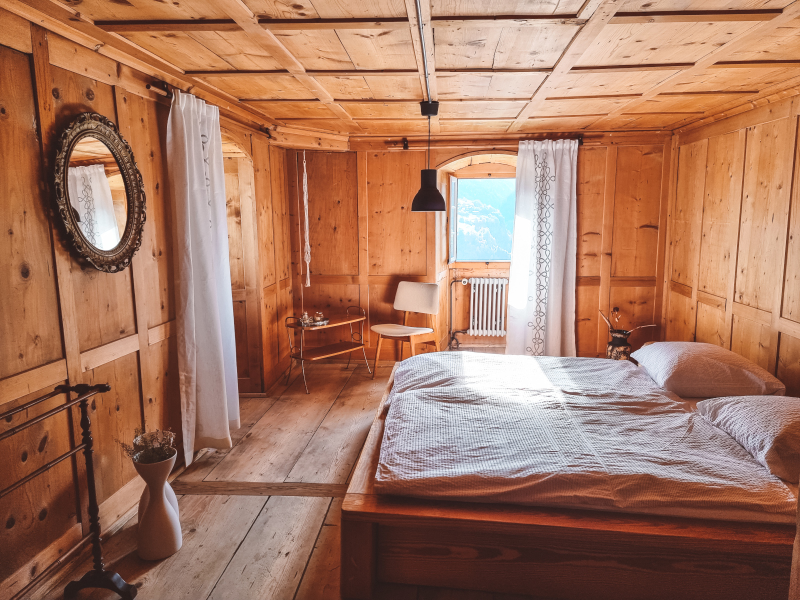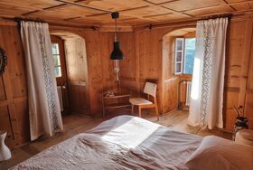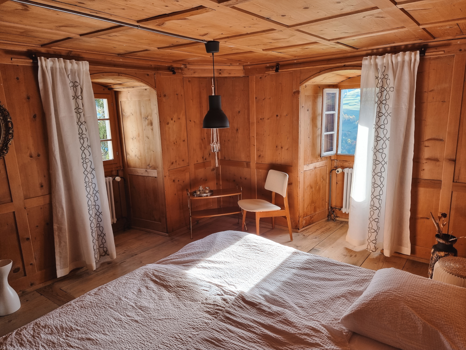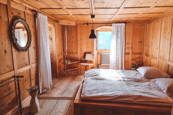 Das schöne Doppelzimmer ist durch die vollständige Holzauskleidung und die Fensternischen ein gemütliches und ruhiges Zimmer. Es ist mit einem bequemen 180cm Doppelbett ausgestattet. Das Zimmer hat einen Wandschrank, einen Stuhl mit kleinem Bücherregal und bietet einen wundervollen Blick über das Tal.