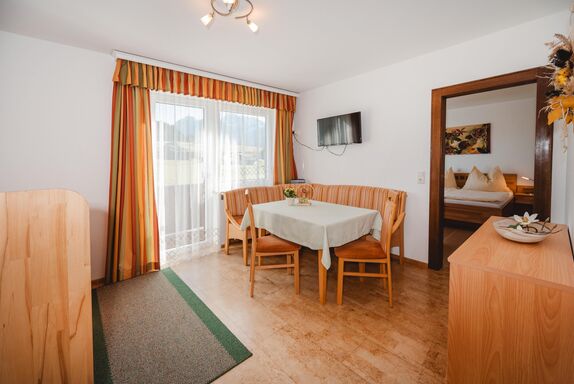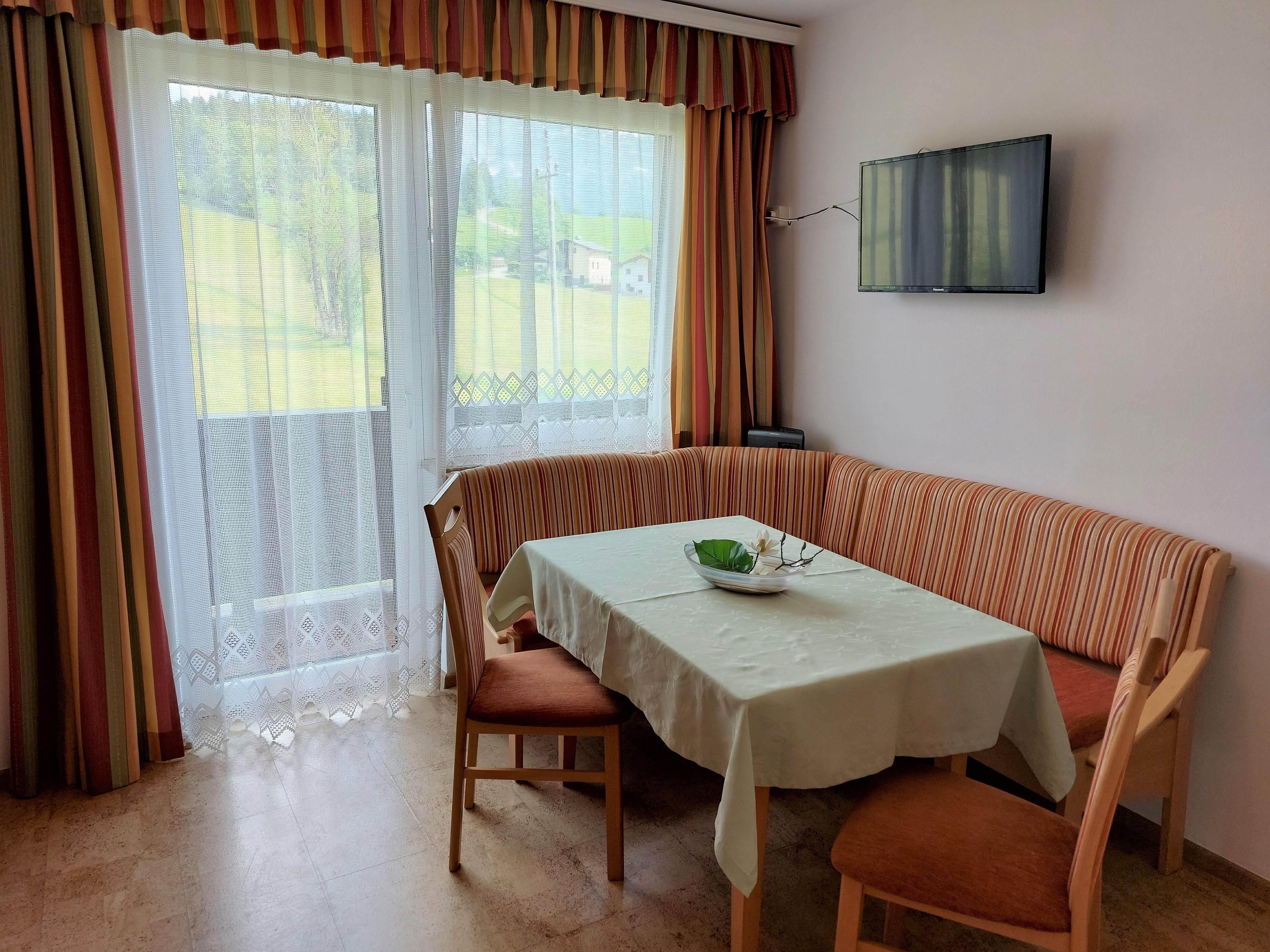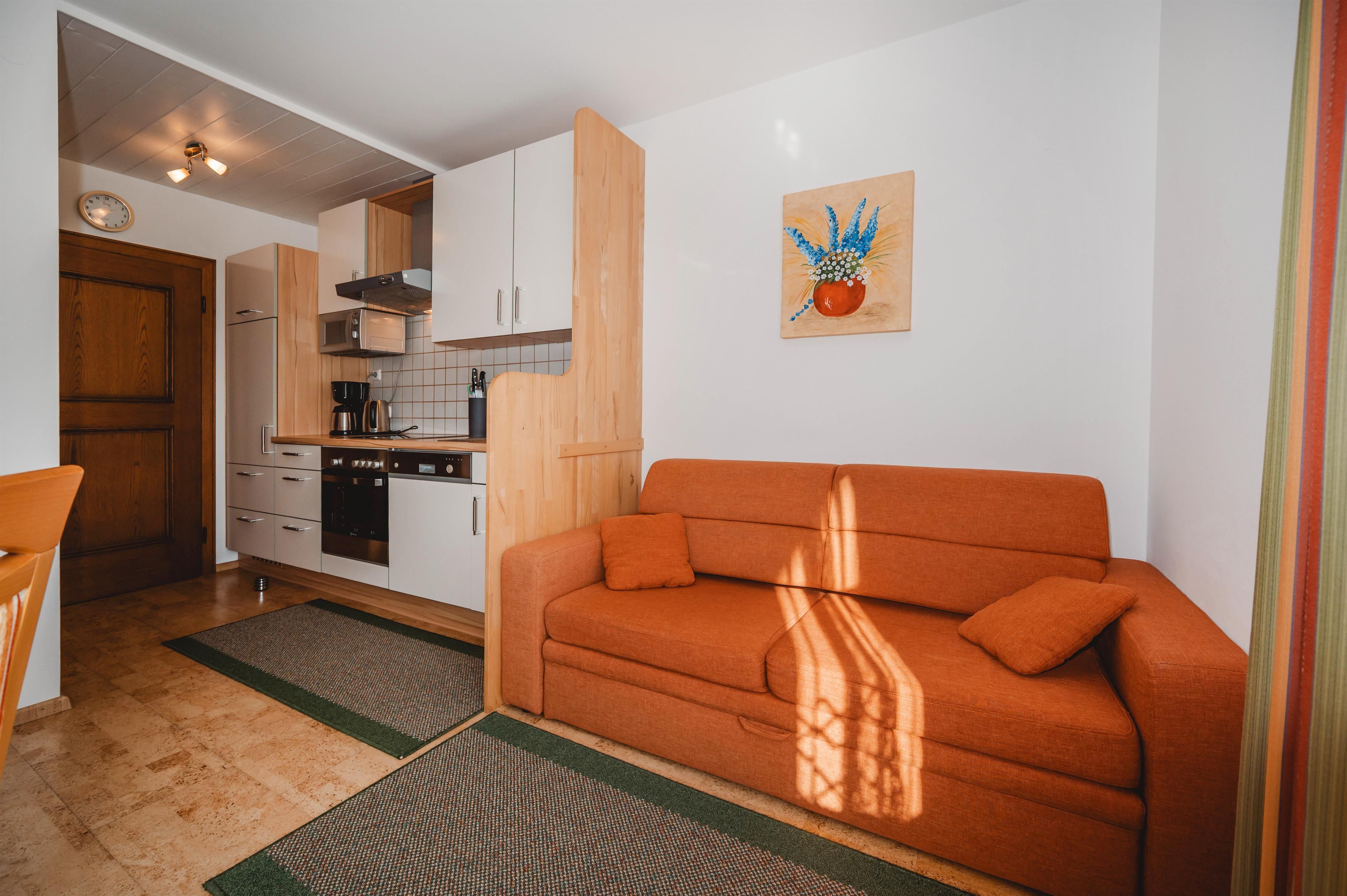 • Wohn-Küche mit Essecke, Couch ( ausziehbar )sowie Flatscreen-TV und Radio