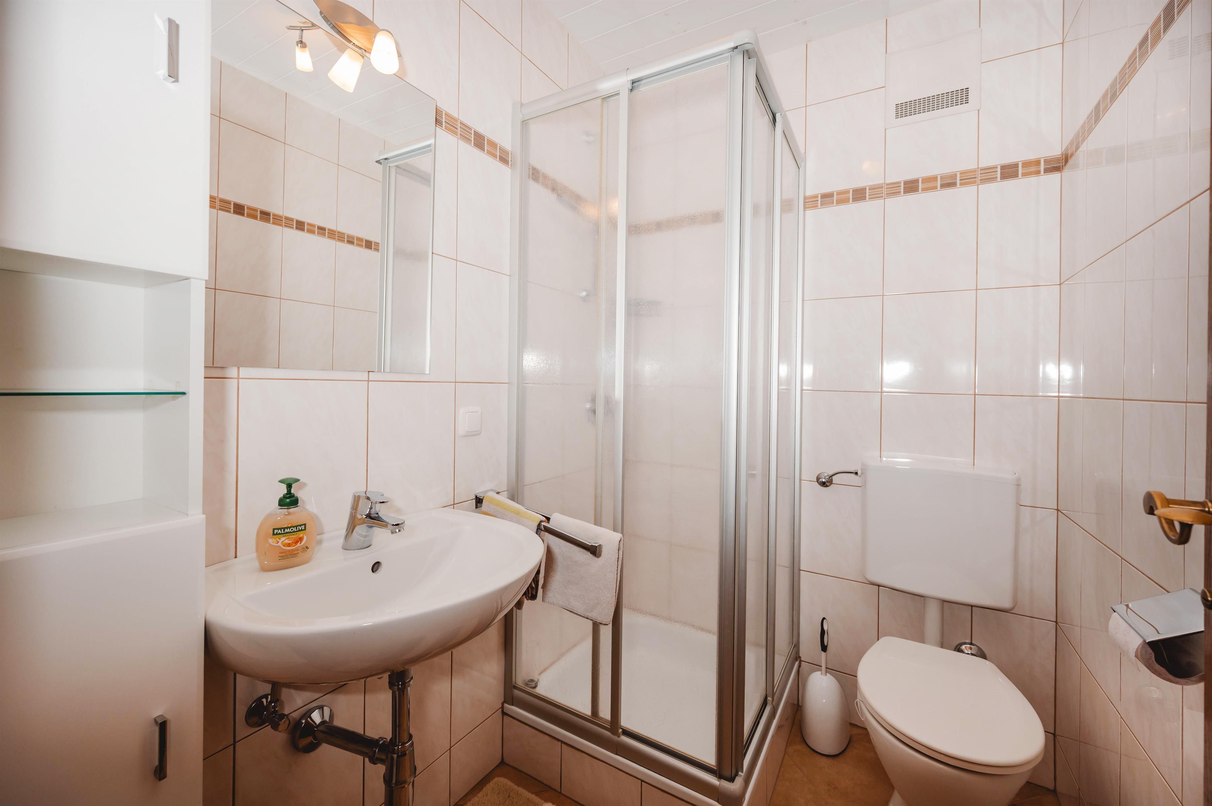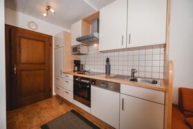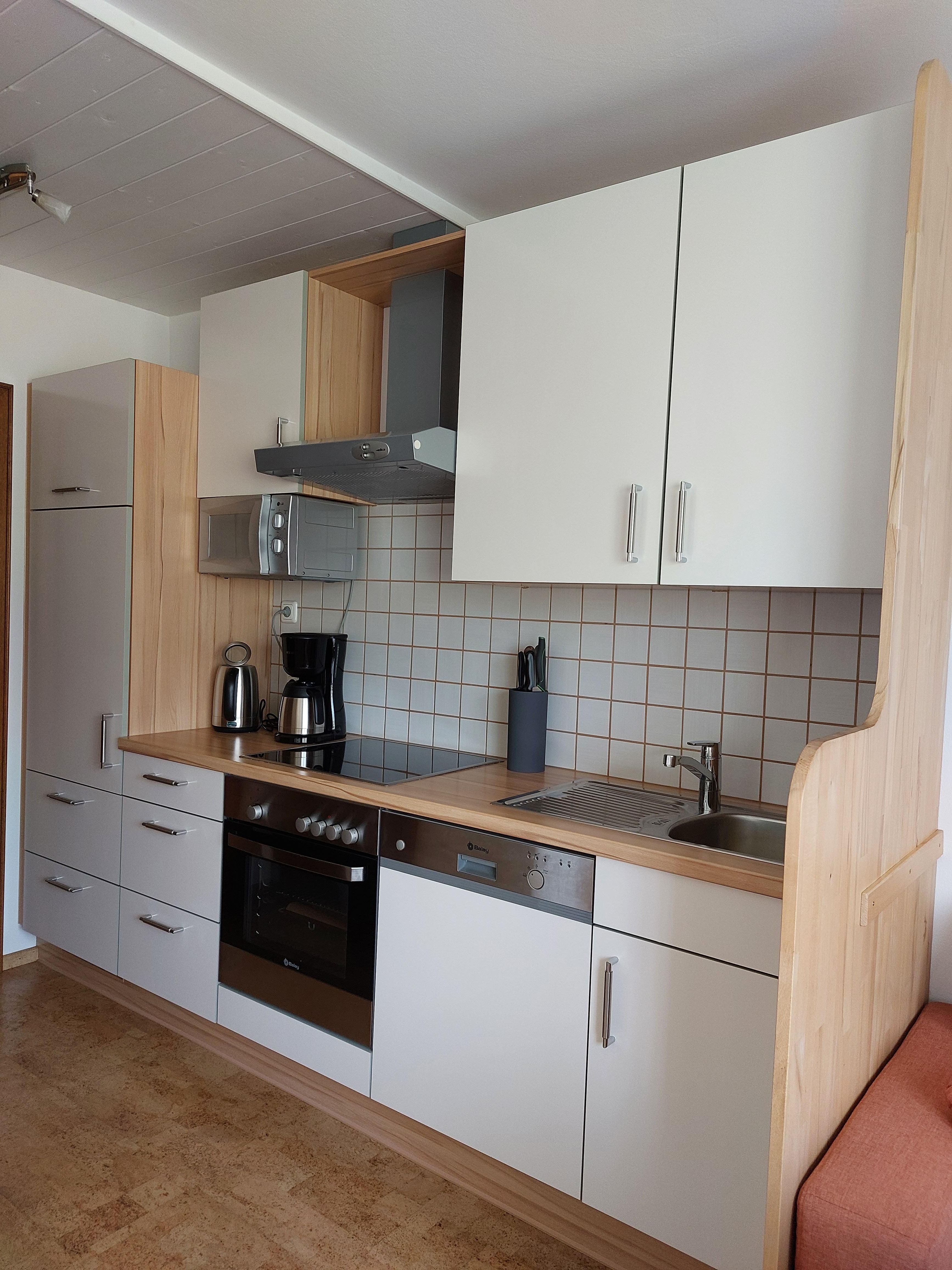 • Küche mit E-Herd, Backrohr, Kühlschrank, Mikrowelle, Wasserkocher, Geschirrspüler und allem wichtigen Geschirr.
