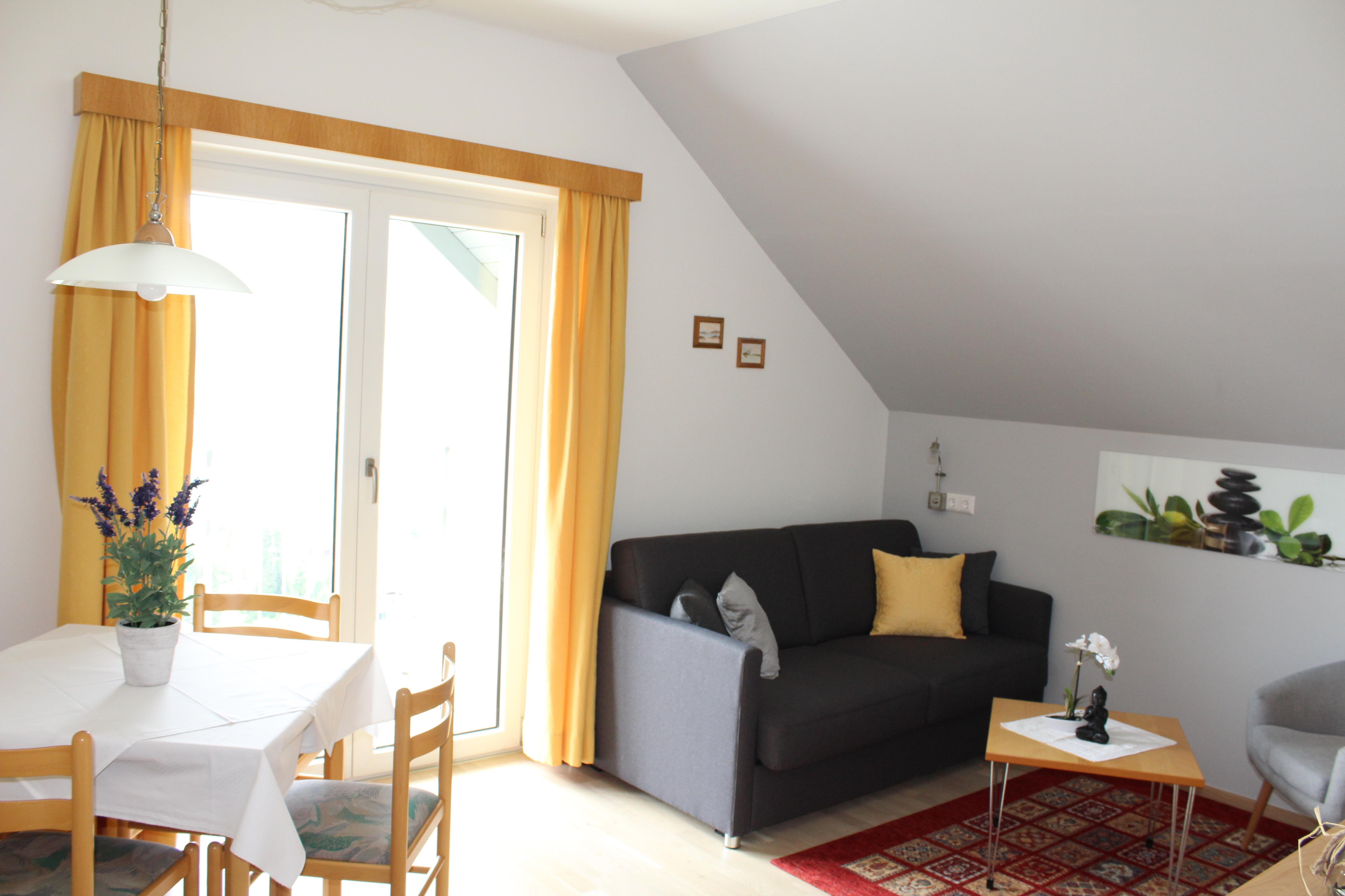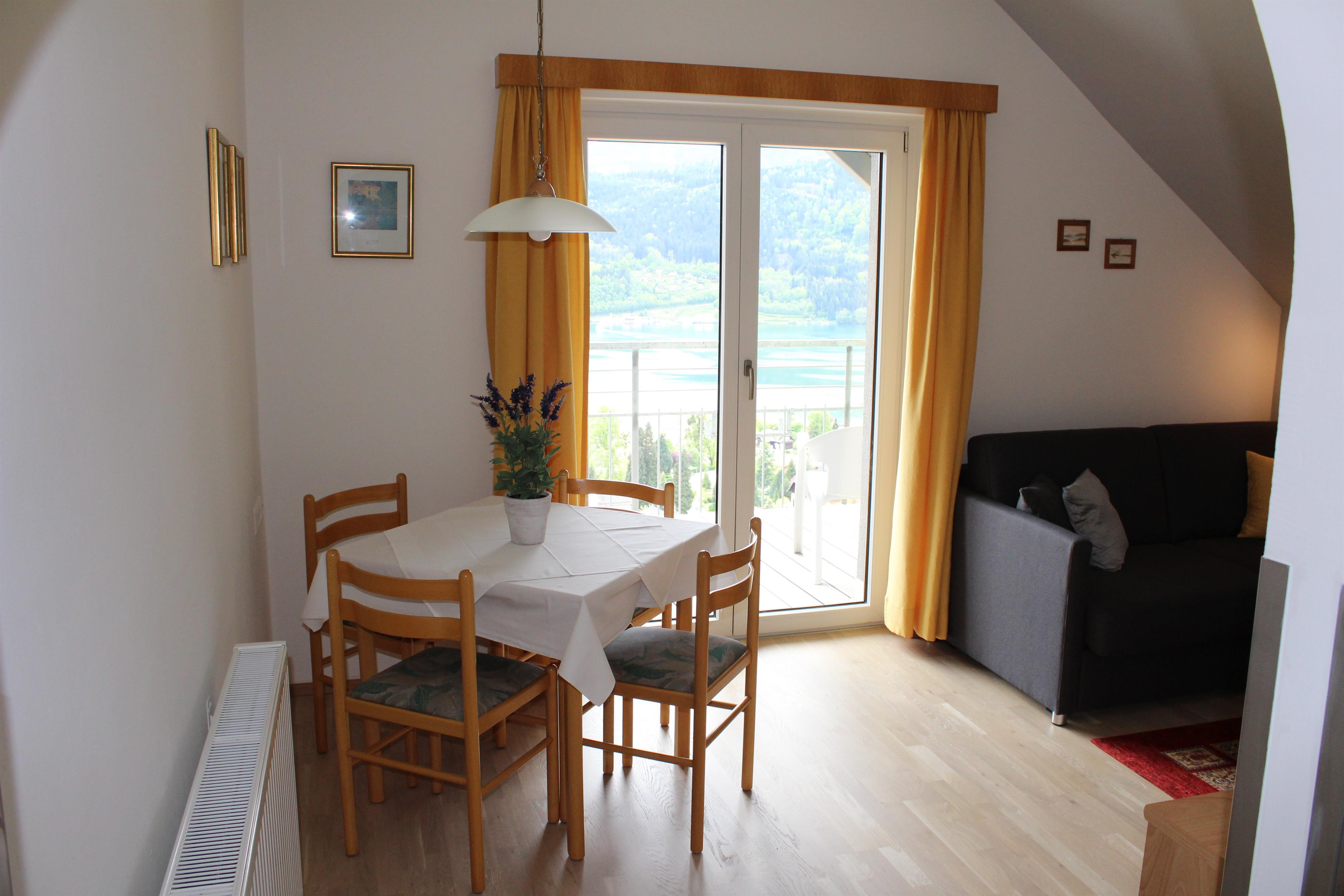 Ferienwohnung für 2 Personen mit 1 Schlafzimmer, 1 Wohnzimmer, Dusche/WC, voll eingerichtete Kochnische, Vorraum, WC extra, Radio, Sat-TV, großzügigen Balkon nach Süden mit Blick auf den See, den Ort Millstatt und die Berge.