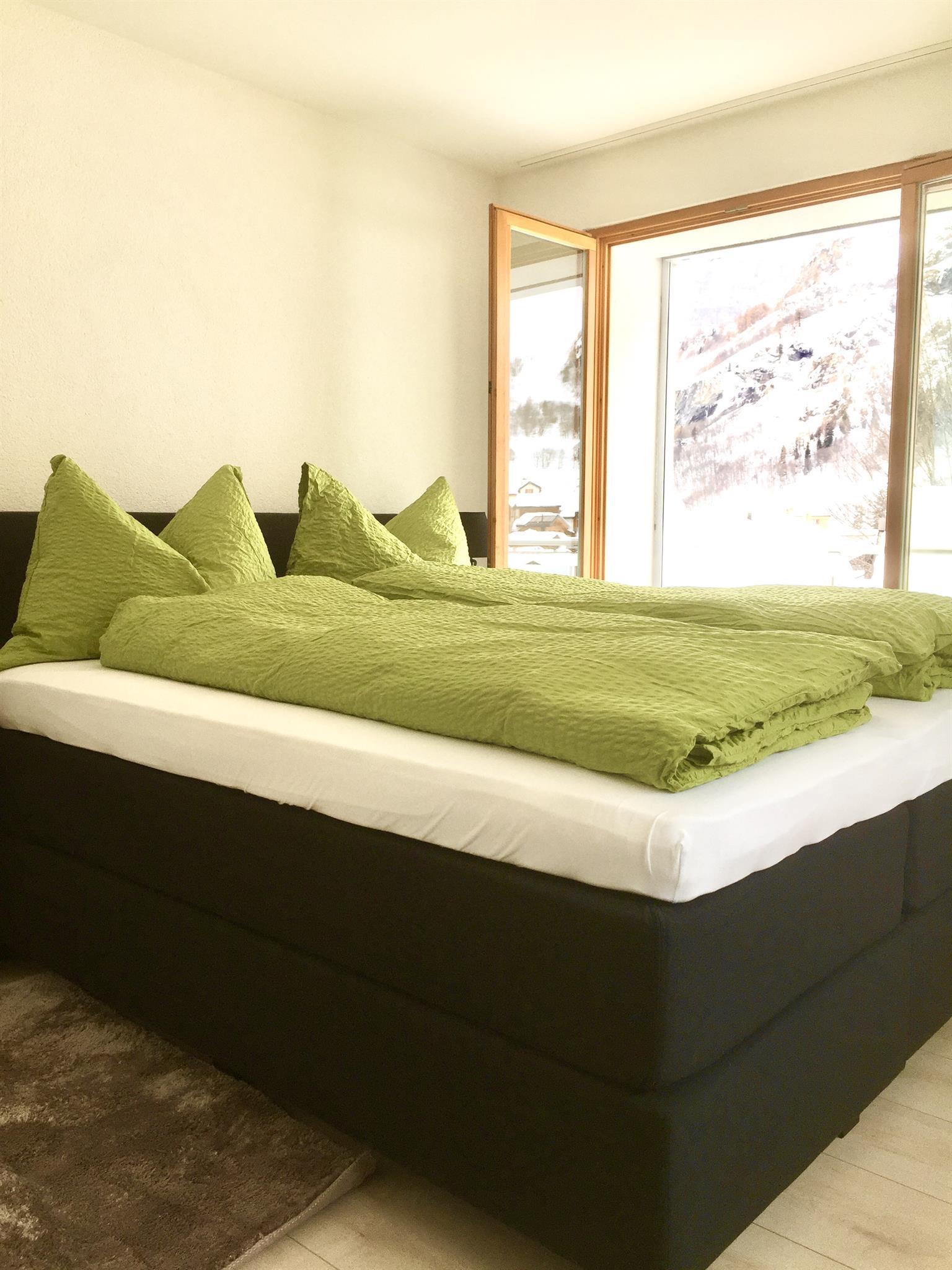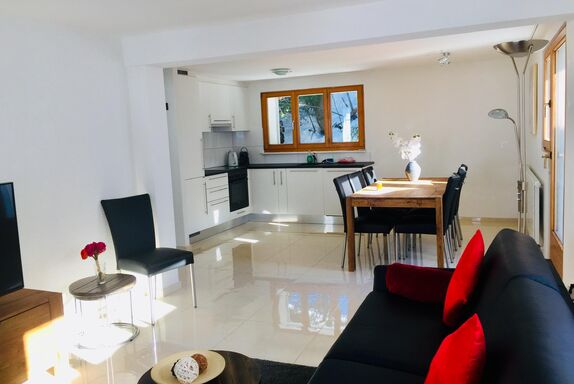 3-Zimmerwohnung: Wohnzimmer mit Doppel-Schlafsofa (160x2m), TV, Radio, gratis WiFi, moderne Wohnküche mit Esstisch, Geschirrspüler und Nespresso-Kaffeemaschine, 1 Schlafzimmer mit 1 Doppelbett, 1 Schlafzimmer mit 1 Doppelbett und 1 Einzelbett, Dusche/WC, Süd-Balkon. Aussenparkplatz ist direkt beim Vermieter zu mieten. Nichtraucherwohnung.