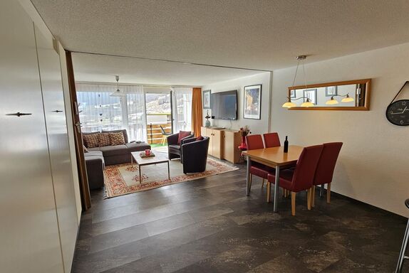 1-Zimmerwohnung (45m2): Wohn-/Esszimmer mit 2 Schrankbetten plus ein Doppelsofabett, offene Küche mit Geschirrspüler, Dusche/WC, Süd-Balkon, Radio, TV, gratis WiFi. Garage vorhanden. Ruhige Lage. In nächster Nähe: Haltestelle Ortsbus.