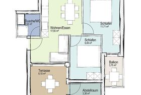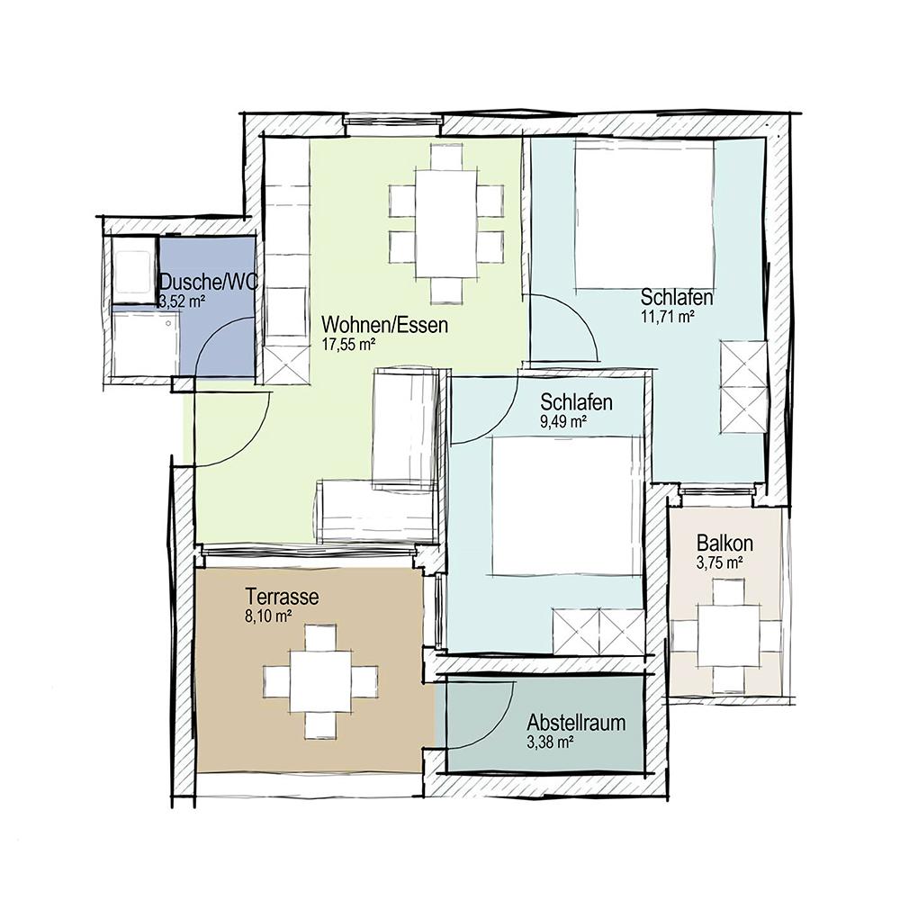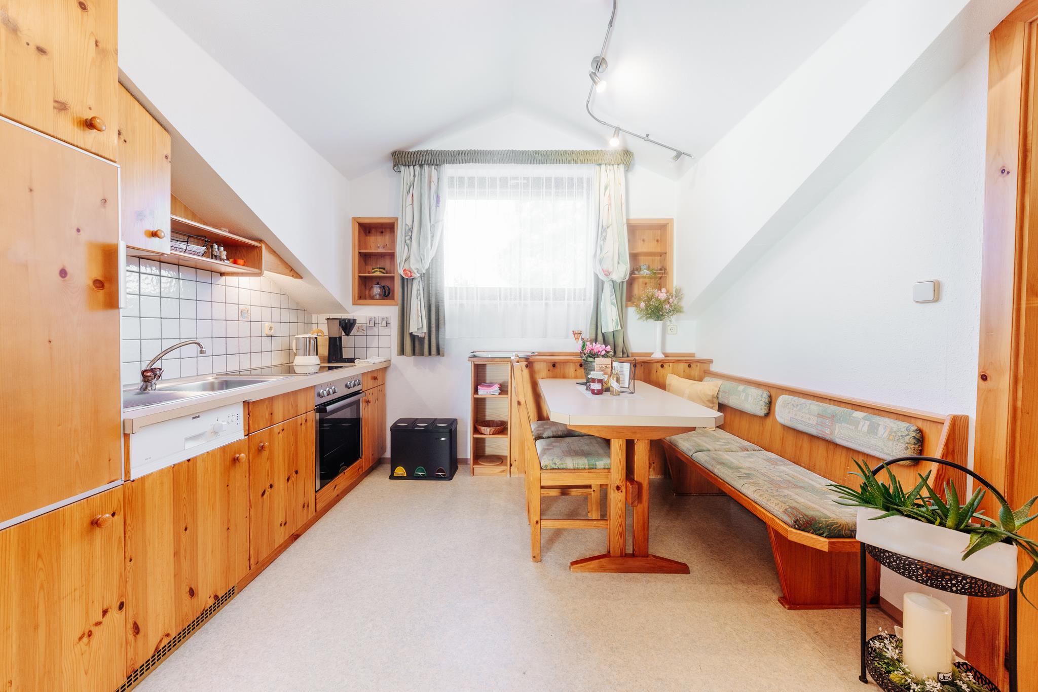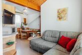 Die Ferienwohnung ist 46m² groß, bietet Platz für 4 Personen und beinhaltet zwei getrennte Schlafzimmer. Ein Schlafzimmer verfügt über ein Doppelbett mit Zugang zu einem eigenen Balkon, das zweite über ein Doppelbett. Weiters gibt es ein Wohnküche mit einer Essecke und eine Dusche mit WC. Die Wohnung verfügt zusätzlich über eine Sat/TV Anlage, Geschirrspüler, Kaffeemaschine, Küchenutensilien, Geschirr-, Handtücher und Bettwäsche. Sie liegt im 1.OG und ist an eine Dachterrasse angeschlossen, welche Sitzmöglichkeiten sowie einen Blick über den Turnersee und die Karawanken bietet.