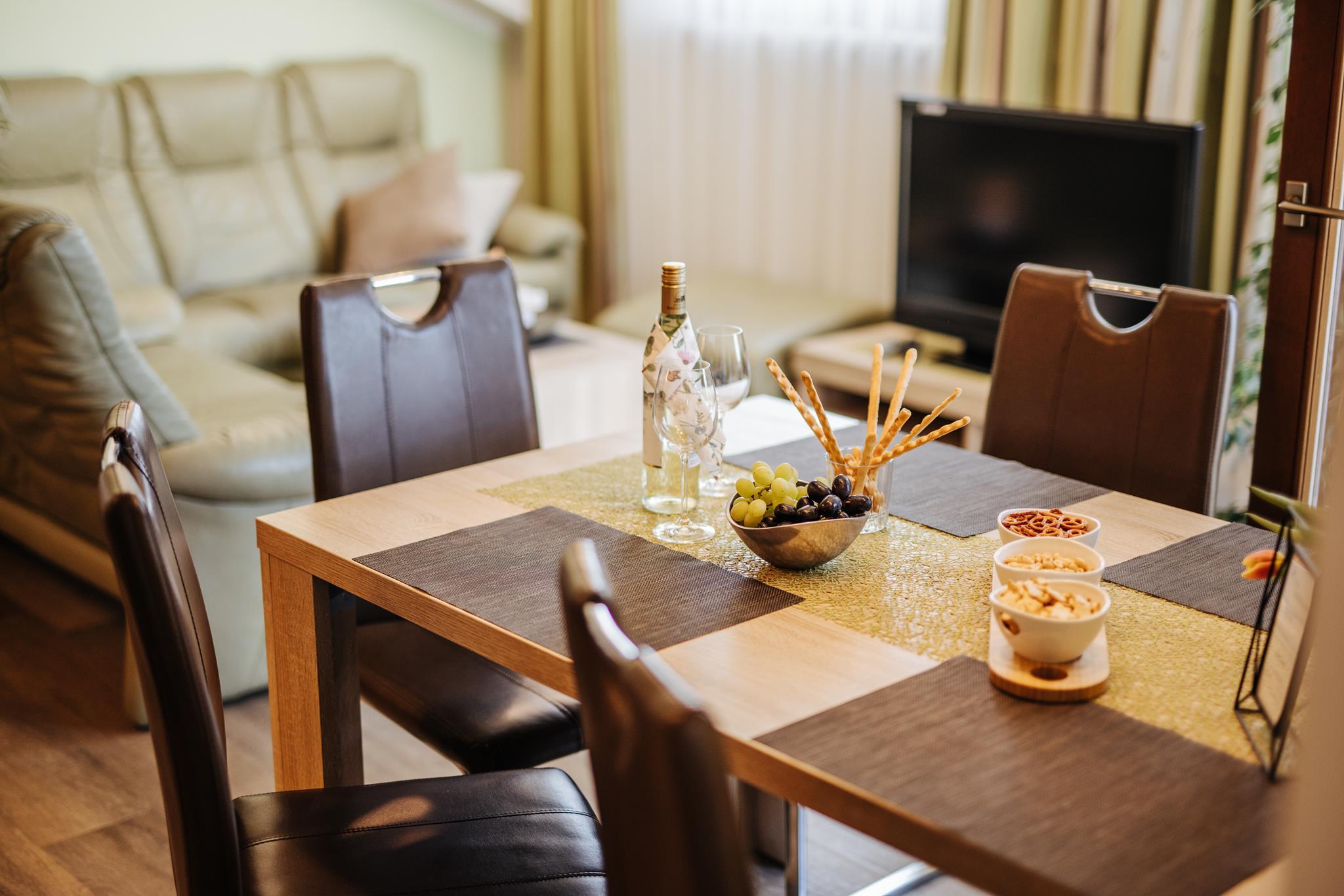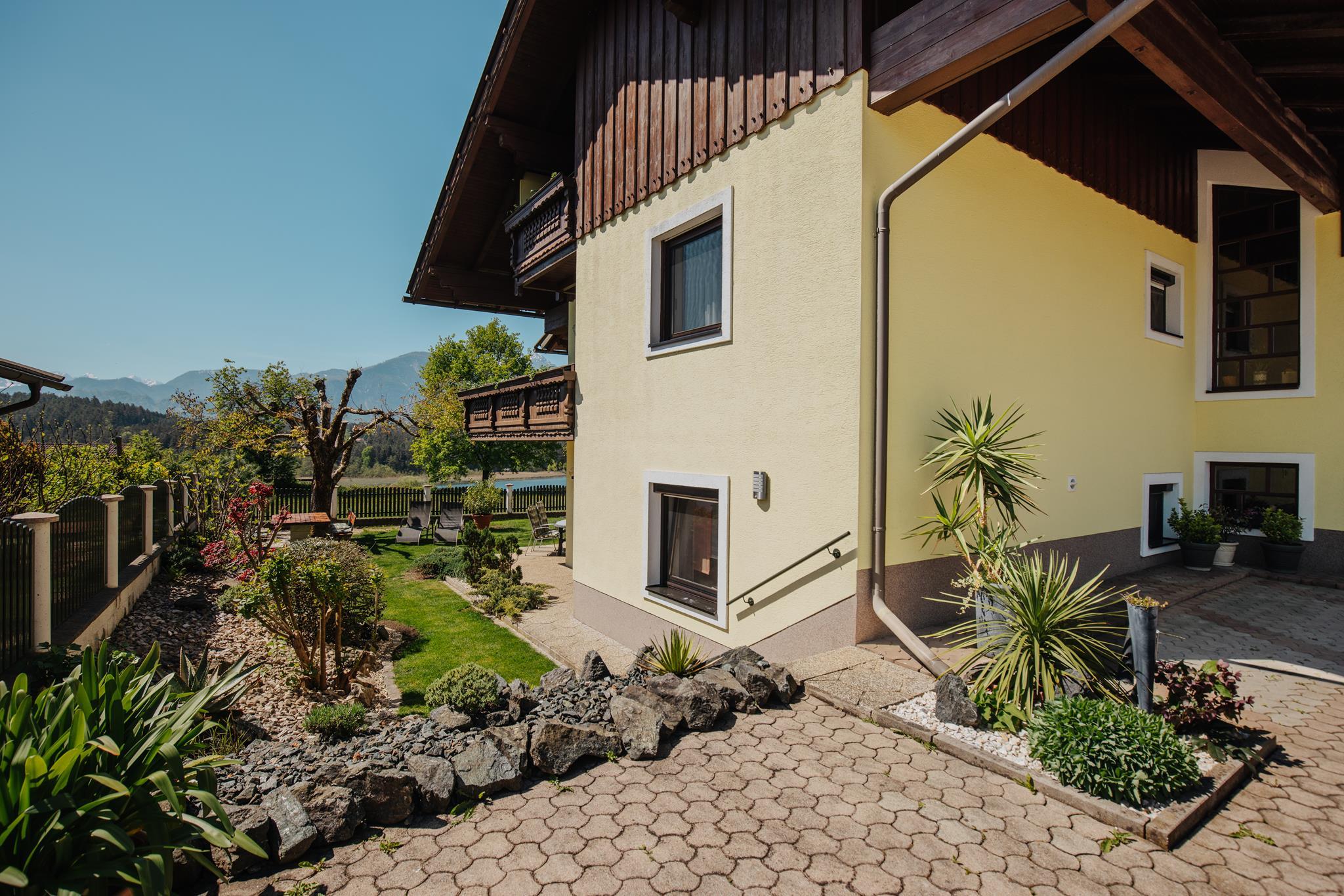 Die Ferienwohnung ist 58m² groß, bietet Platz für 5 Personen und beinhaltet zwei getrennte Schlafzimmer. Eines der Schlafzimmer verfügt über ein Doppelbett und ein Schlafsofa, das zweite über zwei Singlebetten. Weiters gibt es eine Wohnküche mit einer Essecke, Dusche mit WC und einen Vorraum. Die Wohnung verfügt zusätzlich über eine Sat/TV Anlage, Geschirrspüler, Kaffeemaschine, Küchenutensilien, Geschirr-, Handtücher und Bettwäsche. Sie liegt im 1.OG und ist an eine Dachterrasse angeschlossen, welche Sitzmöglichkeiten sowie einen Blick über den Turnersee und die Karawanken bietet.