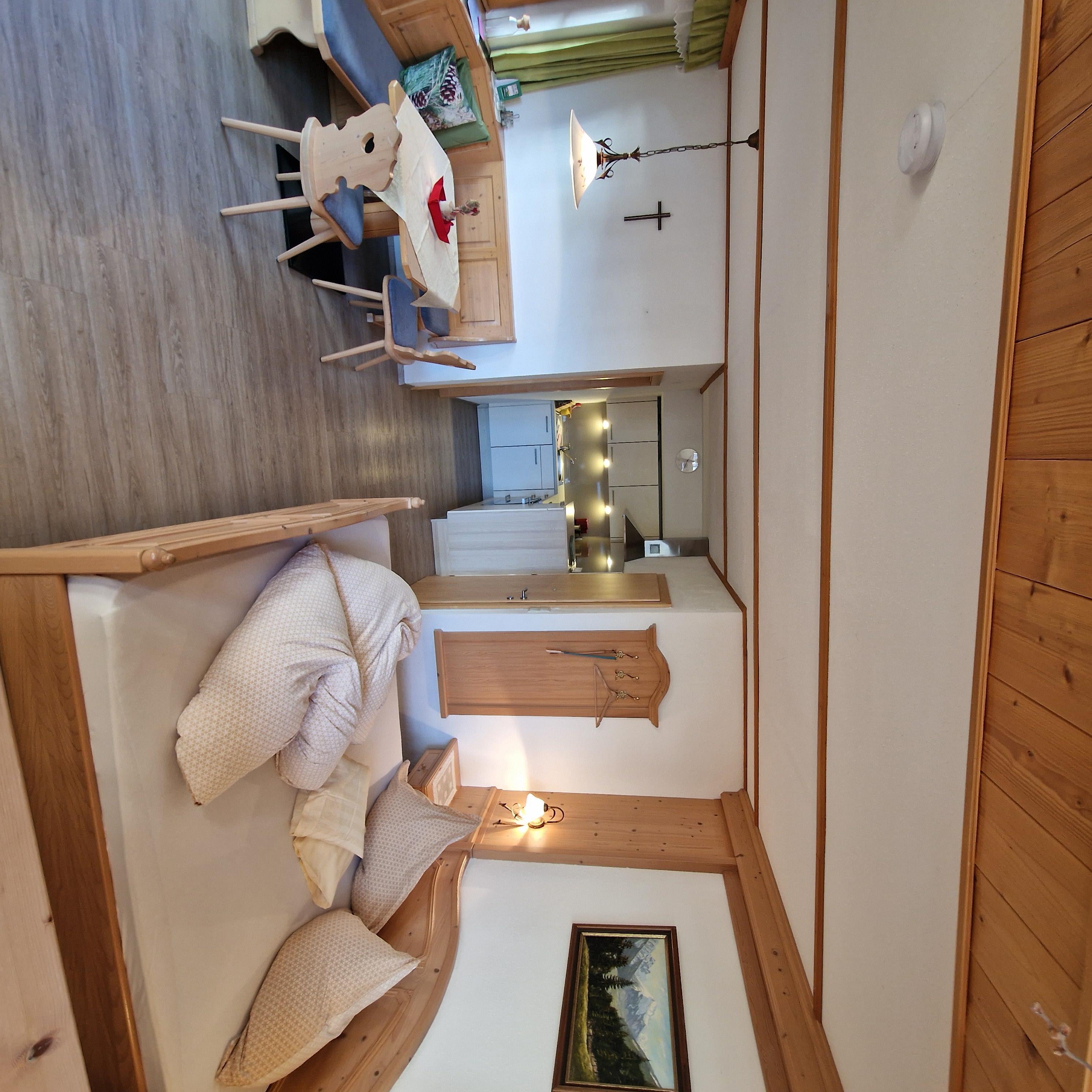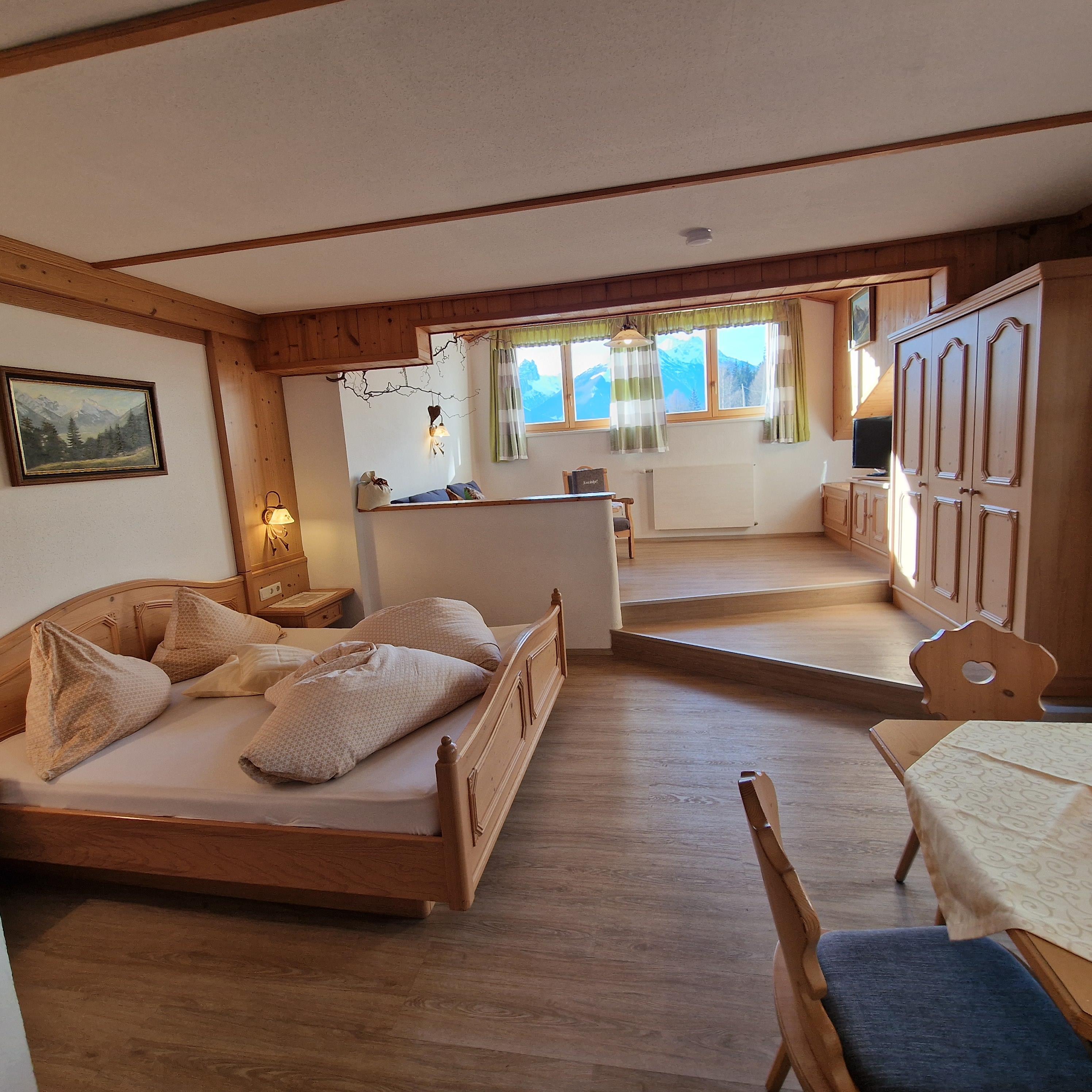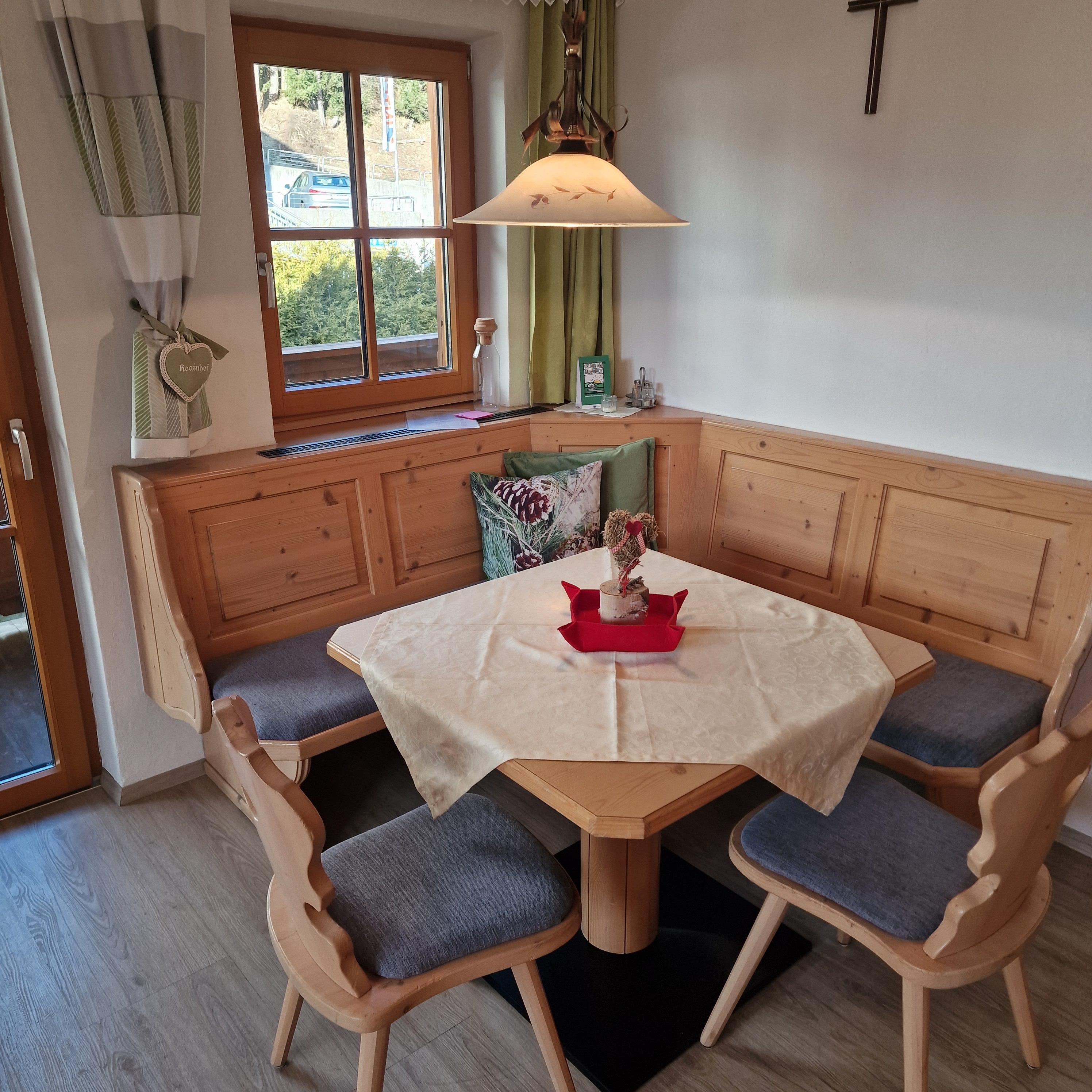 ... Wohnstudio mit erhöhtem Wohnbereich, Sat-TV und Dachgaube mit Blick ins Tal und auf den Elfer, gemütliche eingebaute Essecke und Ausgang zum Balkon mit Waldblick und Talstation zum Schigebiet Schlick 2000, eine neue Küche mit kompletter Ausstattung (Spülmaschine, Kochplatte, Kaffeemaschine, Wasserkocher, Gefrierfach und genügend Geschirr), geräumige Dusche & WC & Fön neu gestaltet