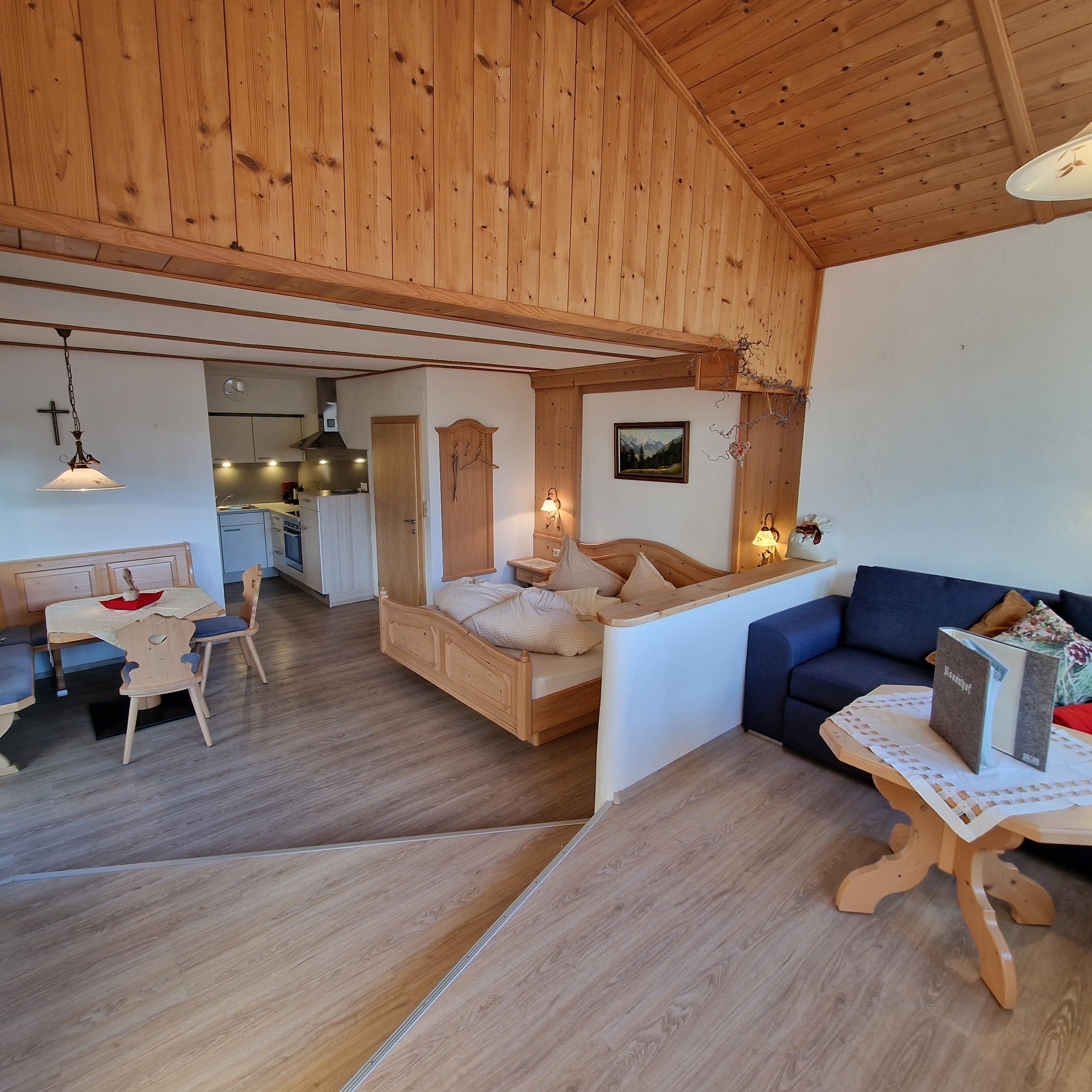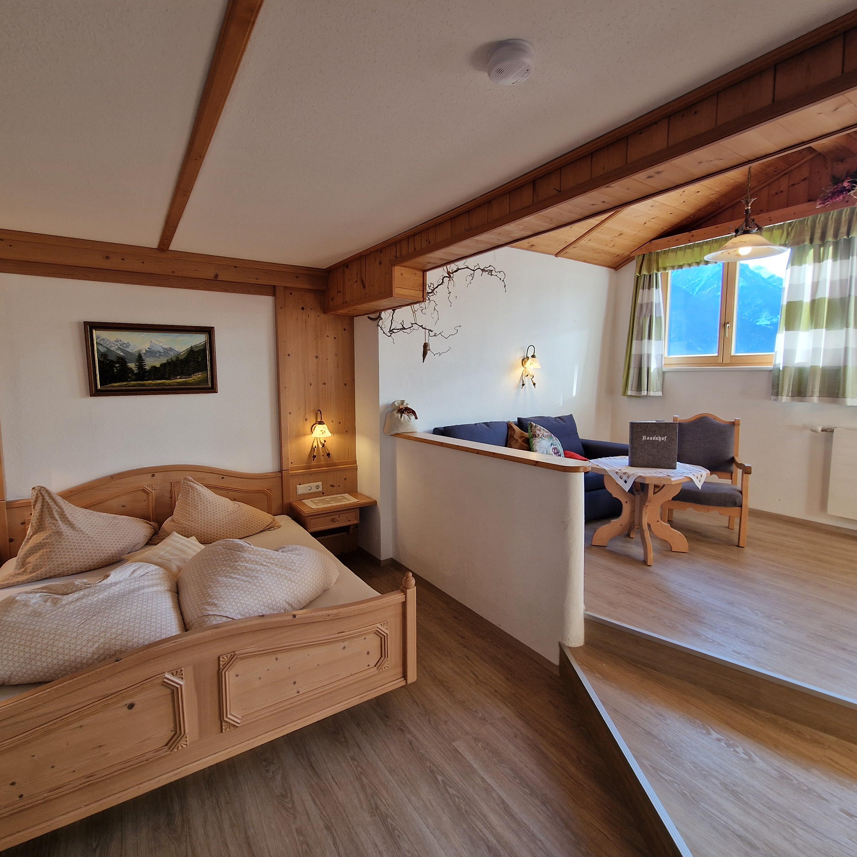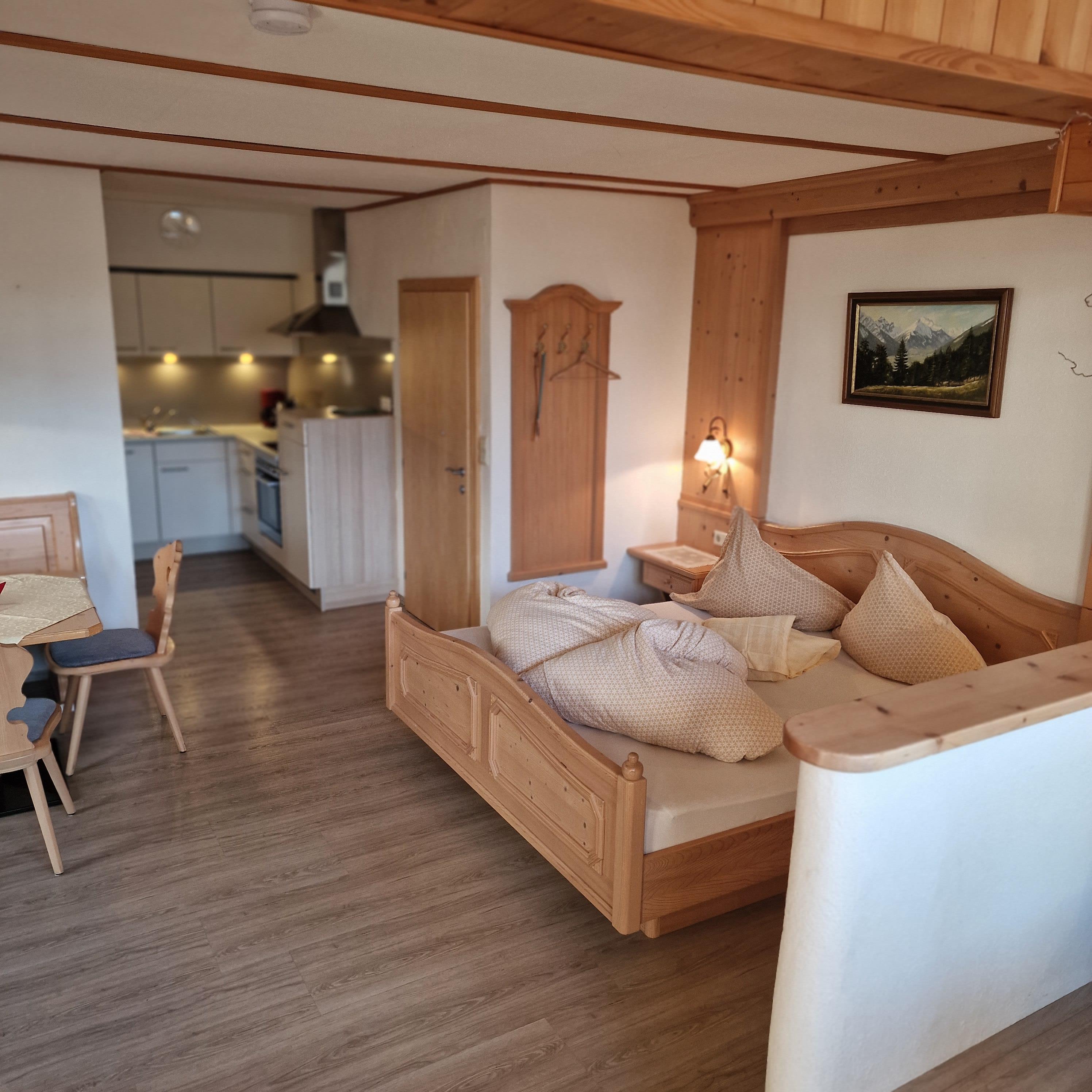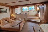 ... Wohnstudio mit erhöhtem Wohnbereich, Sat-TV und Dachgaube mit Blick ins Tal und auf den Elfer, gemütliche eingebaute Essecke und Ausgang zum Balkon mit Waldblick und Talstation zum Schigebiet Schlick 2000, eine neue Küche mit kompletter Ausstattung (Spülmaschine, Kochplatte, Kaffeemaschine, Wasserkocher, Gefrierfach und genügend Geschirr), geräumige Dusche & WC & Fön neu gestaltet