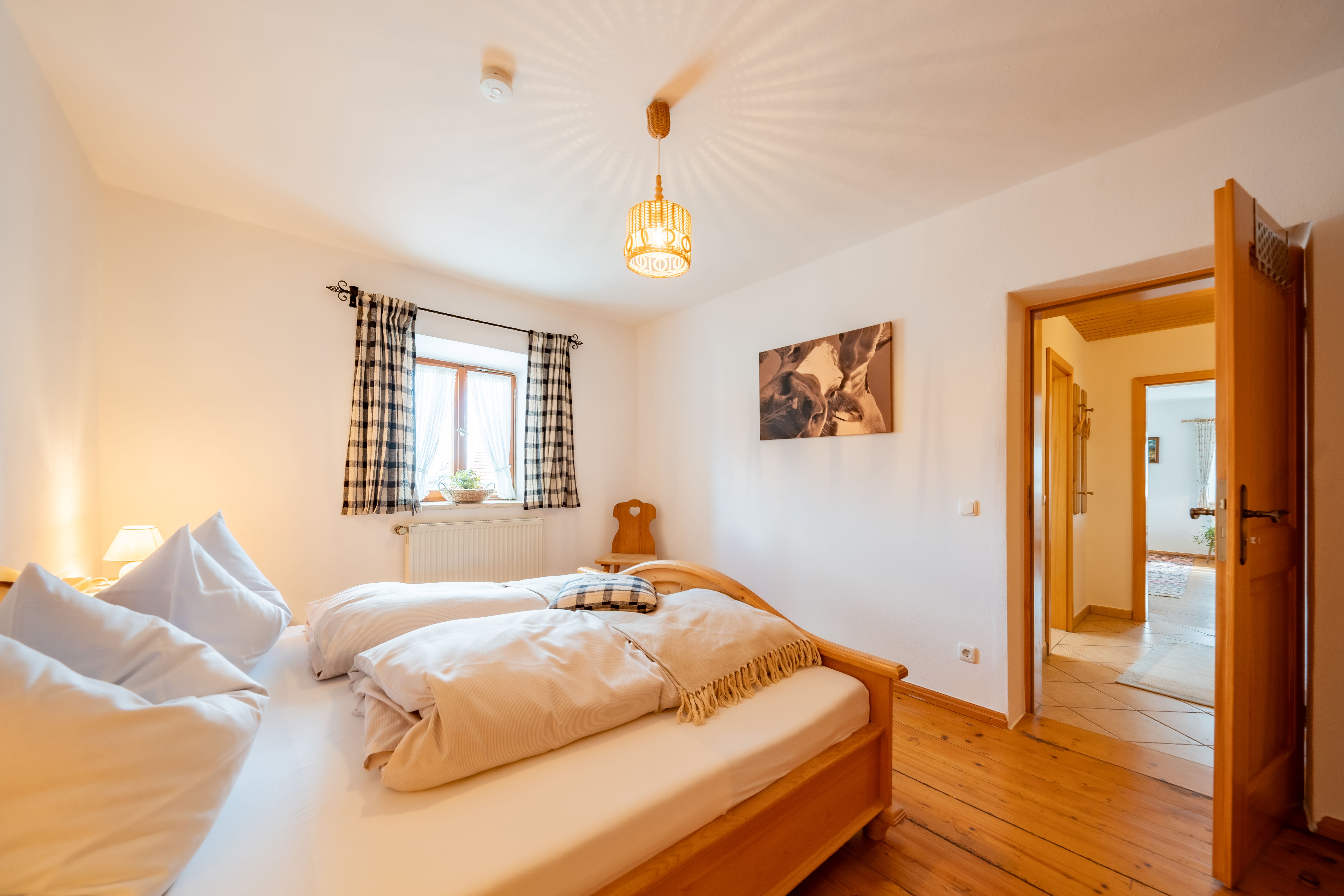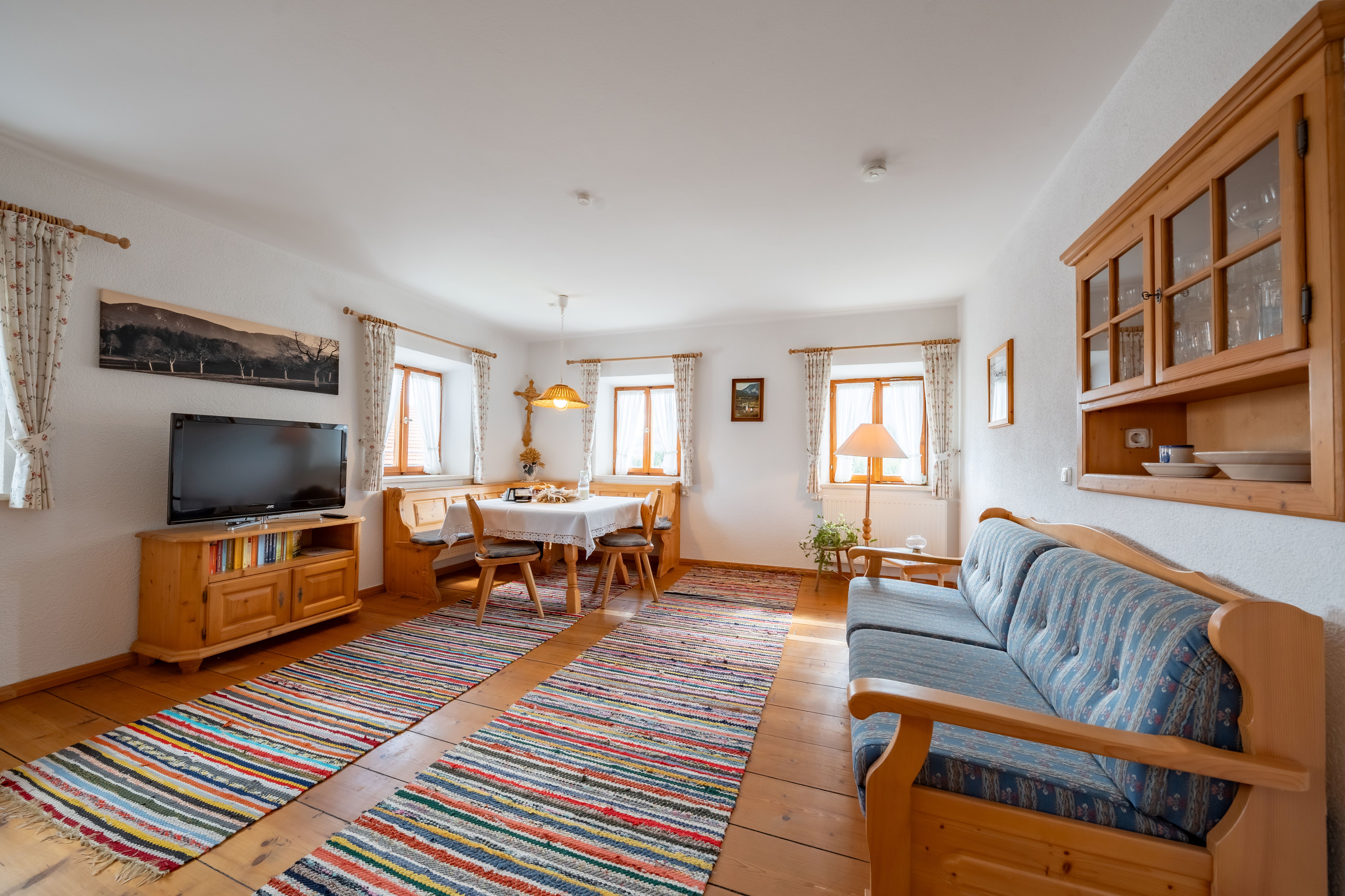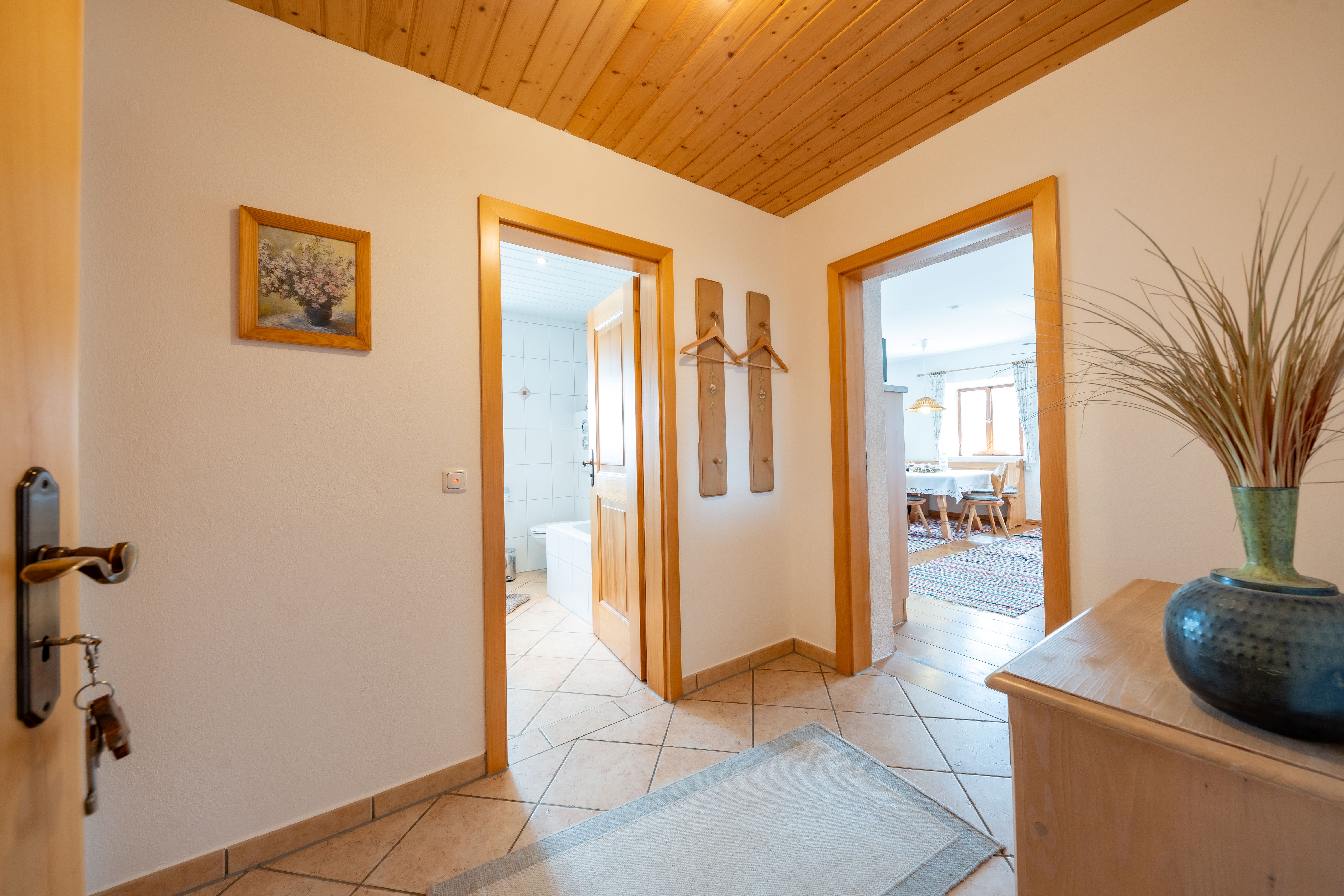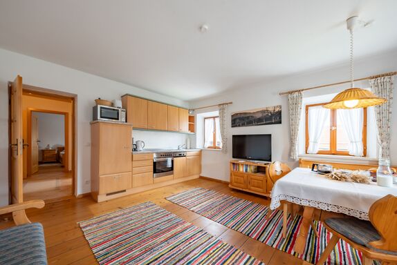 Diese Ferienwohnung liegt im ersten Stock unseres Bauernhauses und bietet Platz für bis zu vier Personen. Die urig eingerichtete Stube wurde früher die gute Kammer genannt. Dort lässt es sich am großen Tisch der Essecke die Ausflüge planen oder Sie stöbern auf der gemütlichen, ausziehbaren Couch das Fernsehprogramm. Die Küchenzeile ist komplett ausgestattet mit Backofen, großem Kochfeld, Kaffeemaschine, Toaster, Mikrowelle, Wasserkocher, Kühlschrank mit Gefrierfach und Geschirrspülmaschine. Ein geräumiges Bad mit Dusche und Badewanne lässt nichts zu wünschen übrig. Aus dem mit Holzmöbeln ausgestattetem Schlafzimmer blicken Sie in das schöne Tal.