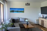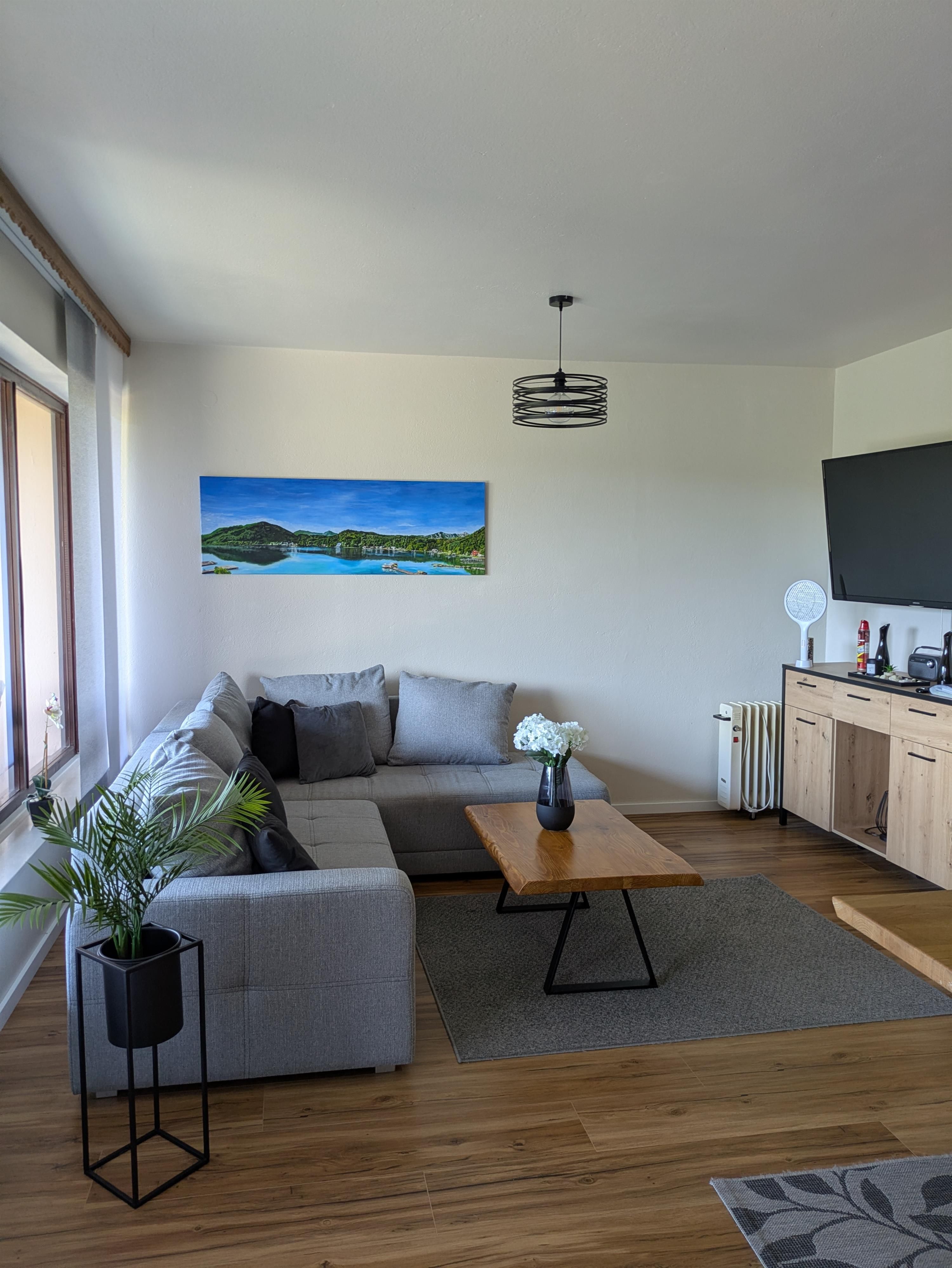 Im Wohnzimmer wird Anfang Juni 2024 noch ein neuer geräuscharmer Vinylboden verlegt. Neben einer modernen Couch (inkl. Schlaffunktion für einen möglichen 5ten Gast) haben (mit dem Couch- und Esstisch) zwei Echtholztische Einzug in diesem gemütlichen Bungalow erhalten. Das handgemalte Panoramabild vom Klopeiner See oberhalb der Couch rundet die Wohlfühlatmosphäre im Wohnzimmer entsprechend ab.