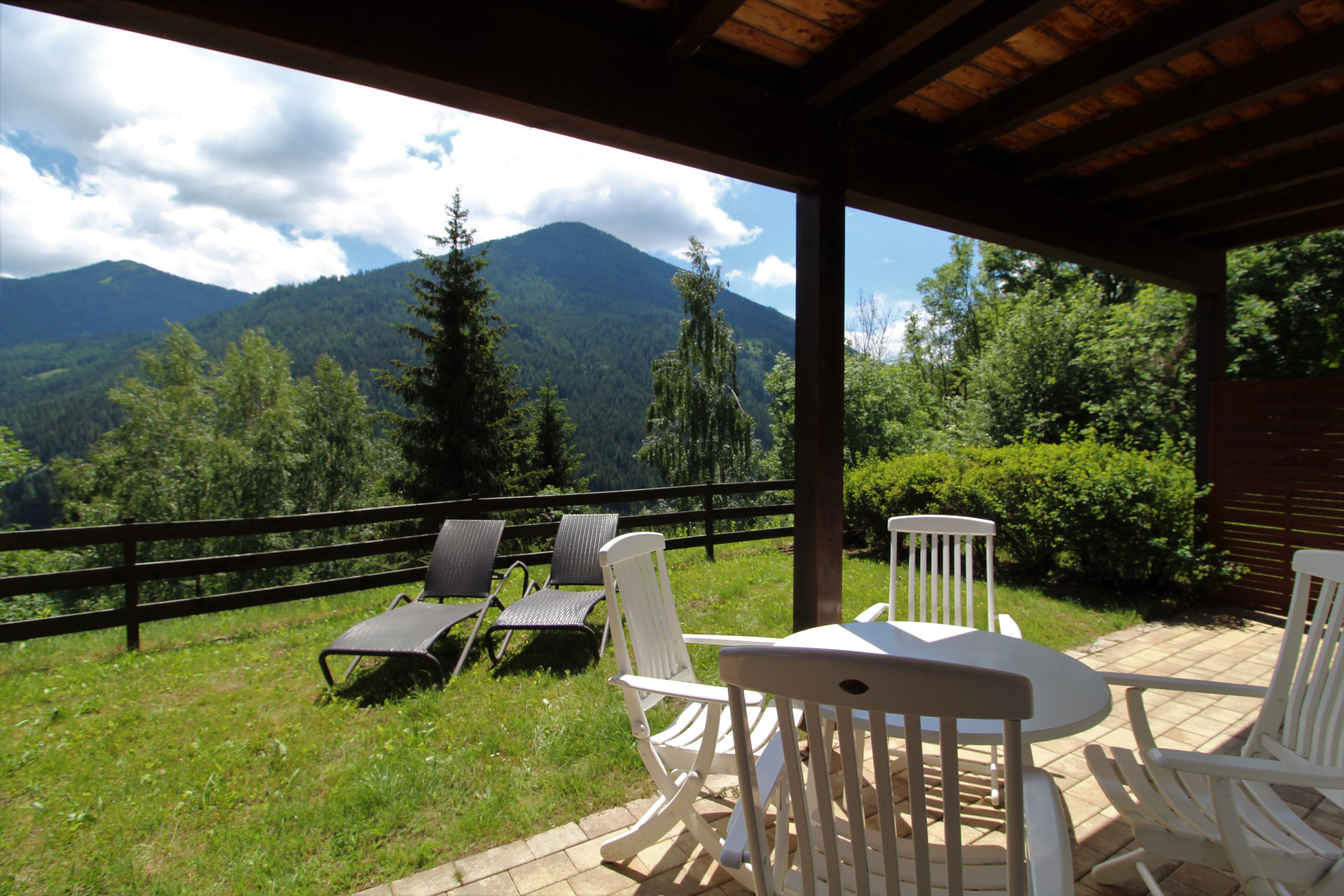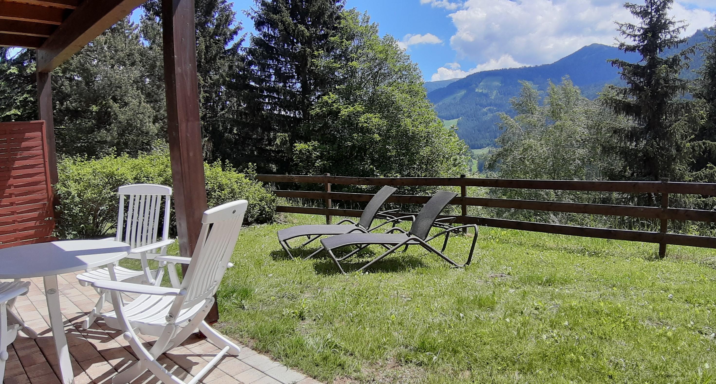 Wunderschöner Garten mit Sonnenliegen und Tisch und Stühlen unter der Veranda mit Blick auf die Berge und das Tal.