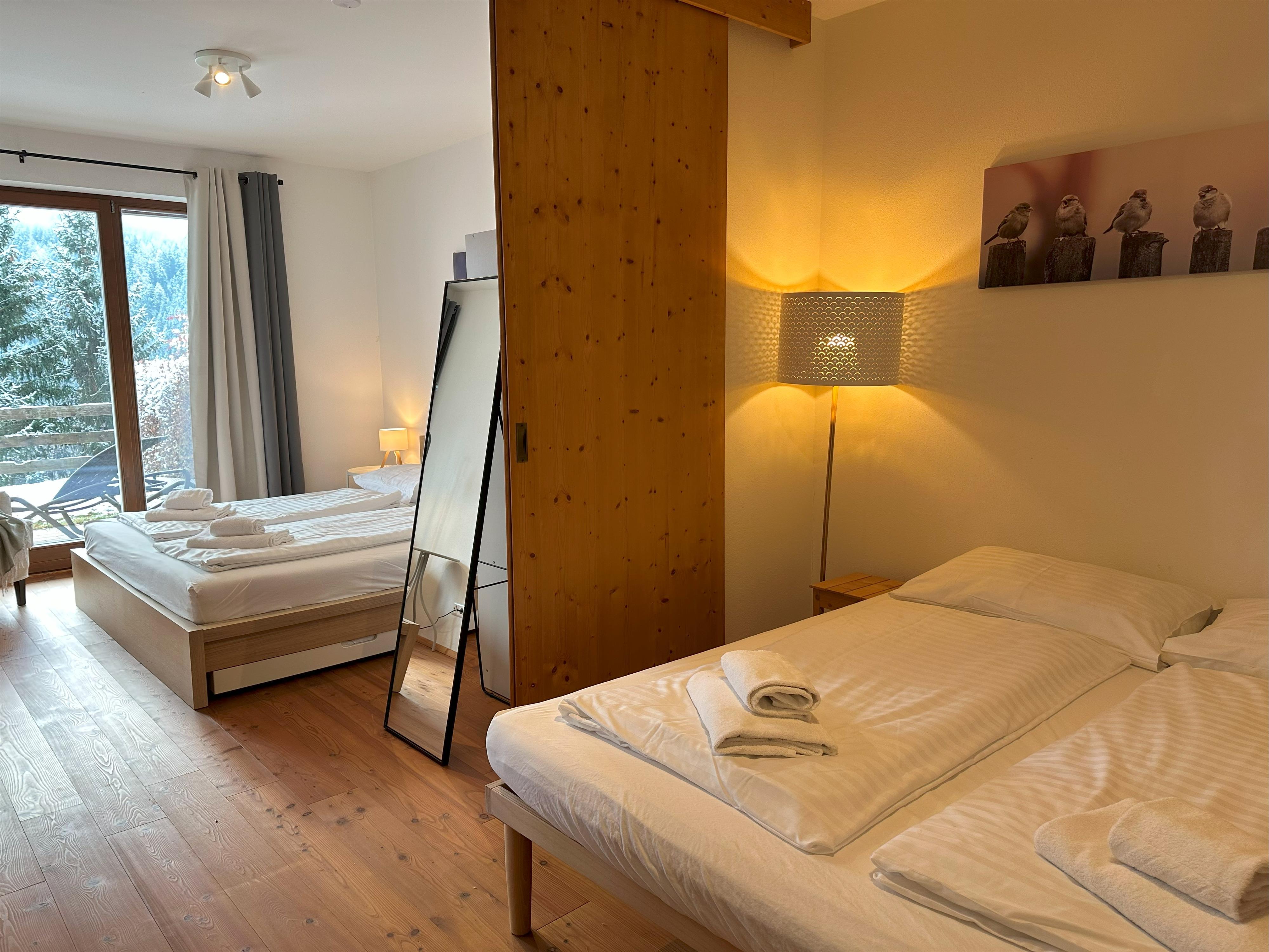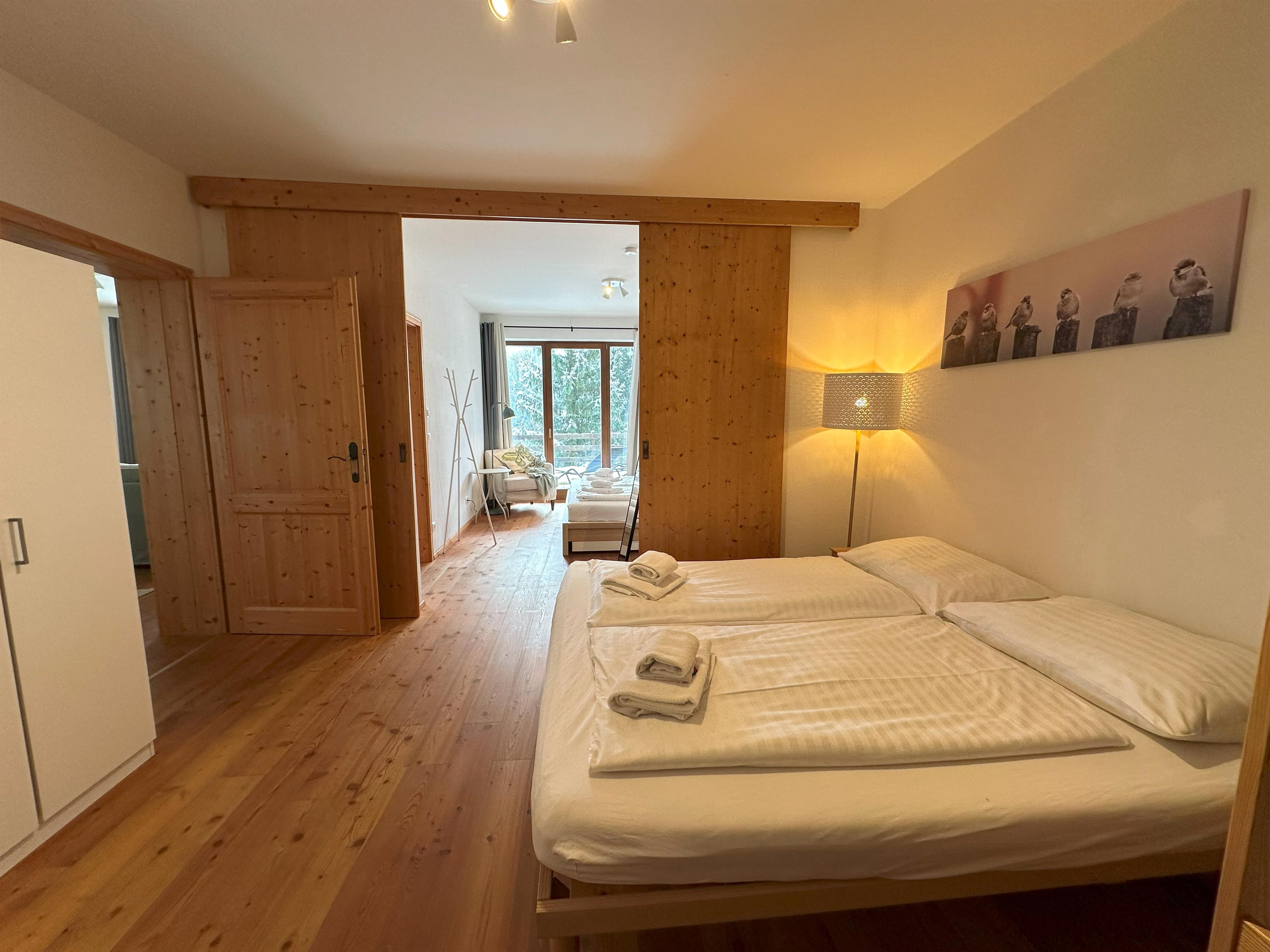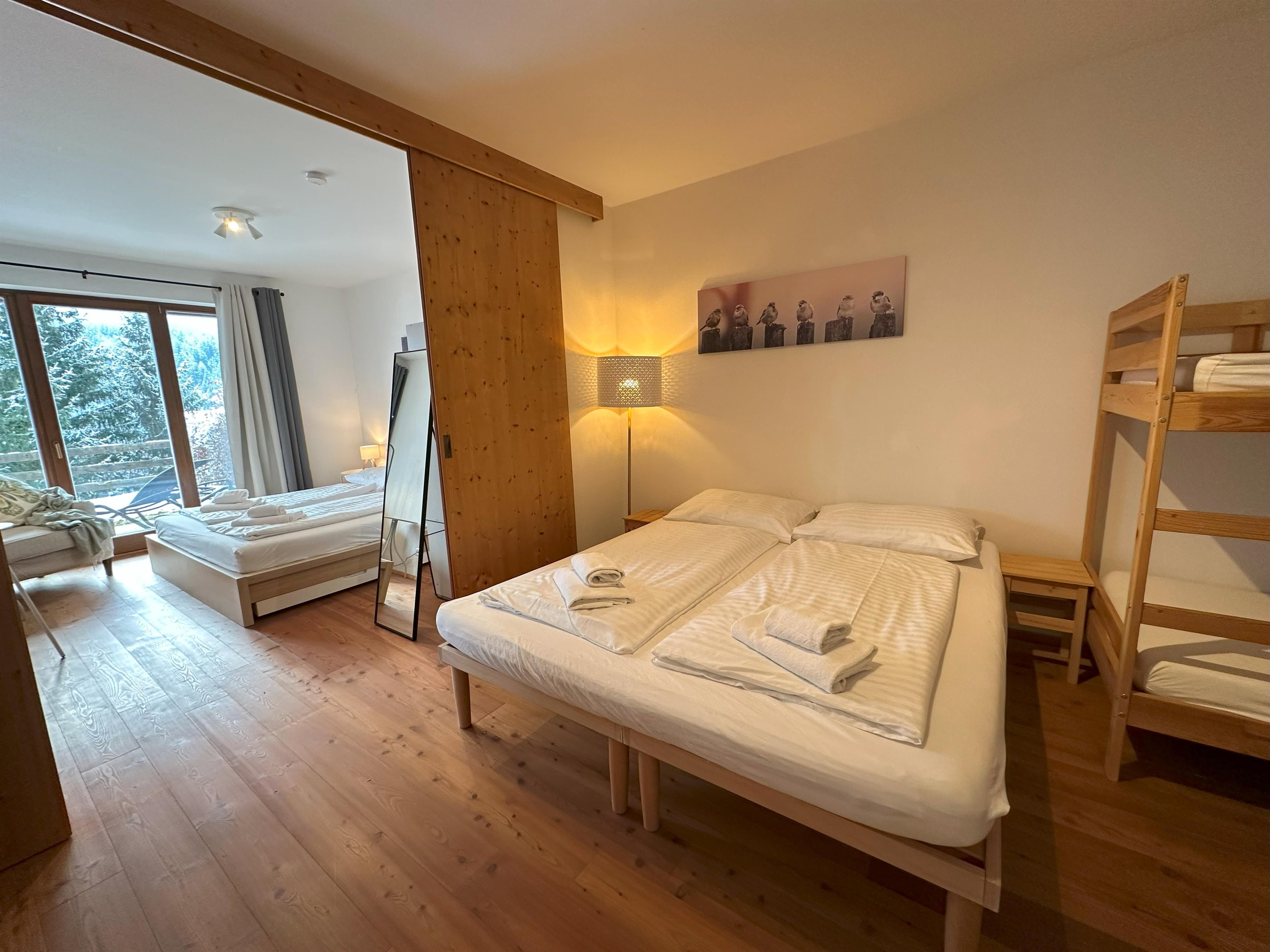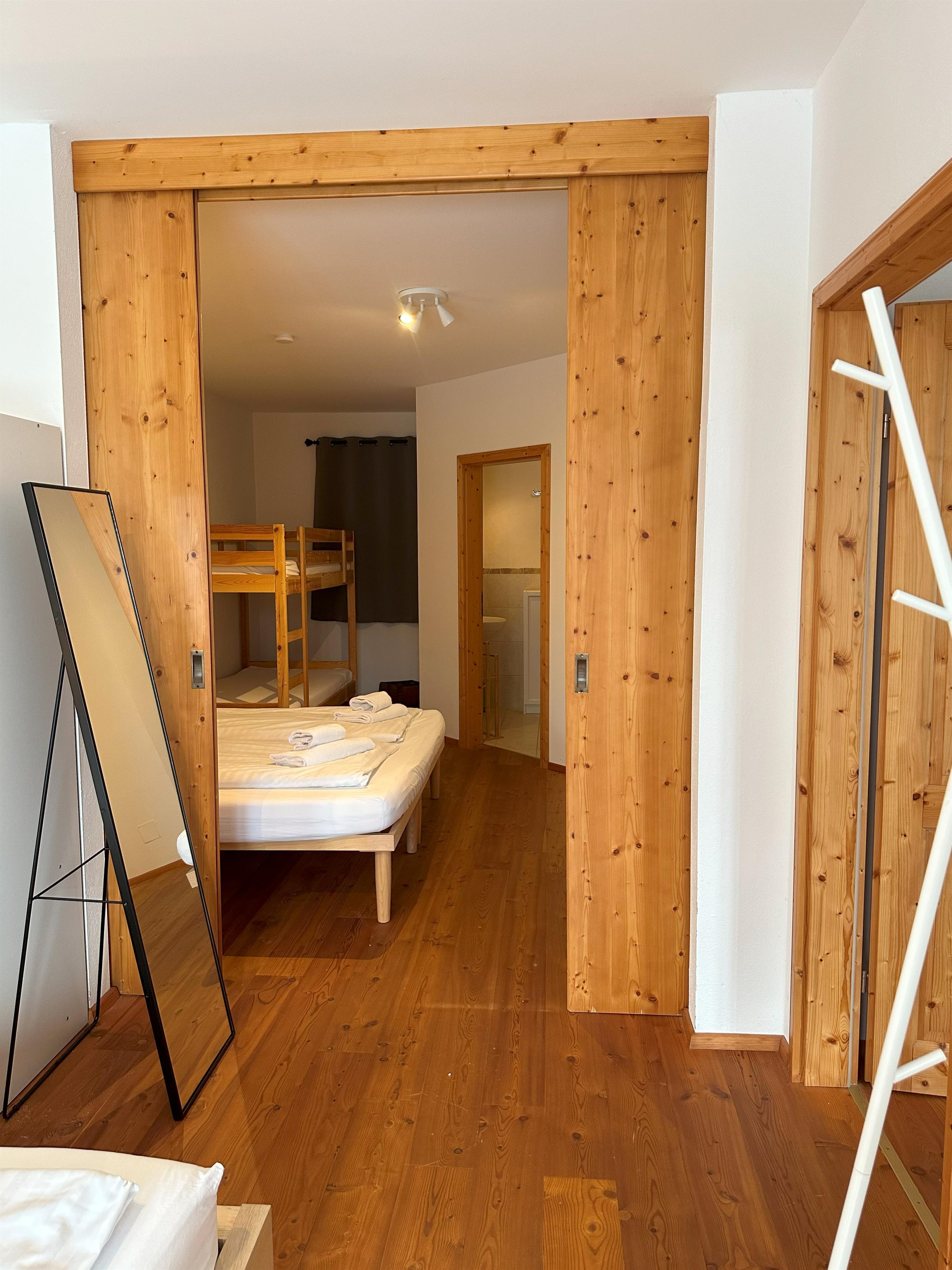 Wohnzimmer mit Küchenzeile mit Backofen und Geschirrspüler, Schlafsofa, Couch und großem Fenster zum Garten. Zwei große, mit einer Schiebetür kommunizierende Schlafzimmer bieten Platz für bis zu 6 Betten, aufgeteilt in zwei Doppelbetten und ein Etagenbett. Zwei Badezimmer (eines davon mit Waschmaschine) mit Waschbecken, Bidet, Dusche und WC. Ein Abstellraum in der Wohnung, ein Abstellraum im Keller für Sportausrüstungen und zwei Parkplätze.