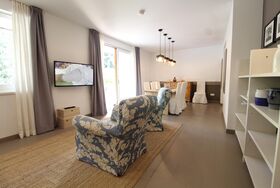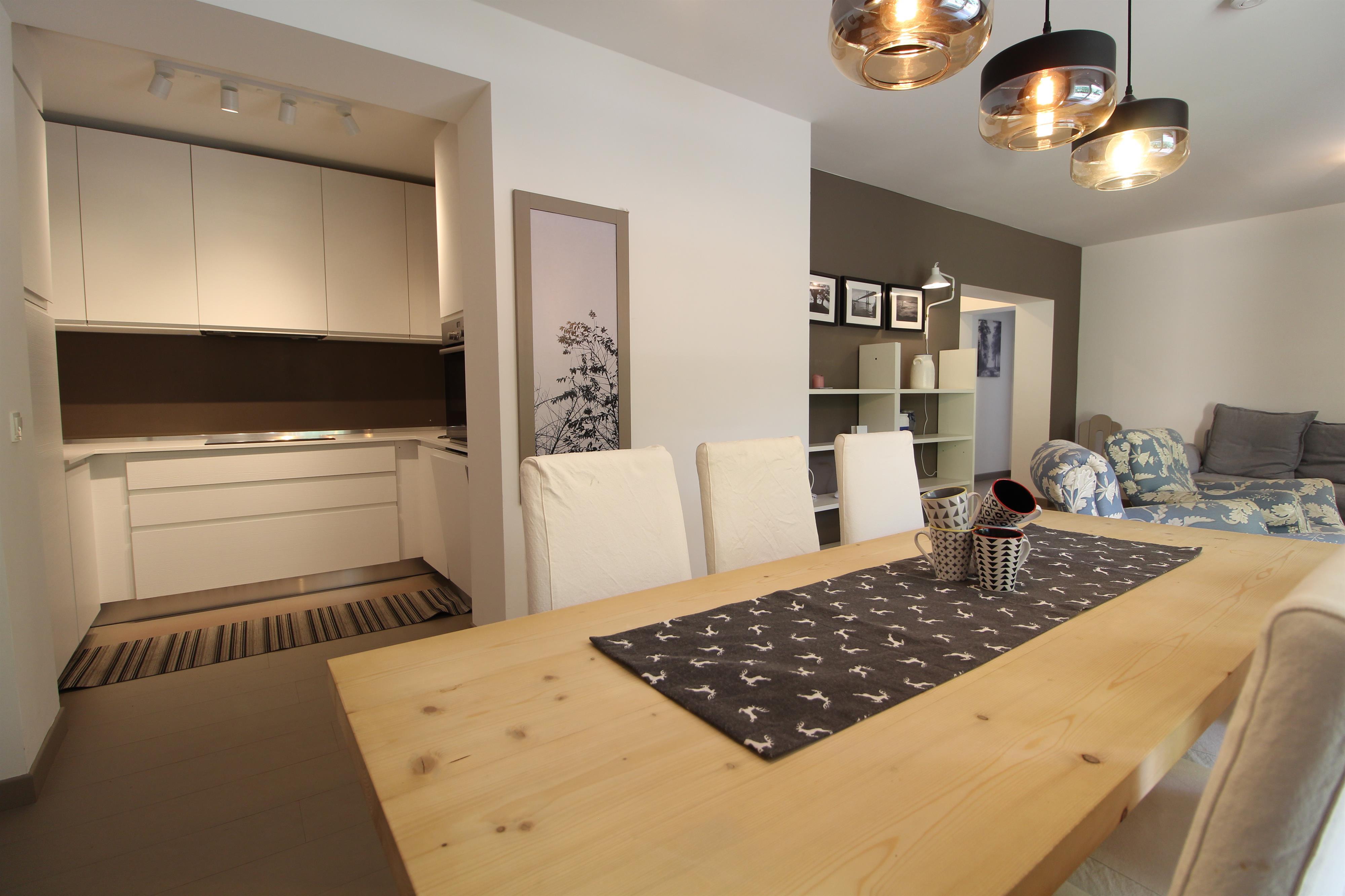 Es handelt sich um eine geräumige (ca. 100 qm groß) , helle Wohnung , im Ortsteil Zirkitzen. Die Wohnung besteht aus einen großen Wohnraum, einer Küche, einem Schlafzimmern mit Doppelbett , einem Schlafzimmer mit zwei Einzelbetten ,und einem mit Etagenbetten, zwei Badezimmern und 3 Terrassen. Im Wohnzimmer findet ein großes Sofabett Platz. Geschirrspüler , Waschmaschine, Skiraum, W-Lan und TV zur Verfügung.