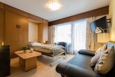 Sperates Wohnschlafzimmer mit 2 Wandklappbetten à 90x200cm und Satelliten-TV. Seperate Doppelschlafzimmer mit 1 Doppelbett 180x200cm und Waschbecken. Badezimmer mit Dusche/WC.