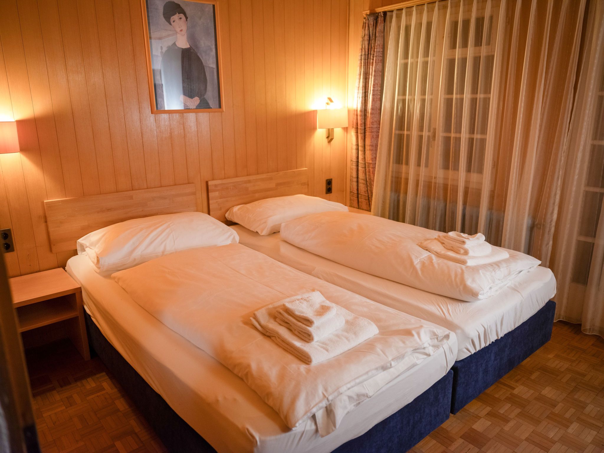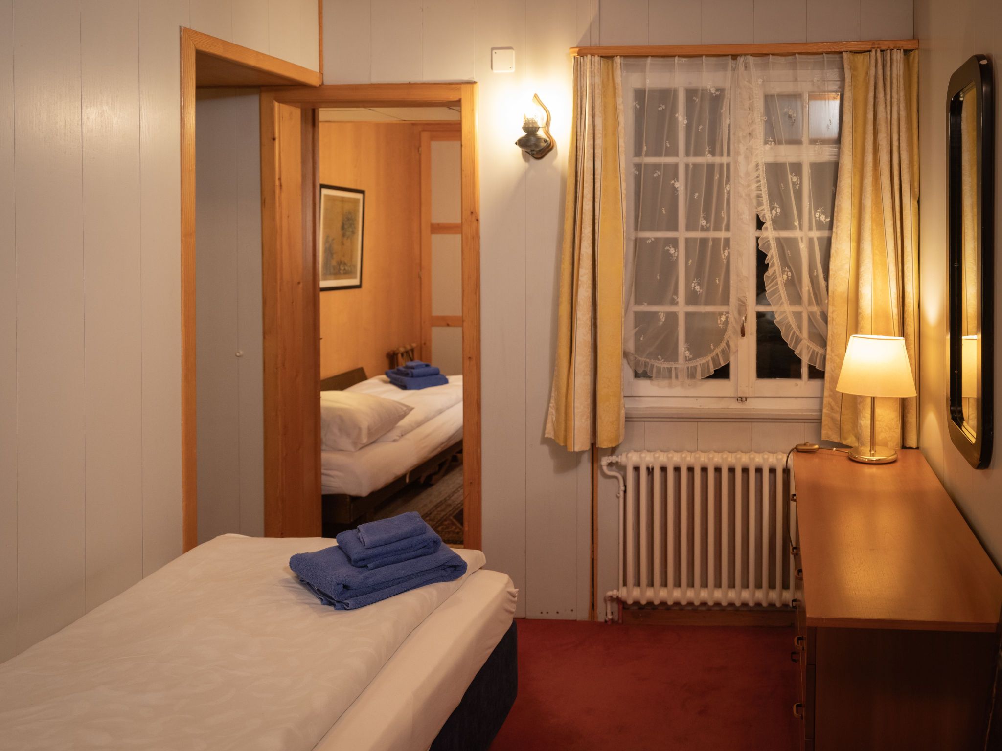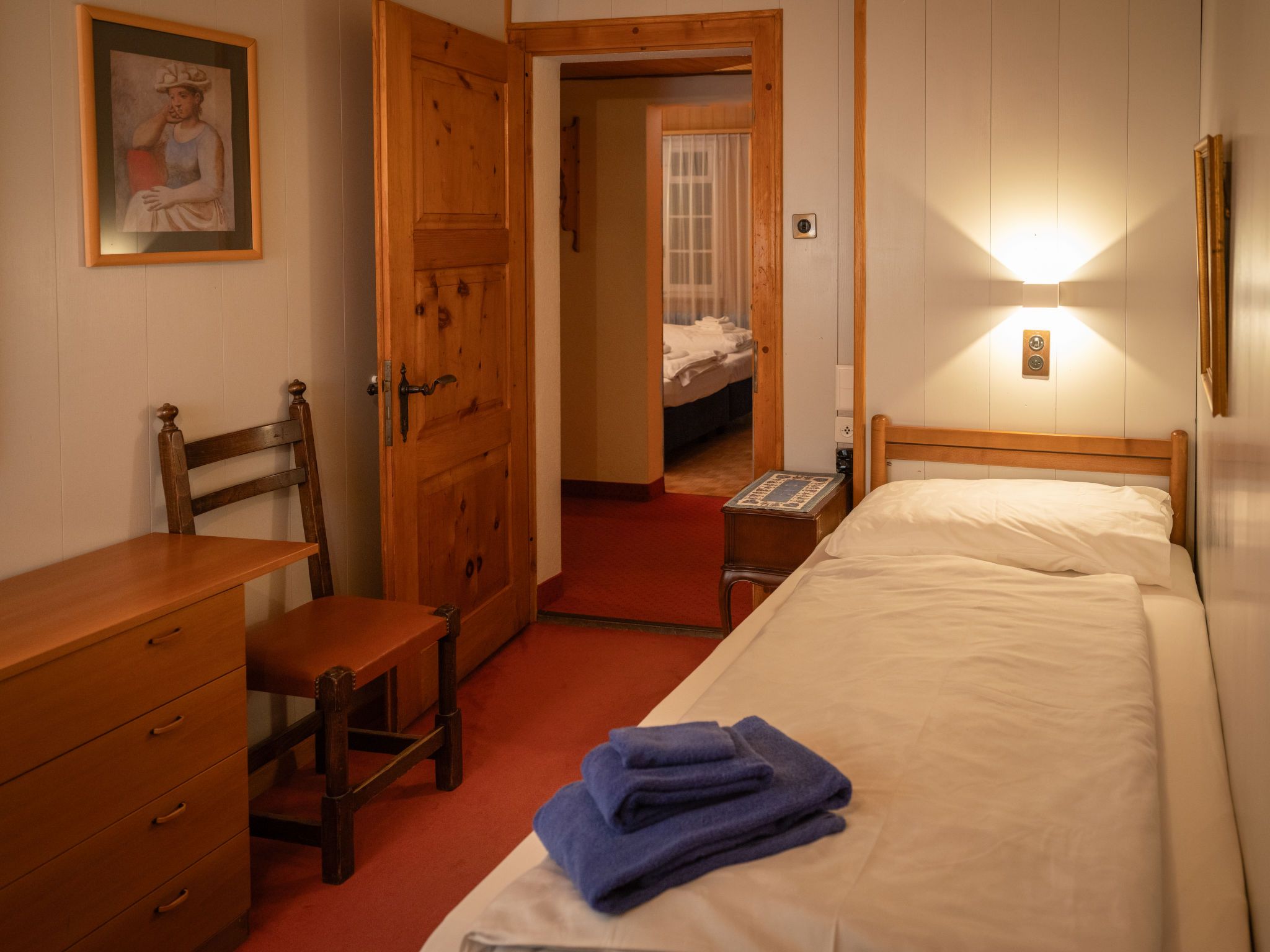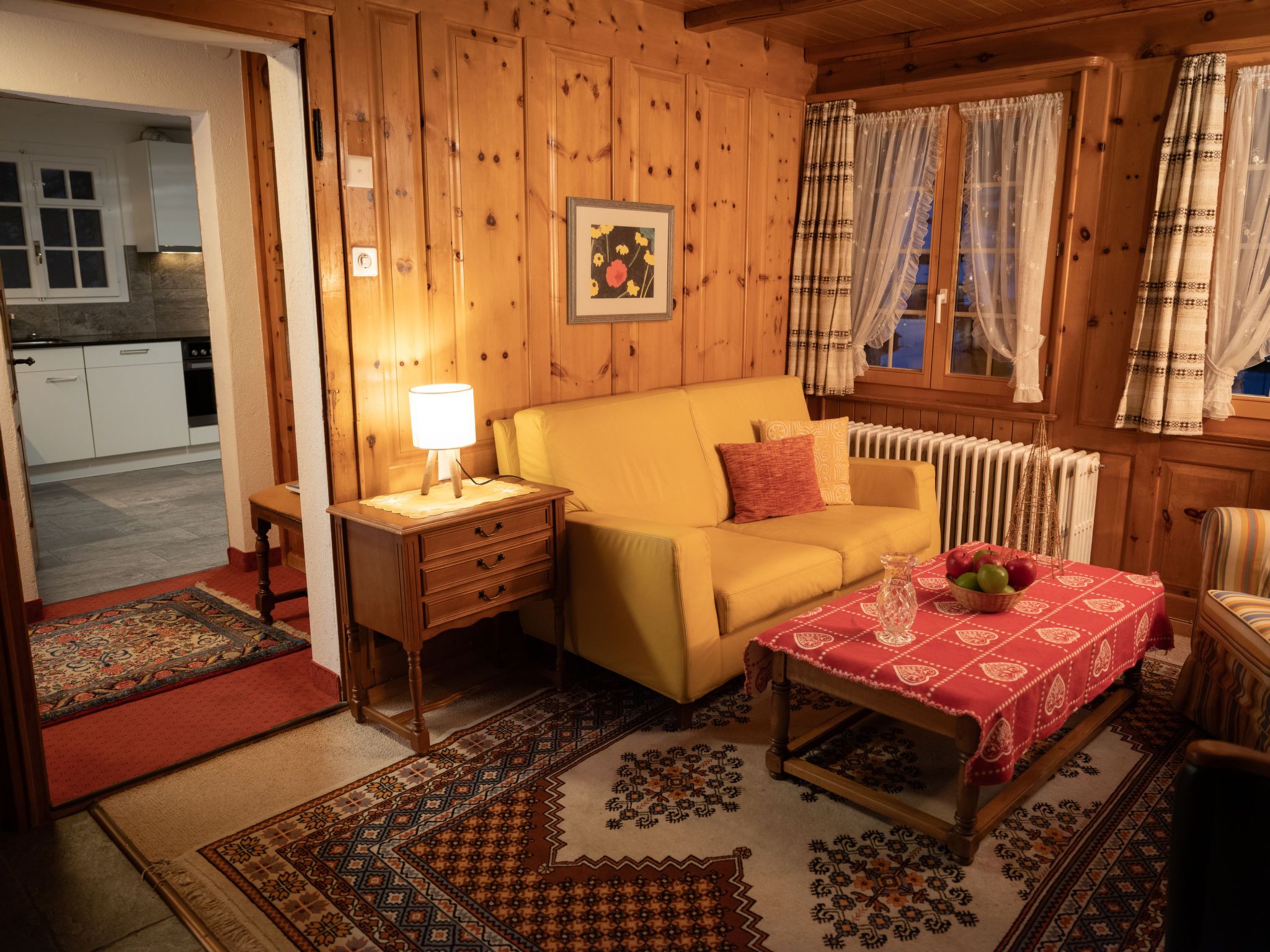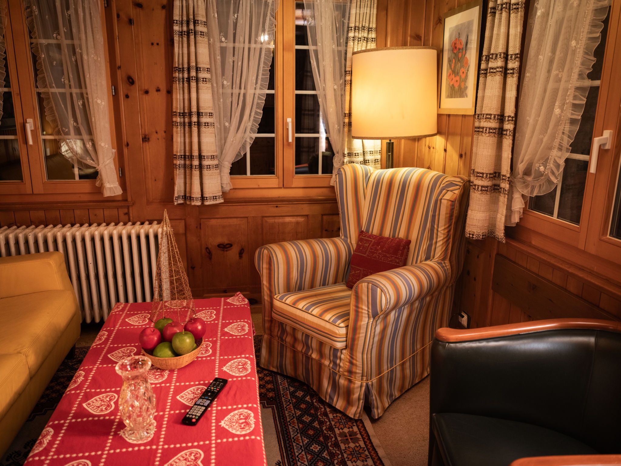Chalet Turquino / Apartment Marmotte, 4-Zimmer-Wohnung 90 m2, im Erdgeschoss, Südostlage. Objekt geeignet für 4 Erwachsene + 1 Kind. Einfach und gemütlich eingerichtet: Wohnzimmer mit offenem Kamin (nur Deko), TV. Ausgang zum Balkon, Richtung Osten und Richtung Süden. 1 Zimmer mit 2 Betten (90 cm, Länge 200 cm), Waschbecken. Durchgangszimmer mit 1 Bett (90 cm, Länge 200 cm), Bad/WC. 1 Zimmer mit 1 Bett (90 cm, Länge 200 cm). 1 Zimmer mit 1 Bett (90 cm, Länge 200 cm). Küche (Backofen, Geschirrspüler, 4 Glaskeramikplatten, Mikrowelle, Tiefkühler, elektrische Kaffeemaschine). Bad/WC, sep. WC. Heizung. Balkon, Ostlage und Südlage. Seitliche Sicht auf die Berge. Zur Verfügung: Internet (Wireless LAN). Bitte beachten: Nichtraucher-Unterkunft.