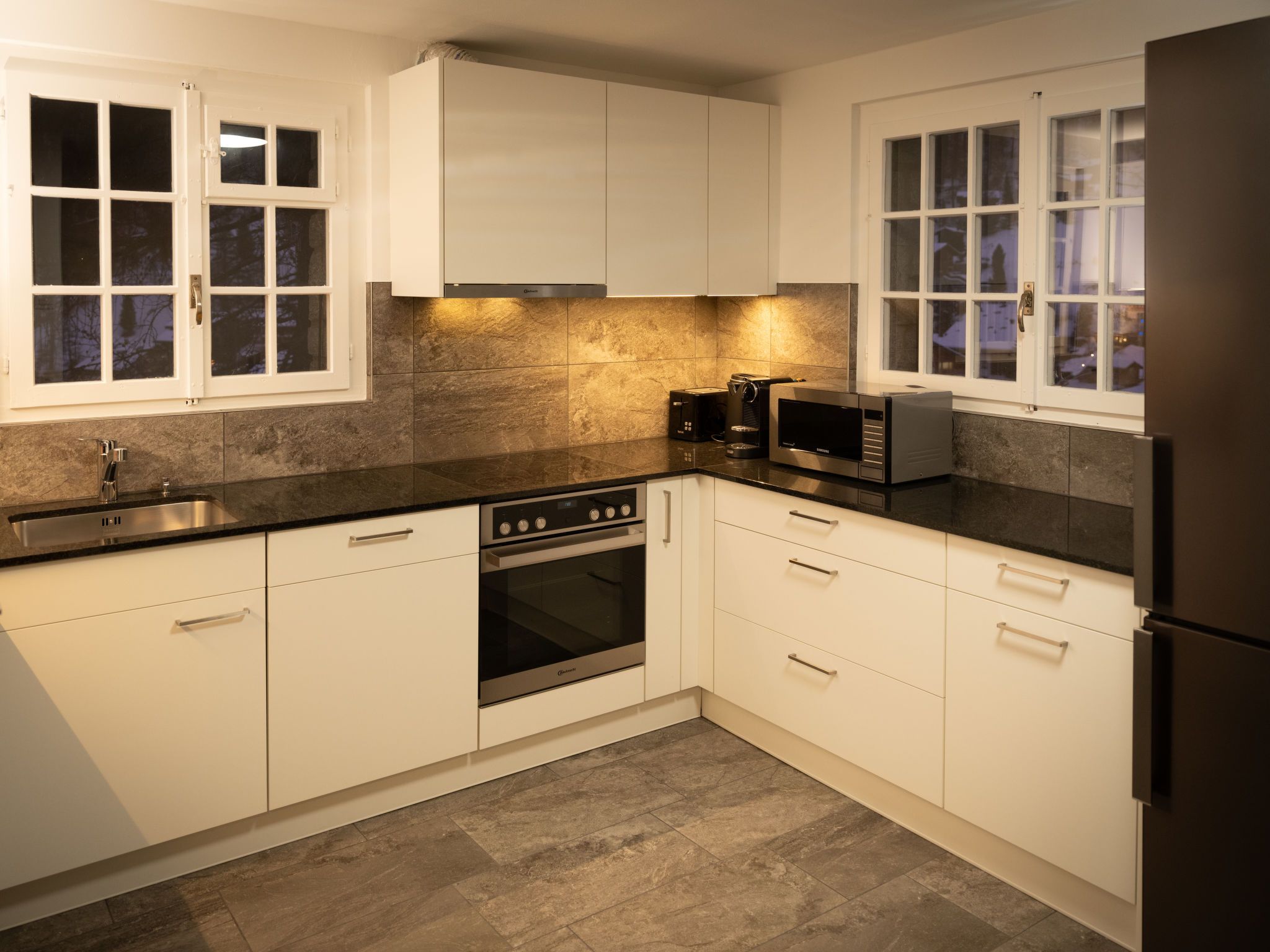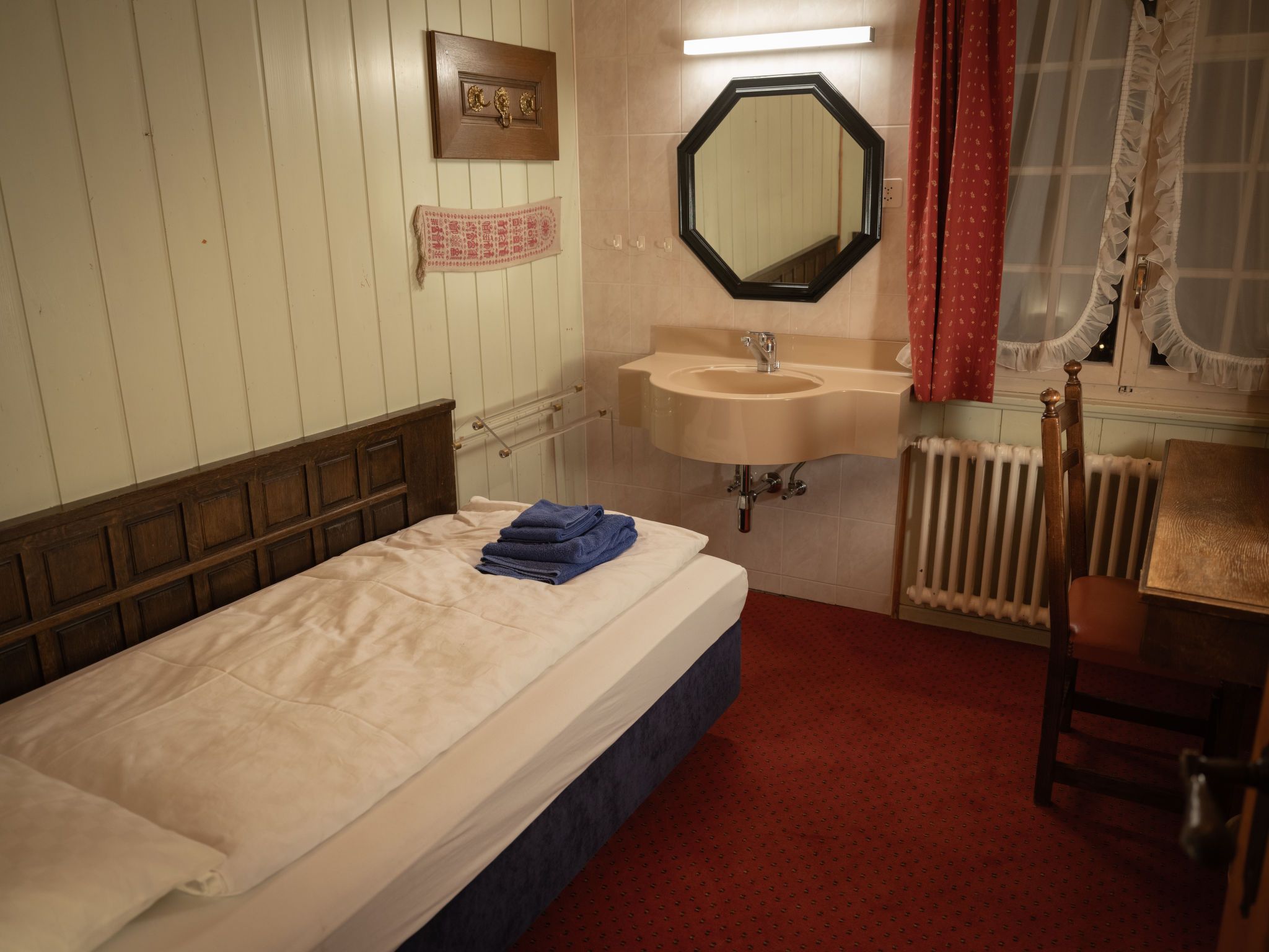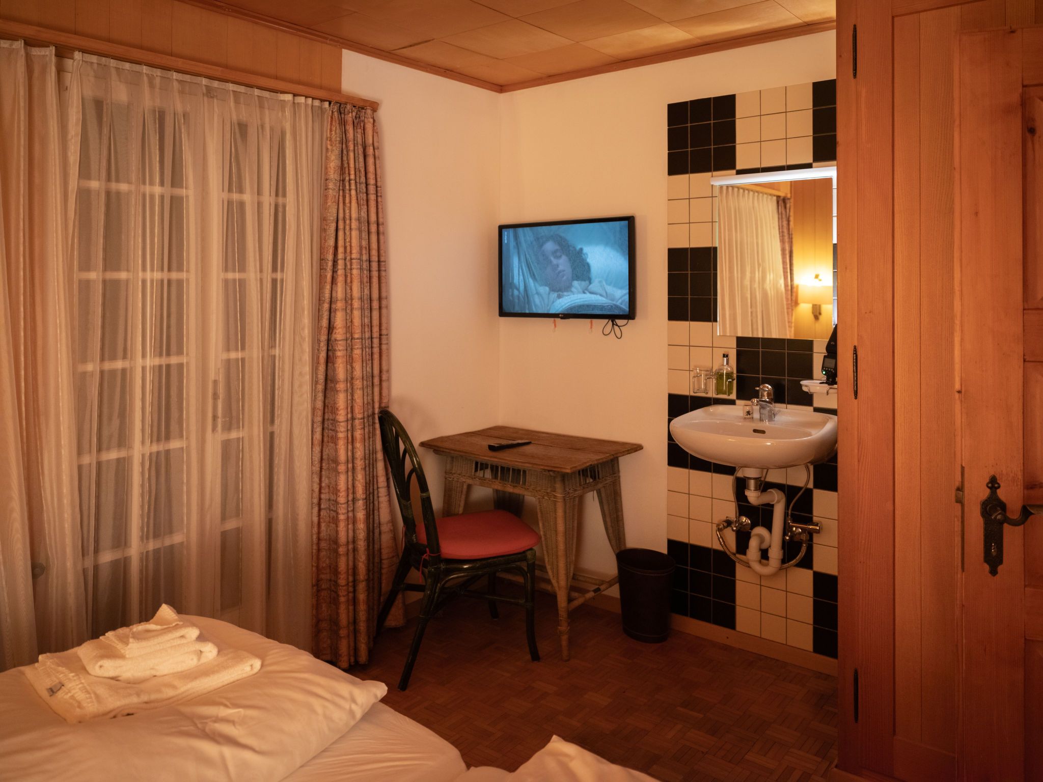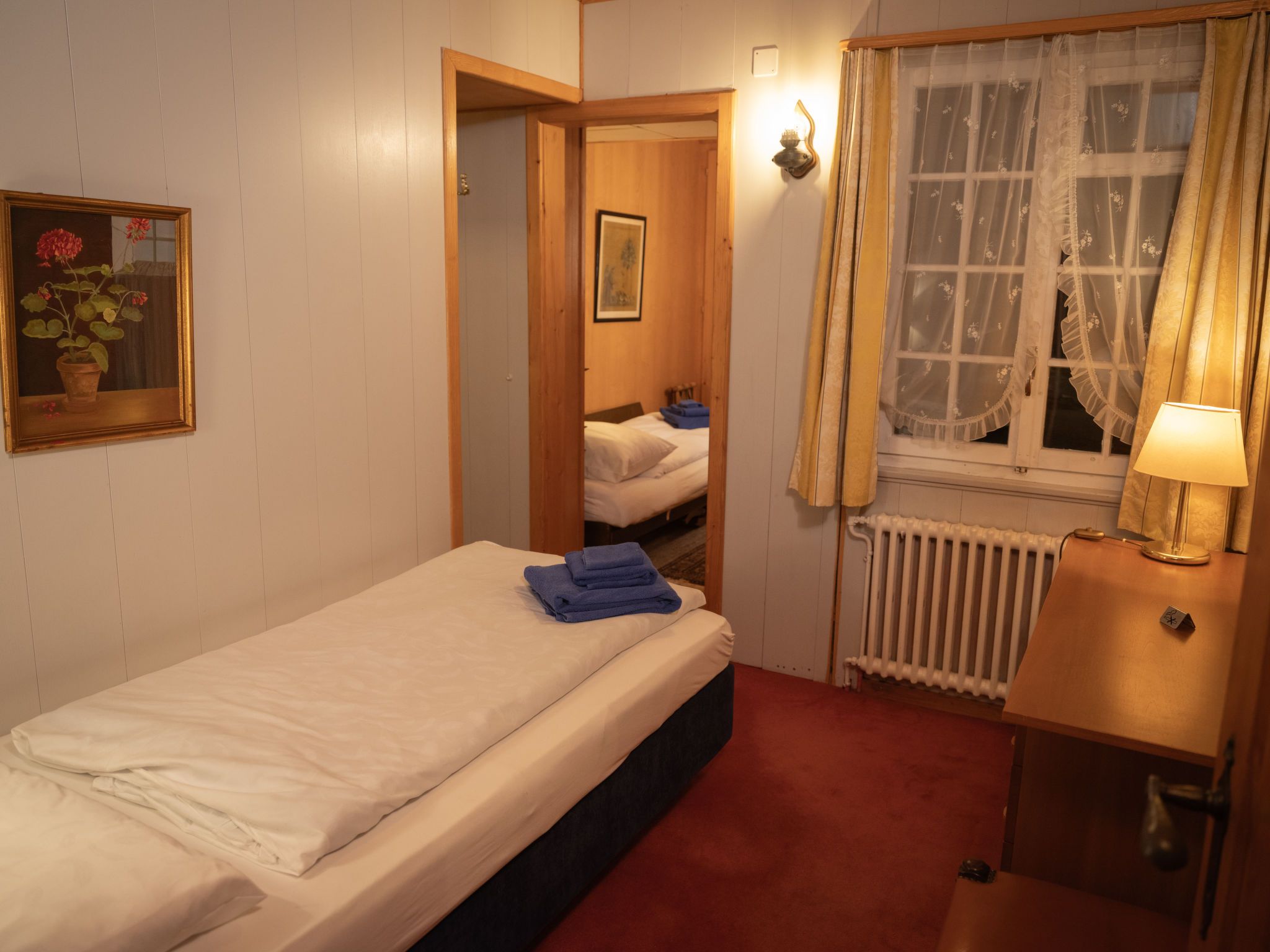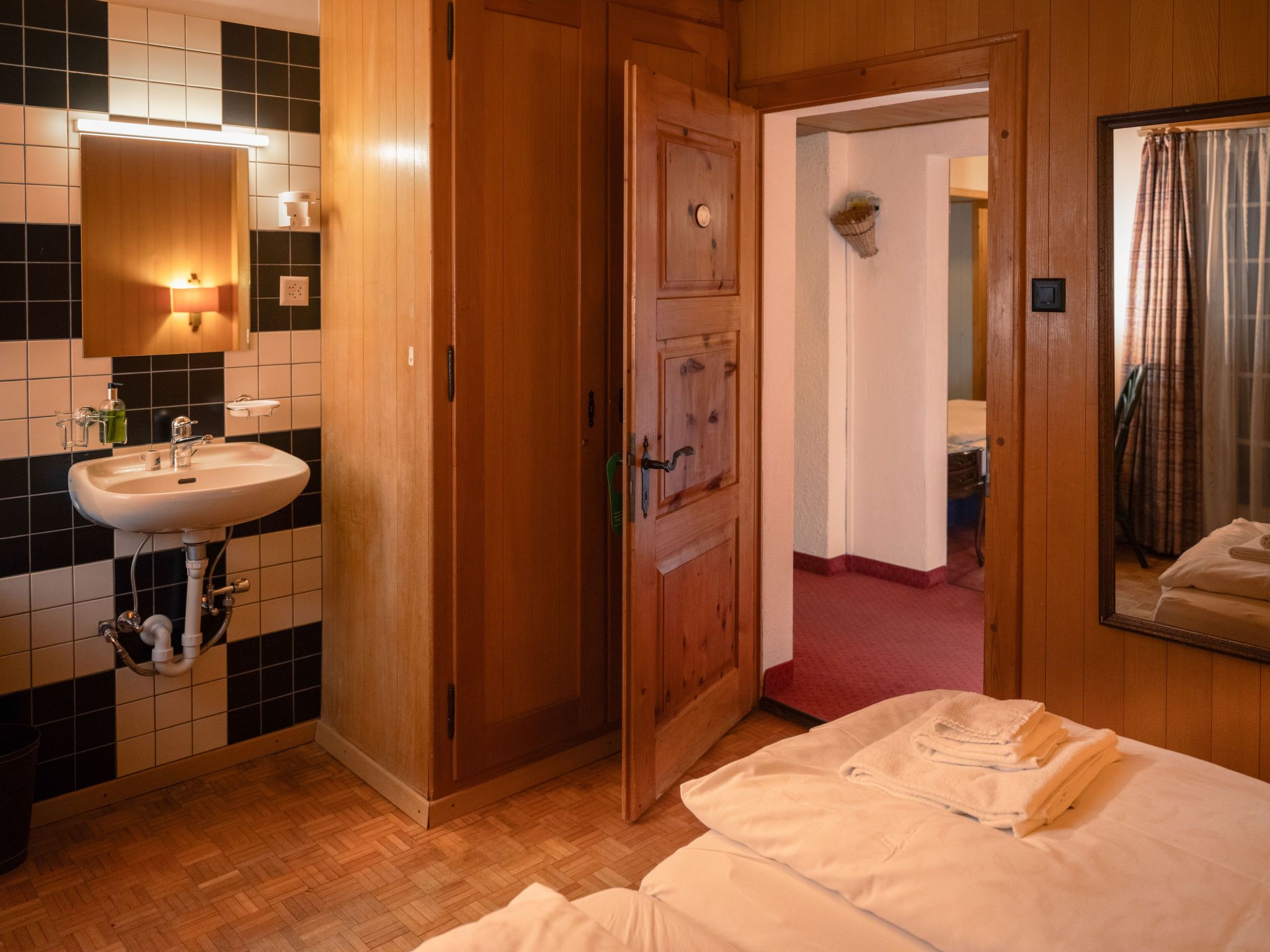 Chalet Turquino / Apartment Marmotte, 4-Zimmer-Wohnung 90 m2, im Erdgeschoss, Südostlage. Objekt geeignet für 4 Erwachsene + 1 Kind. Einfach und gemütlich eingerichtet: Wohnzimmer mit offenem Kamin (nur Deko), TV. Ausgang zum Balkon, Richtung Osten und Richtung Süden. 1 Zimmer mit 2 Betten (90 cm, Länge 200 cm), Waschbecken. Durchgangszimmer mit 1 Bett (90 cm, Länge 200 cm), Bad/WC. 1 Zimmer mit 1 Bett (90 cm, Länge 200 cm). 1 Zimmer mit 1 Bett (90 cm, Länge 200 cm). Küche (Backofen, Geschirrspüler, 4 Glaskeramikplatten, Mikrowelle, Tiefkühler, elektrische Kaffeemaschine). Bad/WC, sep. WC. Heizung. Balkon, Ostlage und Südlage. Seitliche Sicht auf die Berge. Zur Verfügung: Internet (Wireless LAN). Bitte beachten: Nichtraucher-Unterkunft.