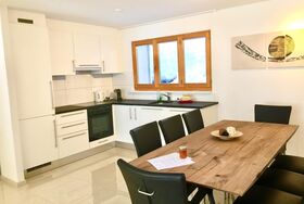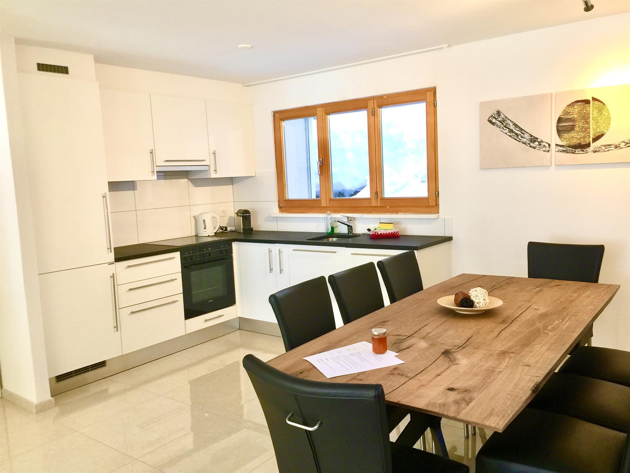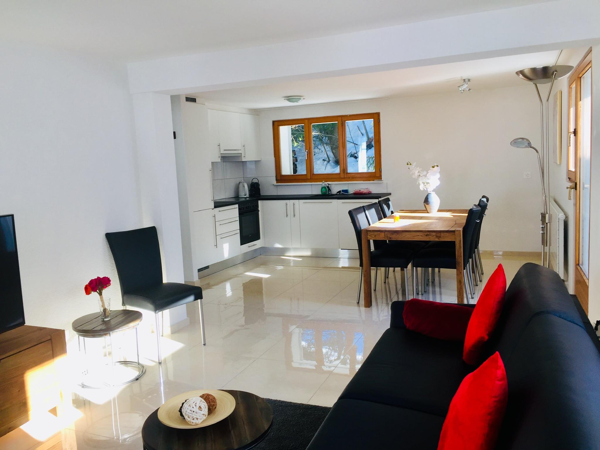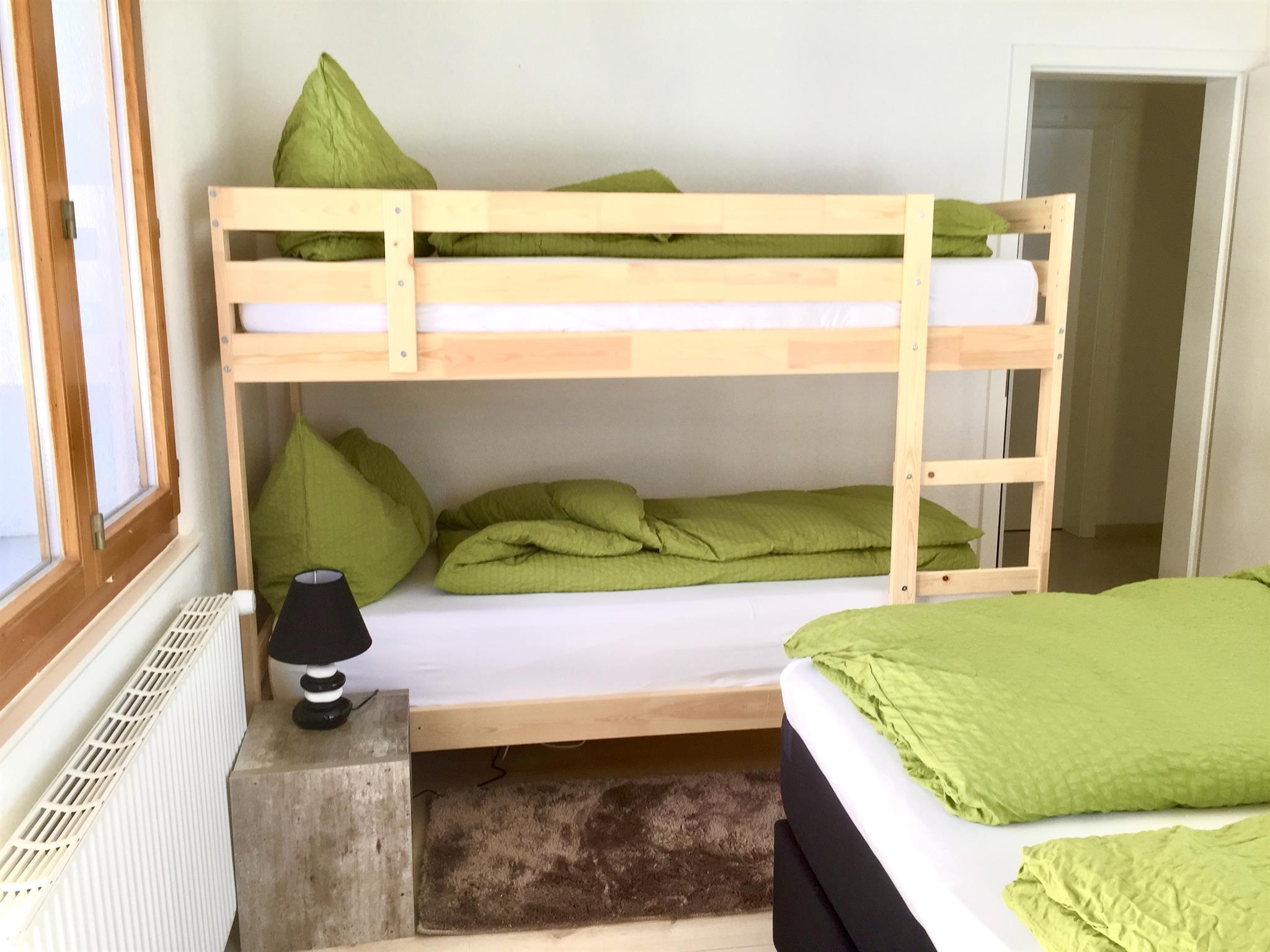 3-Zimmerwohnung: Wohnzimmer mit Doppel-Schlafsofa (160x2m), TV, Radio, gratis WiFi, moderne Wohnküche mit Esstisch, Geschirrspüler und Nespresso-Kaffeemaschine, 1 Schlafzimmer mit 1 Doppelbett, 1 Schlafzimmer mit 1 Doppelbett und 1 Etagenbett, Dusche/WC, Süd-Balkon. Aussenparkplatz ist direkt beim Vermieter zu mieten. Nichtraucherwohnung.