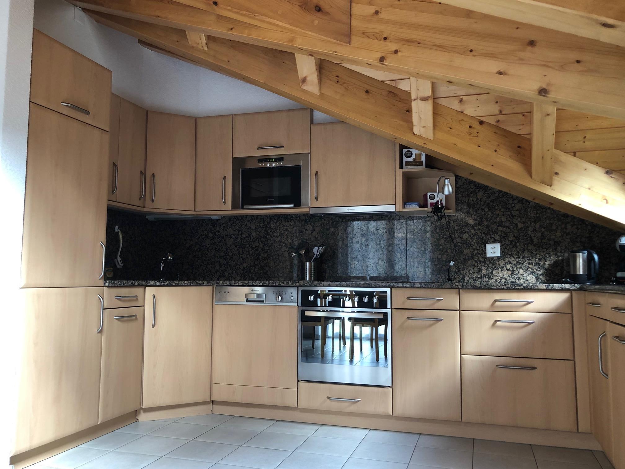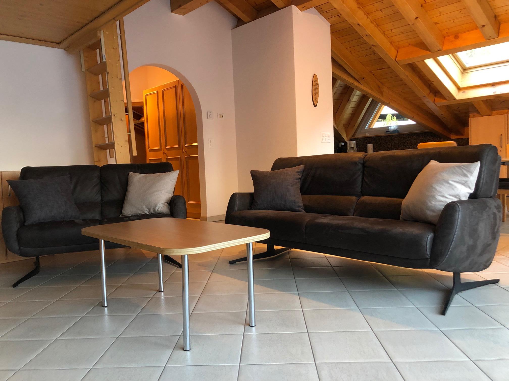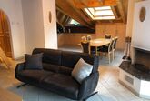 Luxuriöse 3-Zimmer-Attika-Dachwohnung: Wohnzimmer mit Cheminée, gratis WiFi, TV, Radio, DVD/CD-Player, offene Küche mit Geschirrspüler und Mikrowelle, 1 Doppelschlafzimmer mit Bad/WC, Waschmaschine und Tumbler, 1 Zweibettzimmer, 1 Gallerie mit 2 Betten, Dusche/WC, Südbalkon. Garage im Haus inklusive. Nichtraucherwohnung. Haustiere erlaubt.