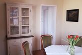 In der ersten Etage gelangt man über den Vorraum mit der Garderobe in ein gemütliches Speisezimmer, das über einen offenen Durchgang mit dem Wohnzimmer (TV, Sitzgarnitur) verbunden ist.
