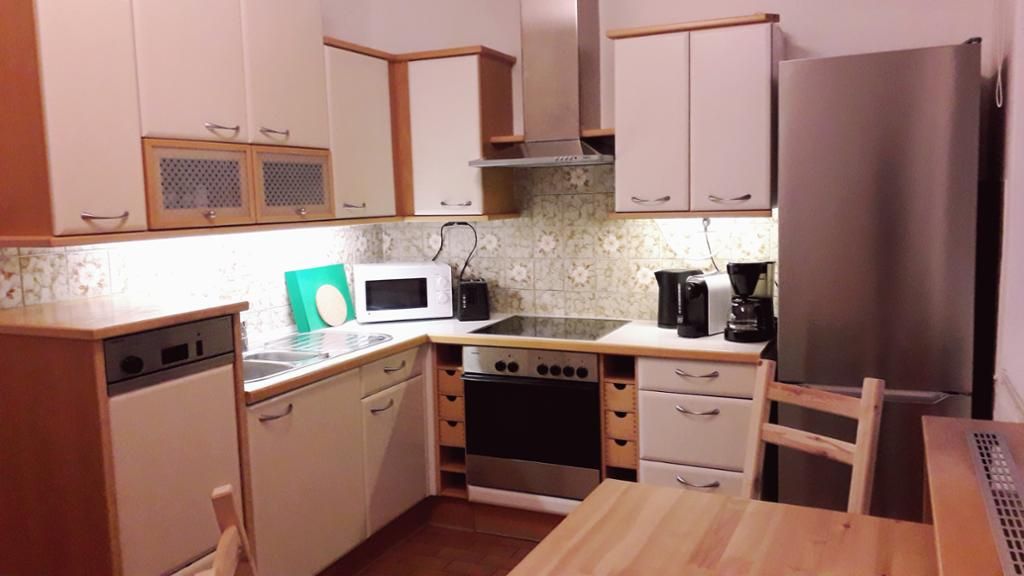 Gleich gegenüber liegt die gut ausgestattete Küche (Herd mit Backofen und Ceranfeld, Kühlschrank, Geschirrspüler, Mikrowelle, Kaffeemaschinen, Wasserkocher, Mixer, Toaster) mit Tisch und Sitzmöglichkeit und einer kleinen Speis. Hervorzuheben ist, dass die Küche zusätzlich auch über einen alten Tischherd geheizt werden kann.