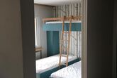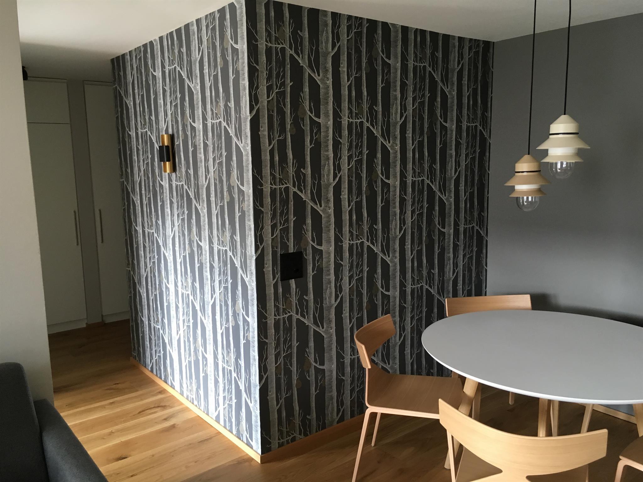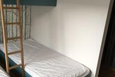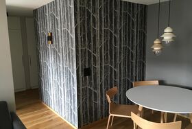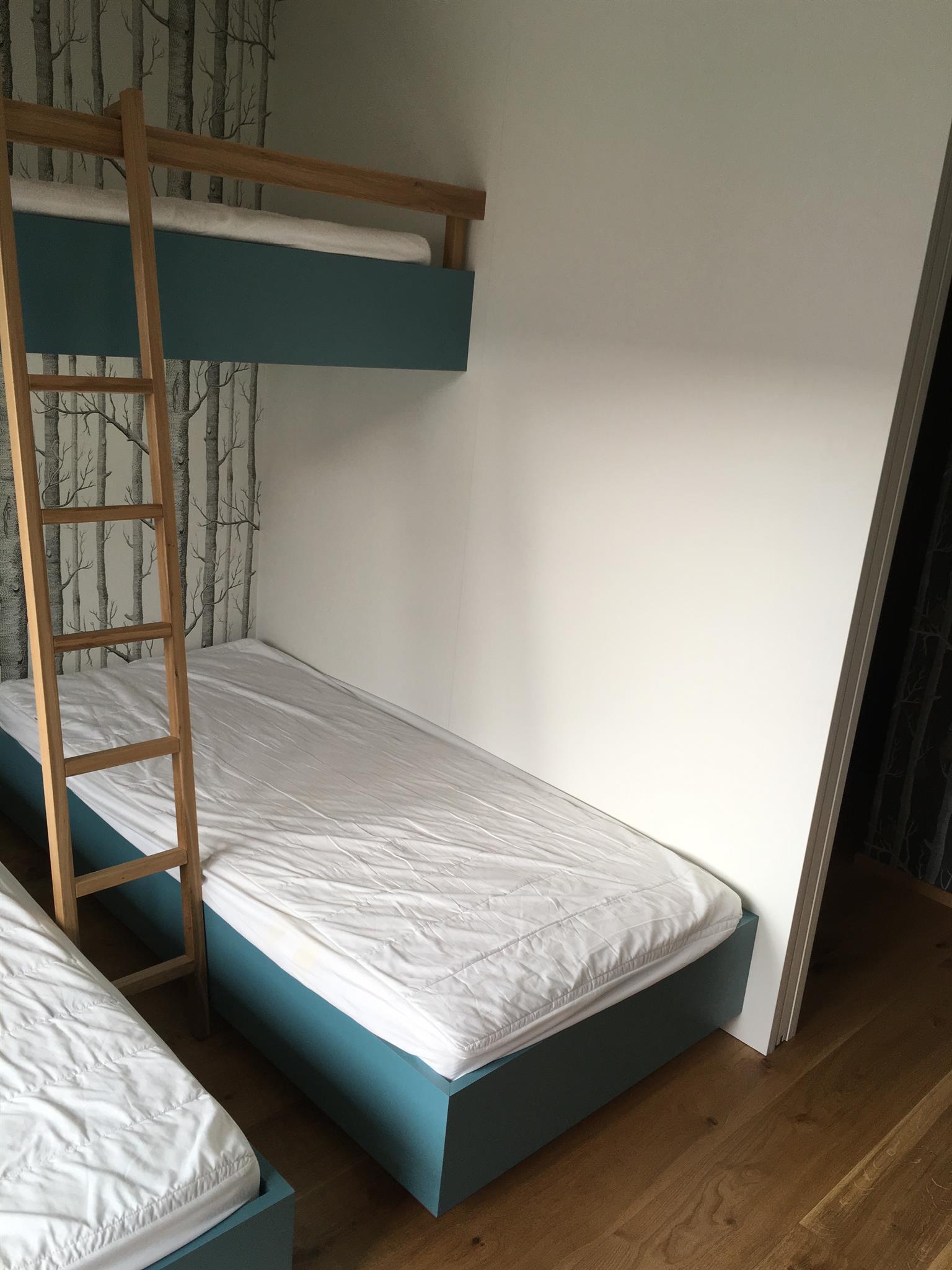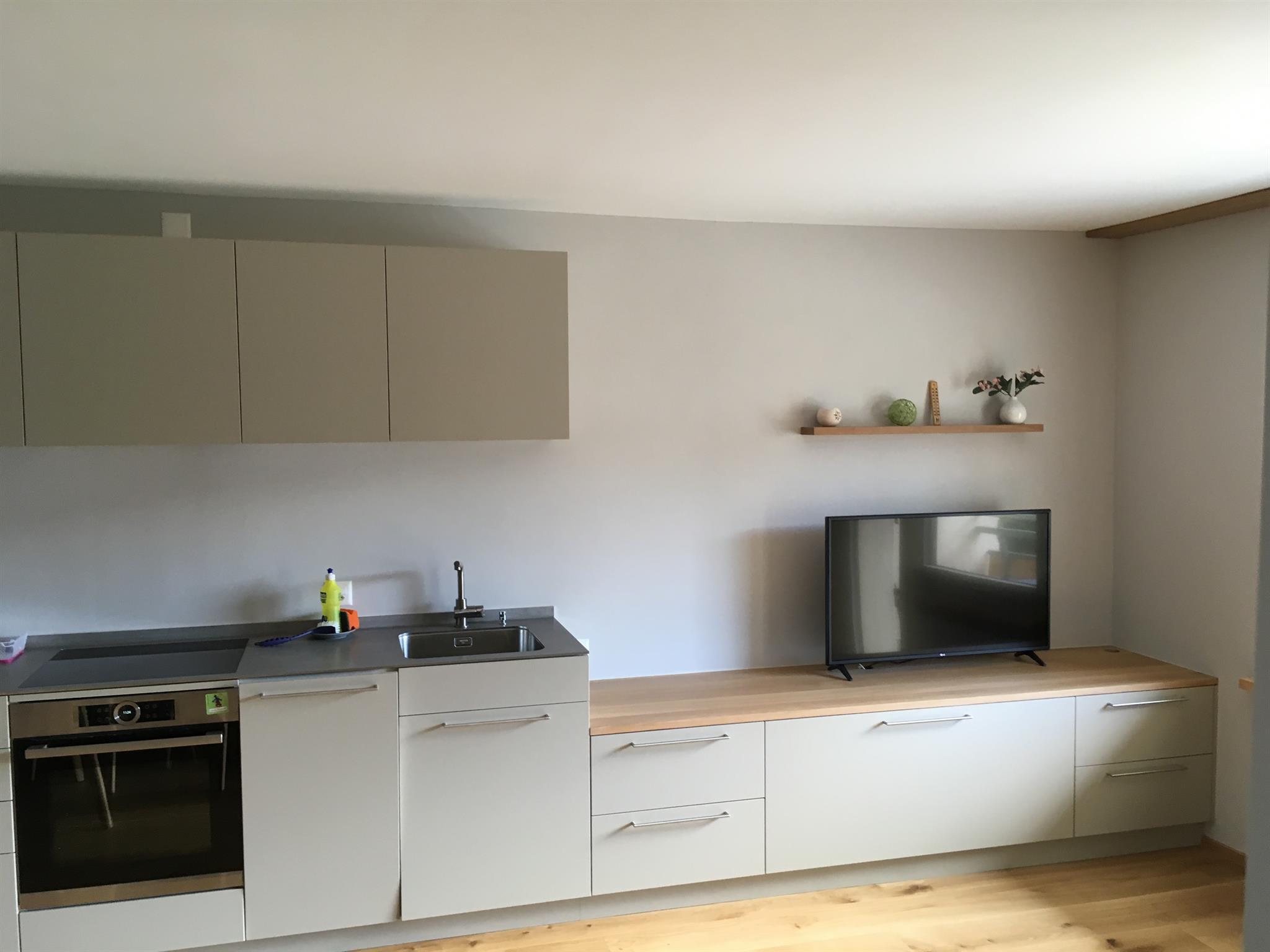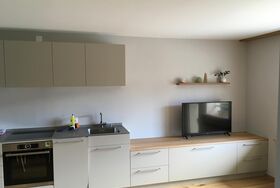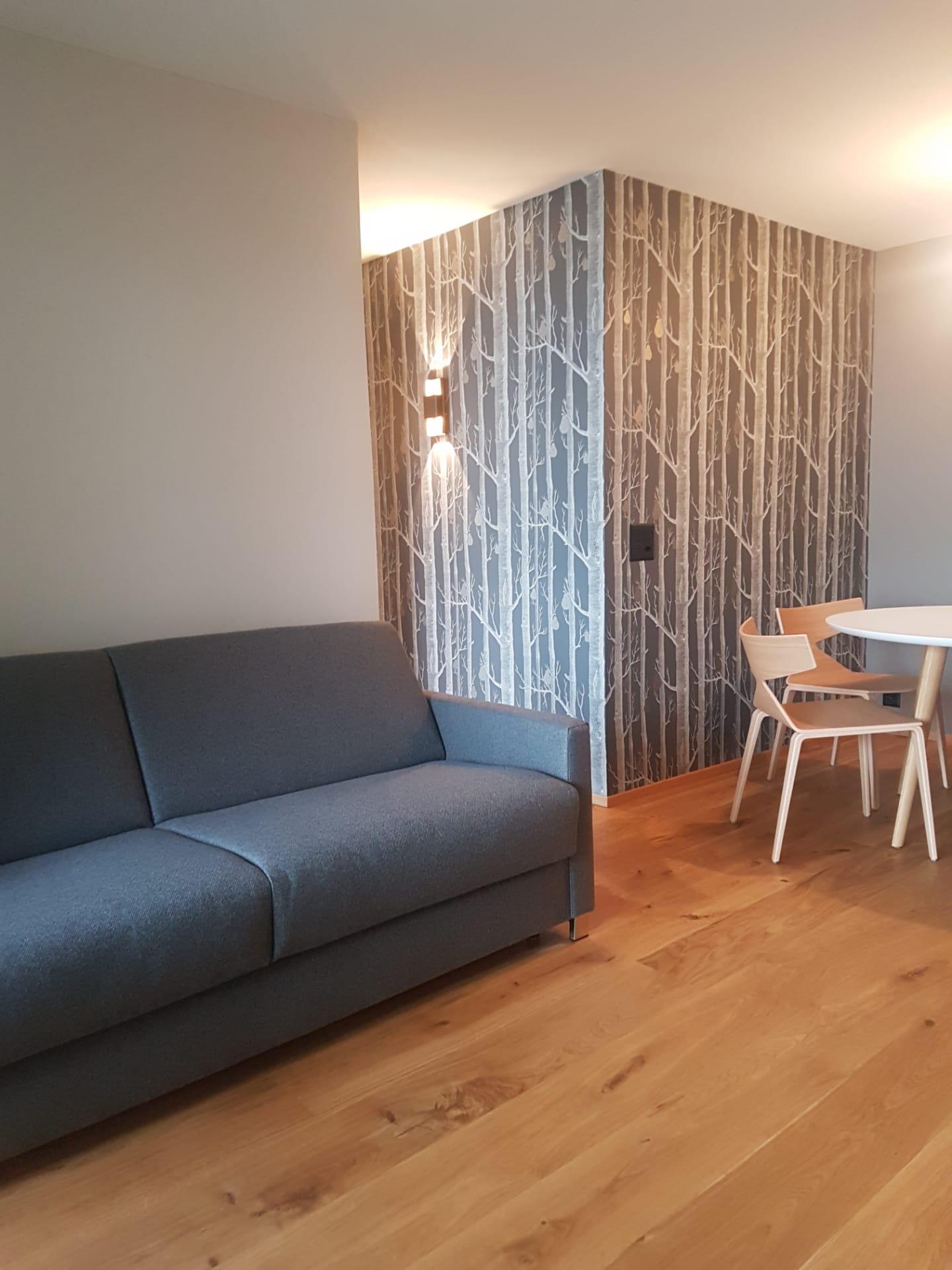 Offene Küche, Wohnzimmer mit Doppelschlafcouch. Schlafzimmer mit 3 Betten, 45 m2.
