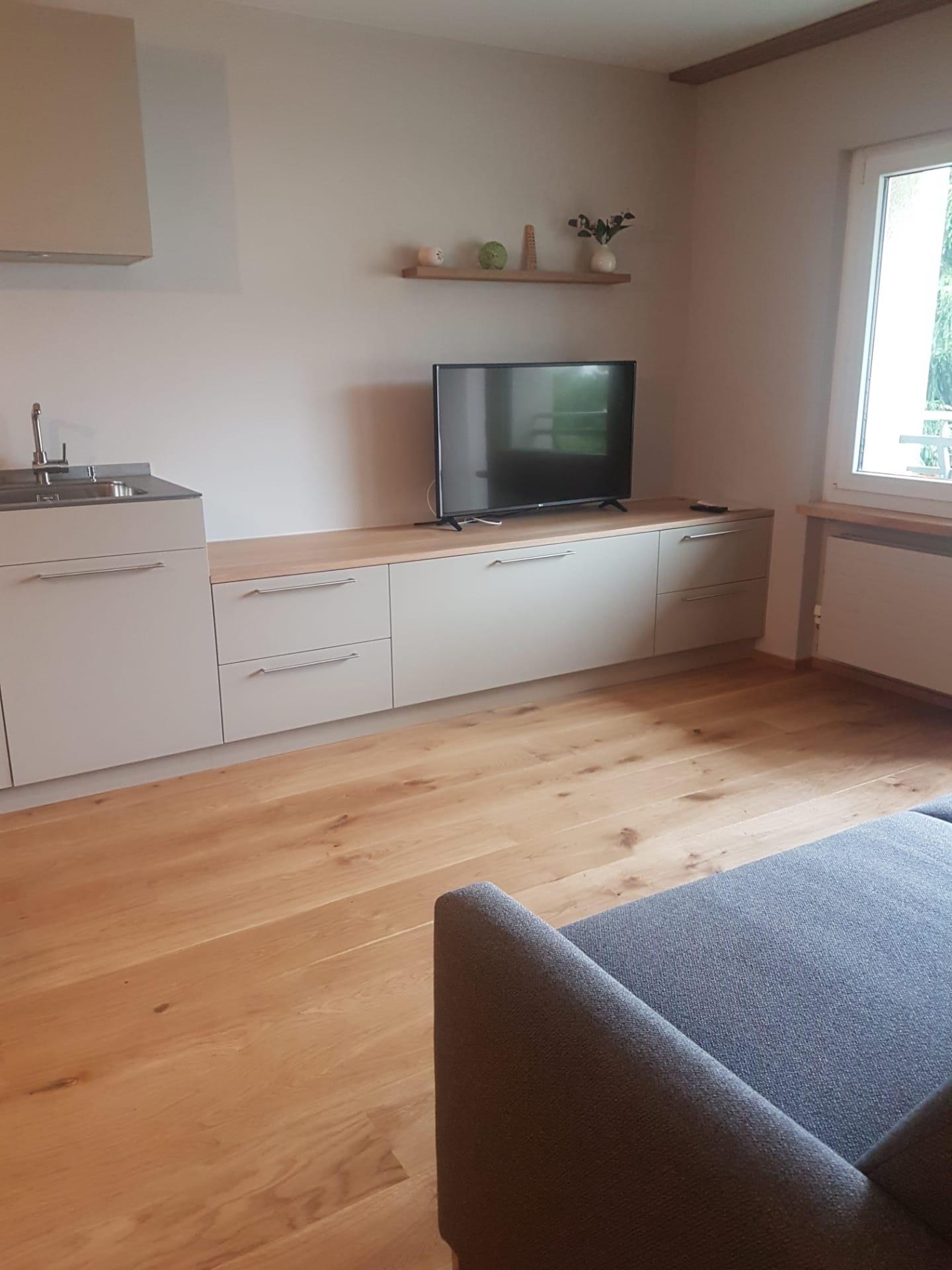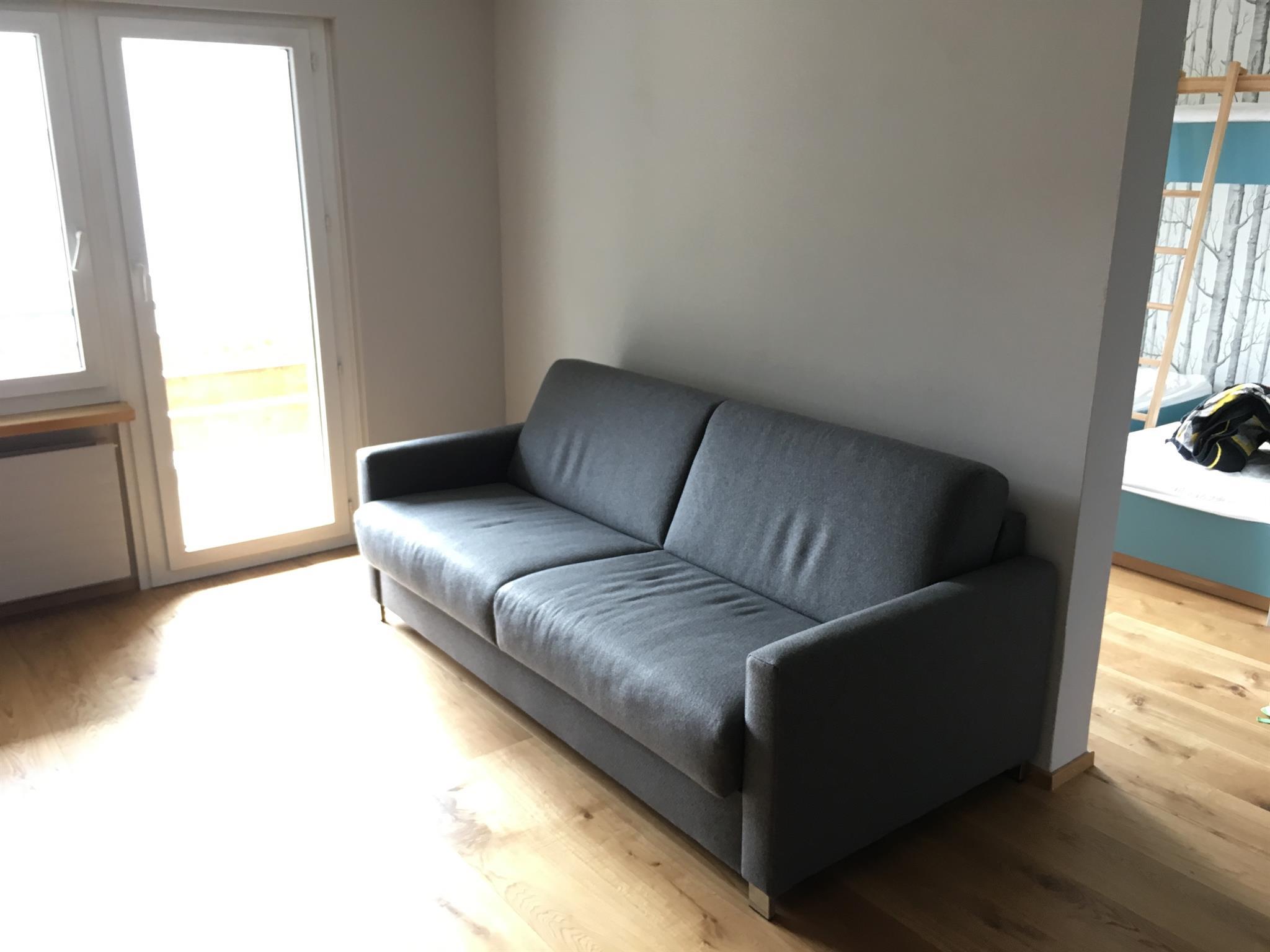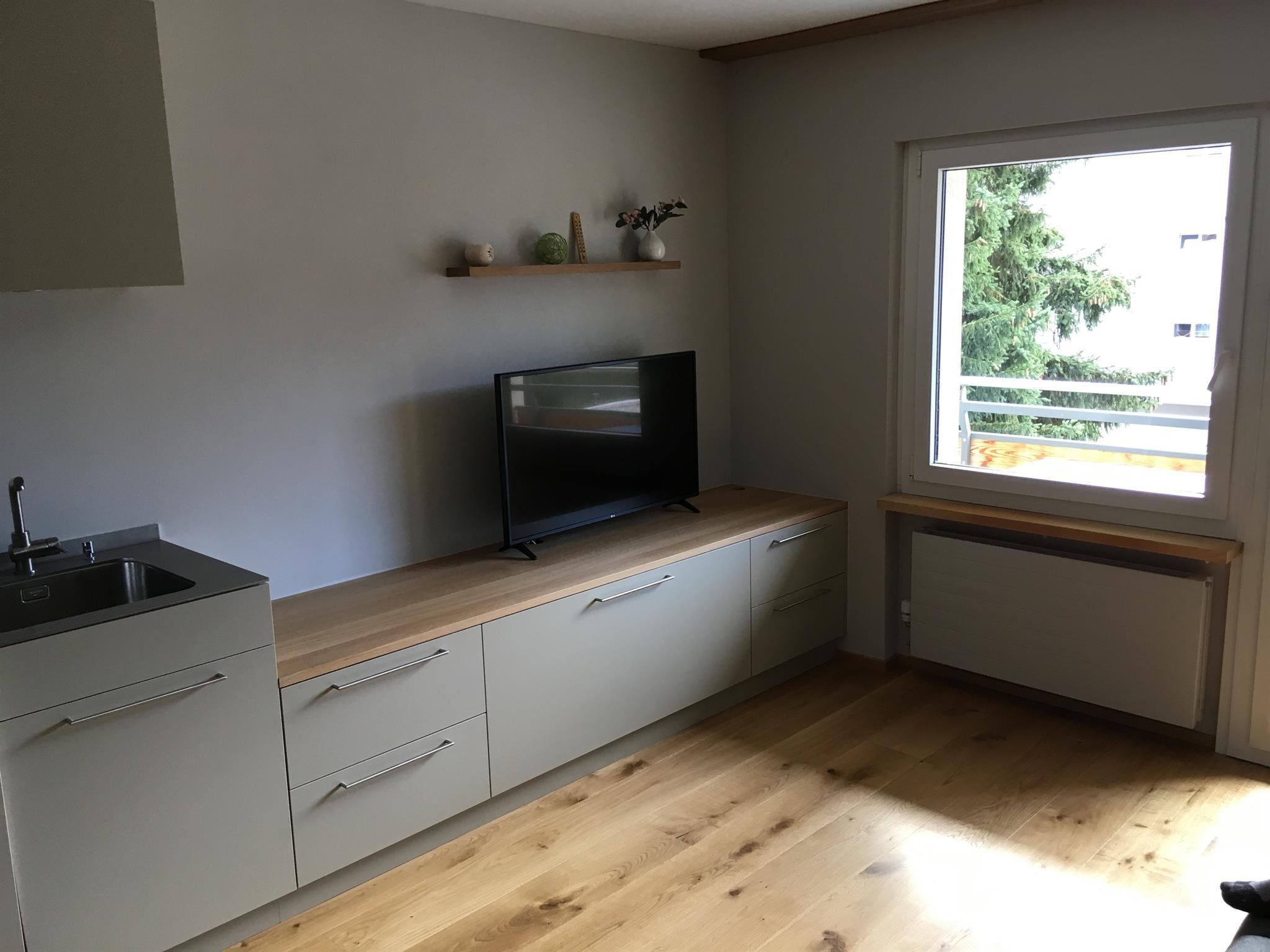 1.5 Zimmer Ferienwohnung in einem Mehrfamilienhaus im 2. Stock, direkt an der Sportbushaltestelle und neben dem Volg-Einkaufsladen.