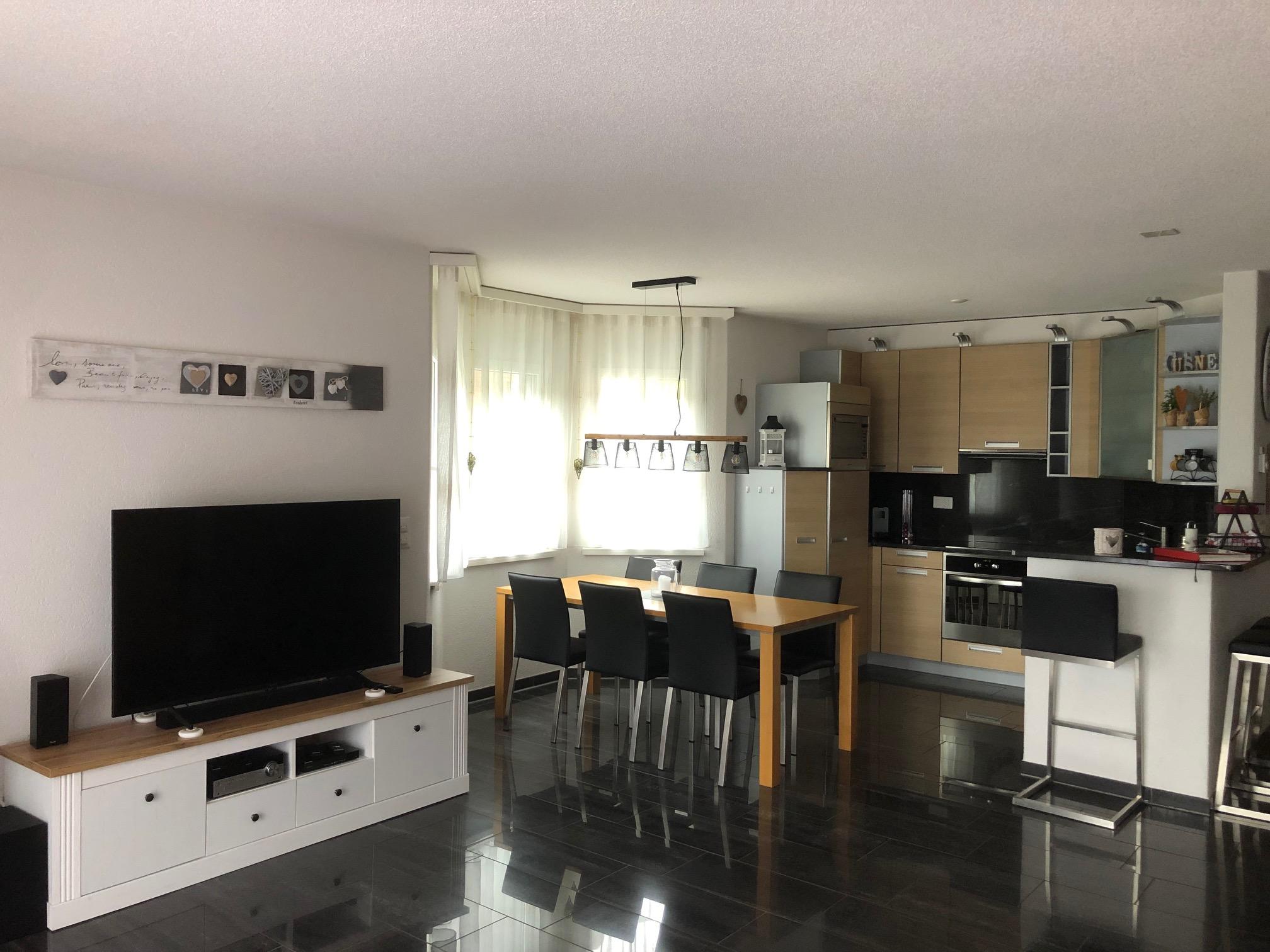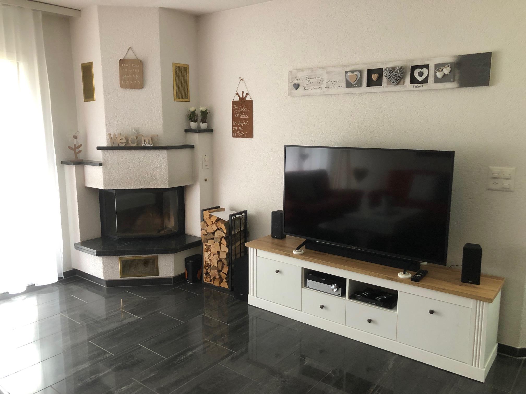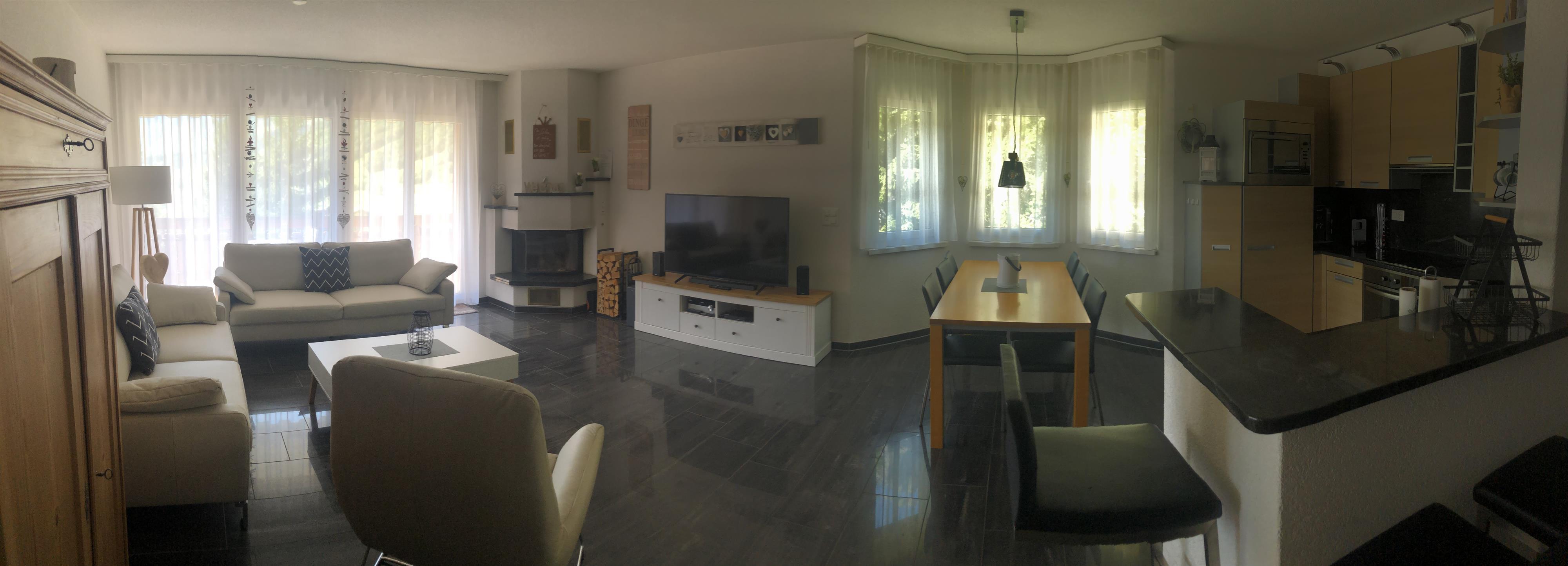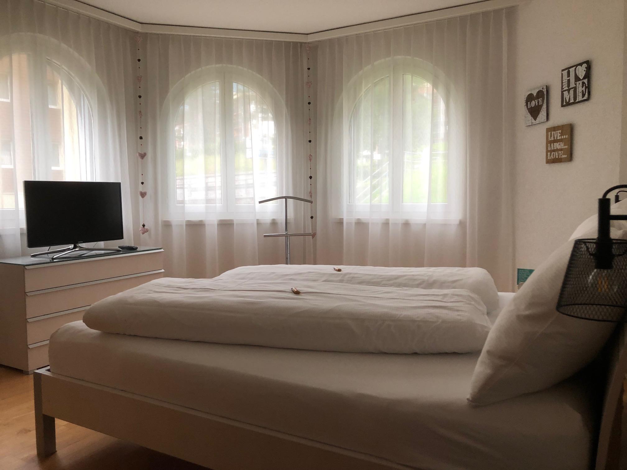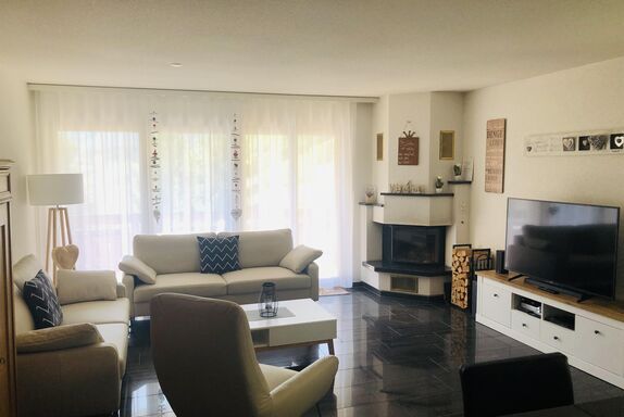Luxuriöse 3-Zimmerwohnung in Neubau: 1.Stock, offene moderne Wohnküche mit Bar, Wohnzimmer mit Cheminée, TV, DVD, Radio/CD, Home-Cinema, gratis WiFi, 2 Doppelschlafzimmer mit eigener Dusche/WC und eigenem TV, Südbalkon mit Panoramasicht, ruhige Lage, Lift, Ski- & Veloraum, Kinderspielplatz. Nähe: Torrentbahnen, Thermalbäder, Bushaltestelle, Dorfzentrum. Garage zu mieten im Haus. Nichtraucherwohnung. Keine Haustiere erlaubt!