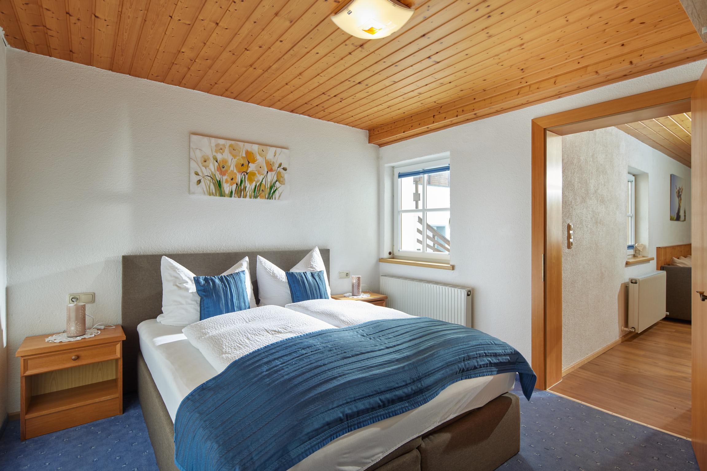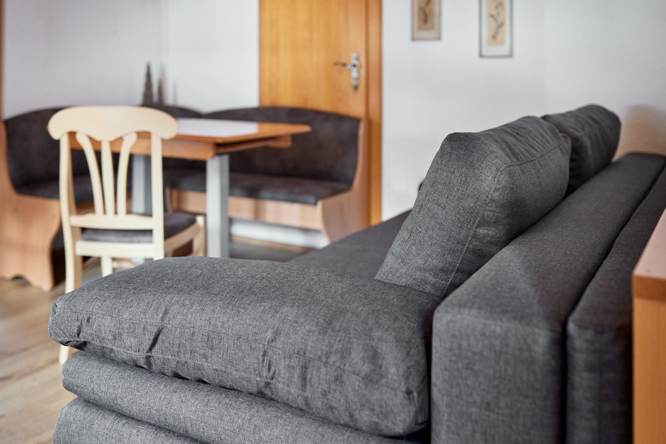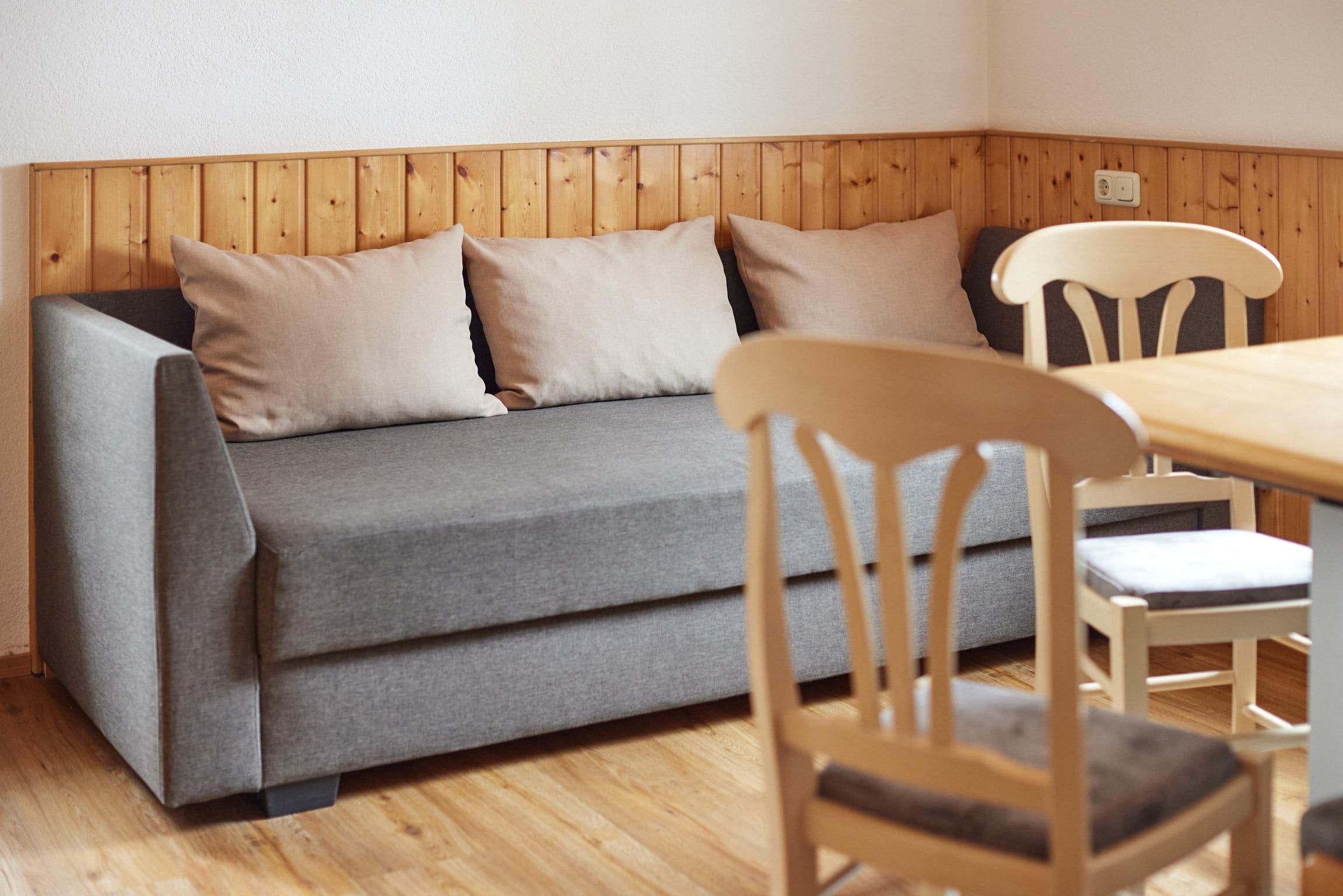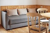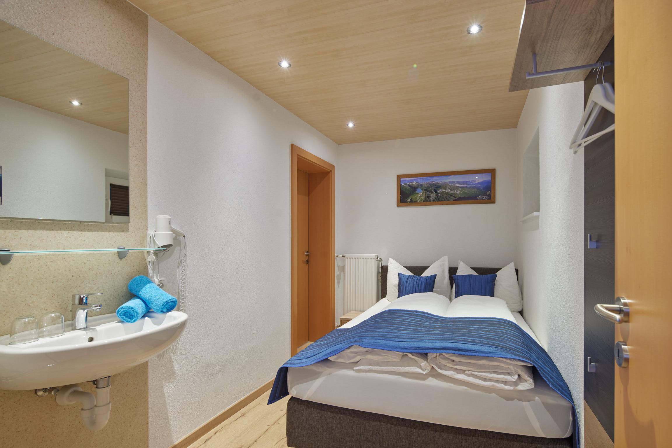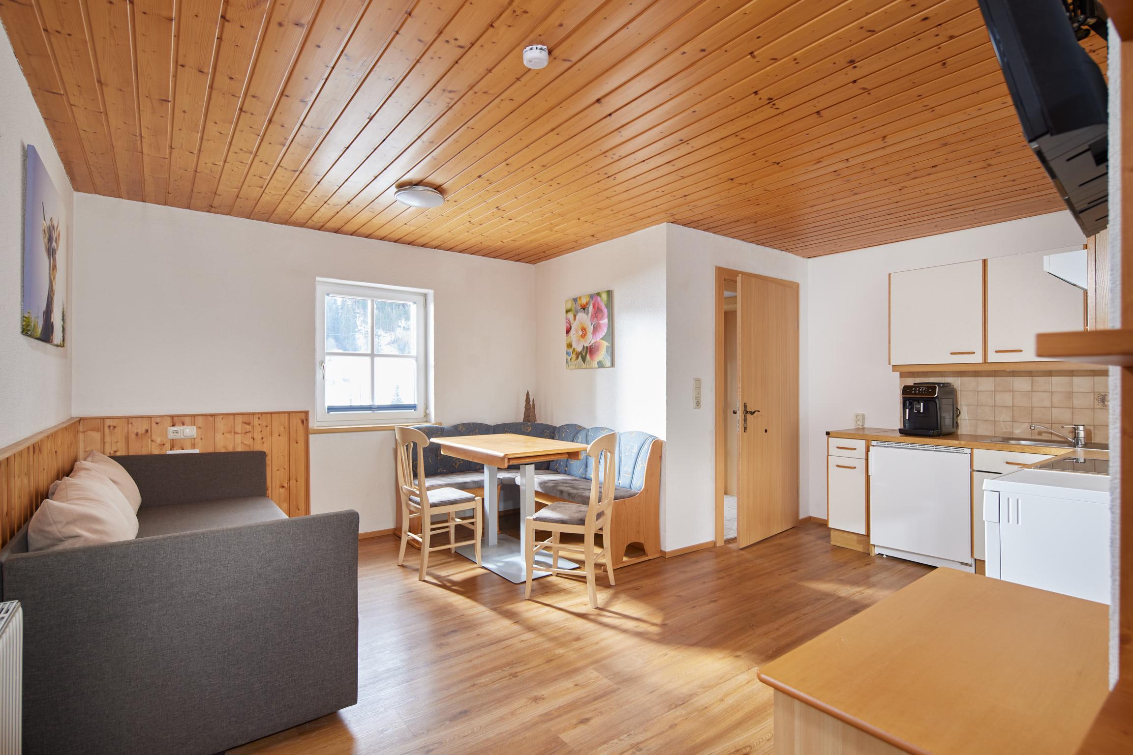 Wohnung Silvretta besteht aus einem Schlafzimmer mit Waschbecken und TV, einem Elternschlafzimmer, Wohnraum mit Couch, Eckbank, Küche, DU/WC (Seifenspender und Haartrockner).